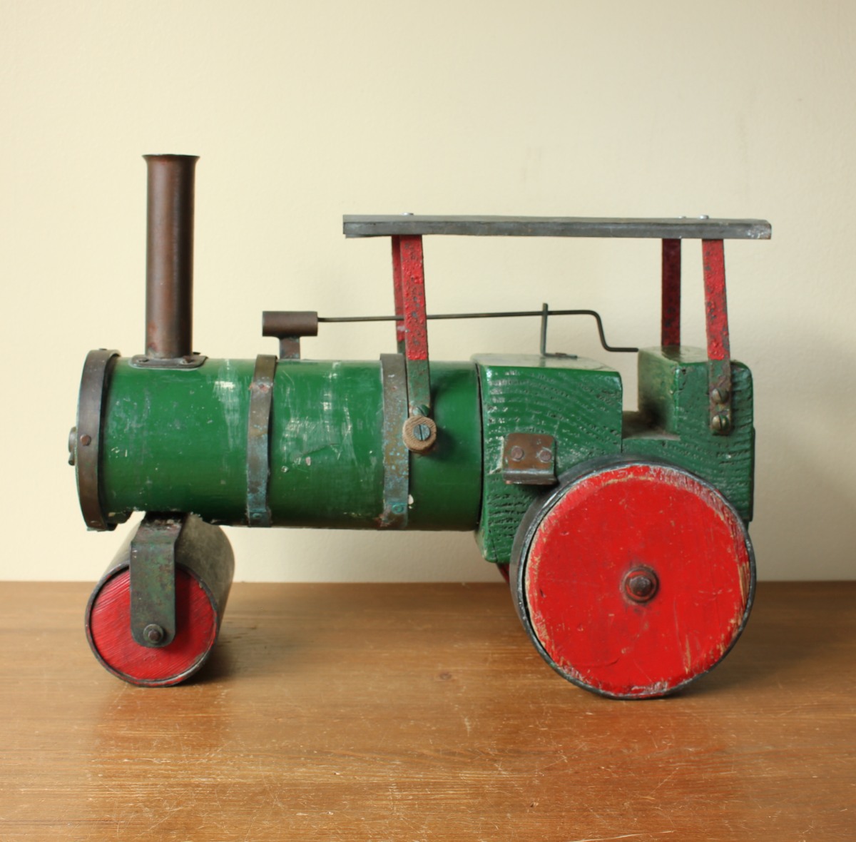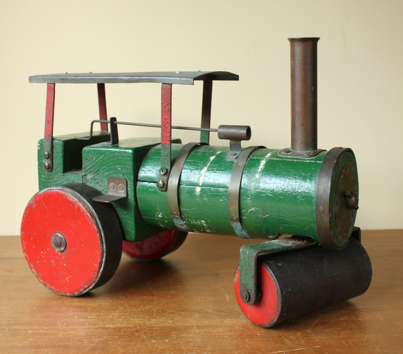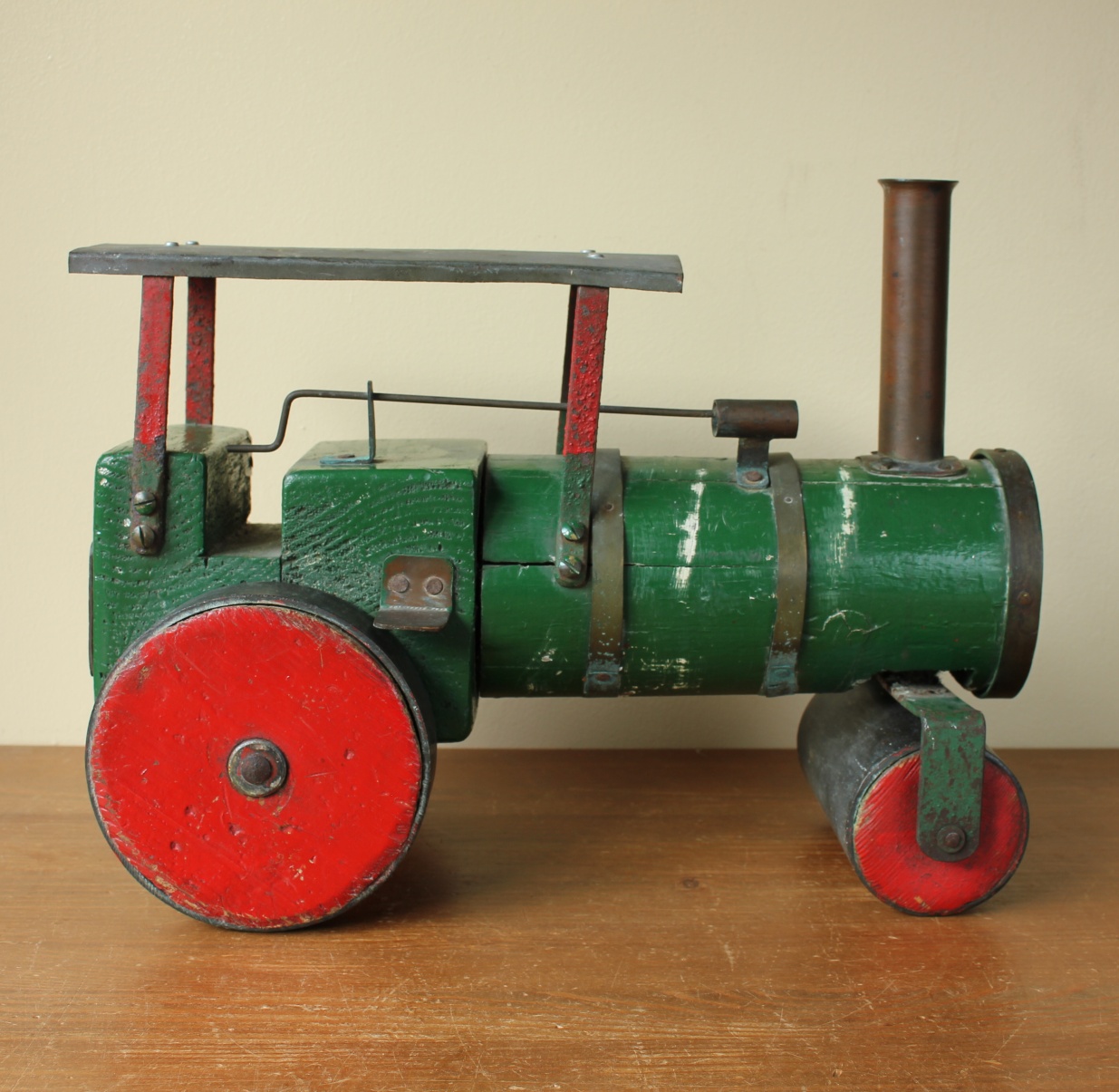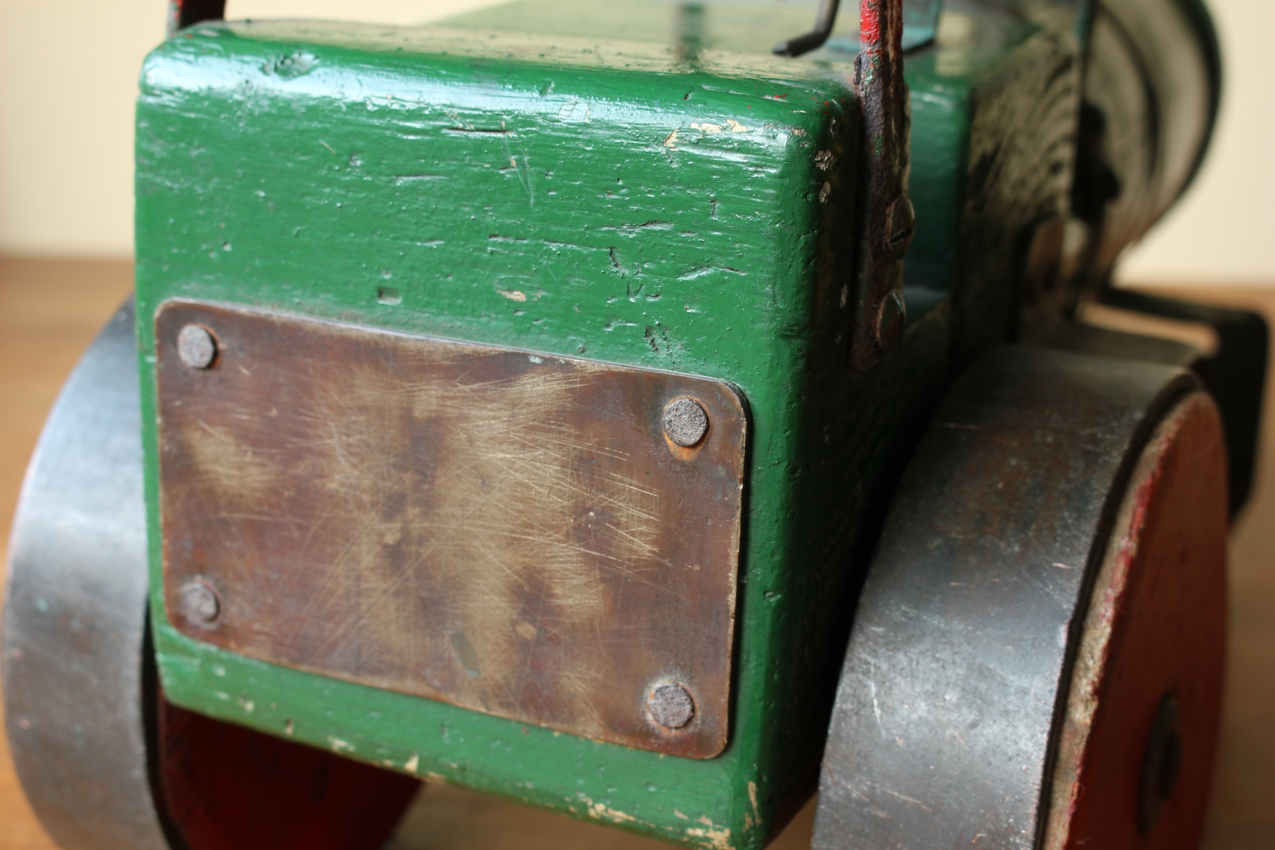 This large scratch built model of a traction engine / steamroller has been handmade with copper, wood and metal with red and green paint.