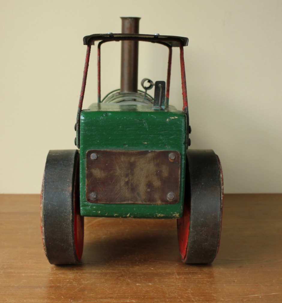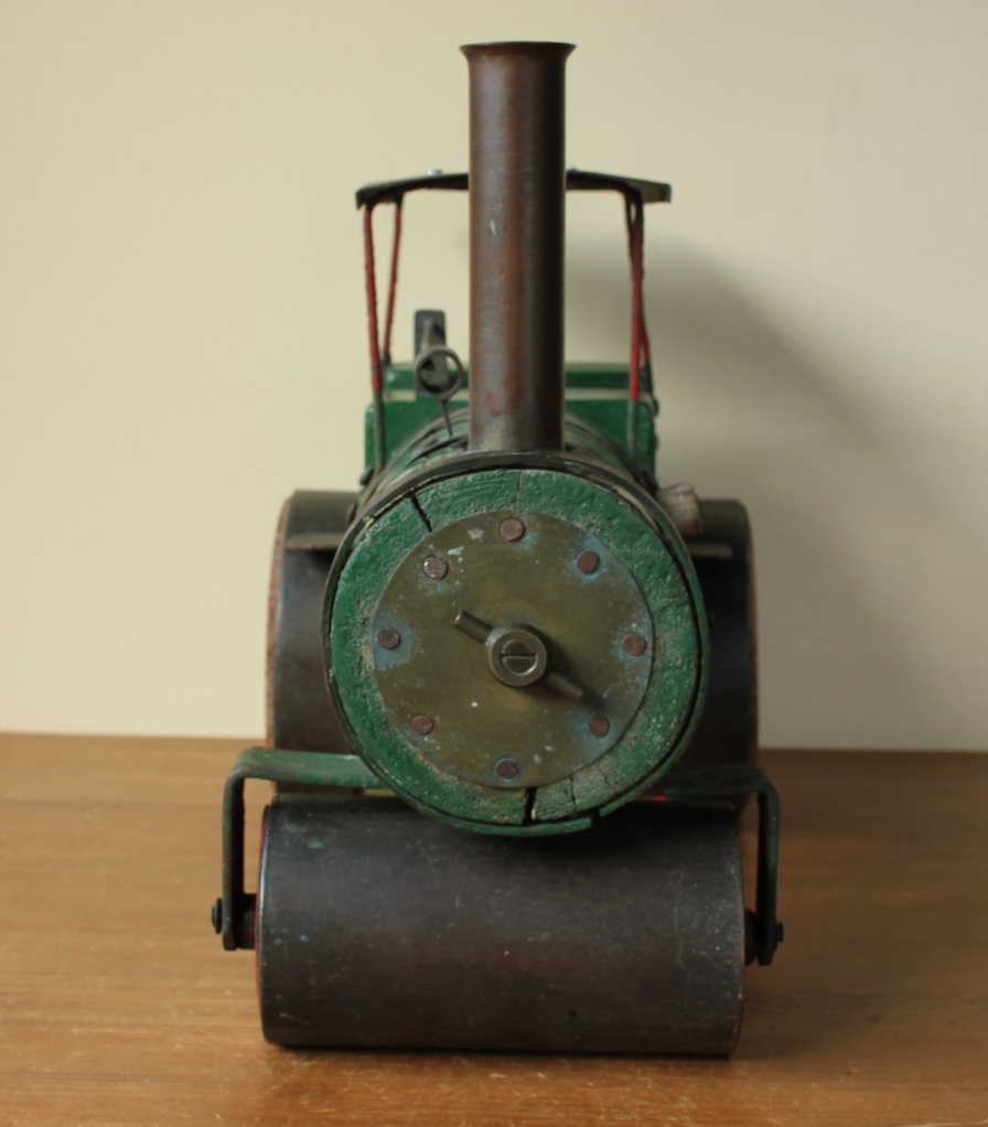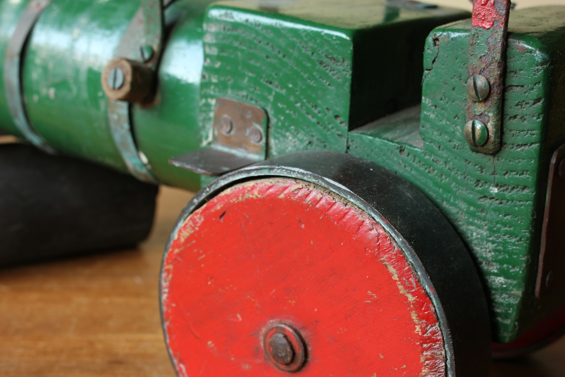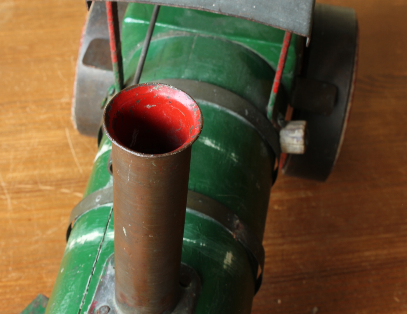 The model which looks to date from the middle of the 20th century is 15" in length, has nice detail with movable rear wheels, swivel roller and a tall copper funnel.