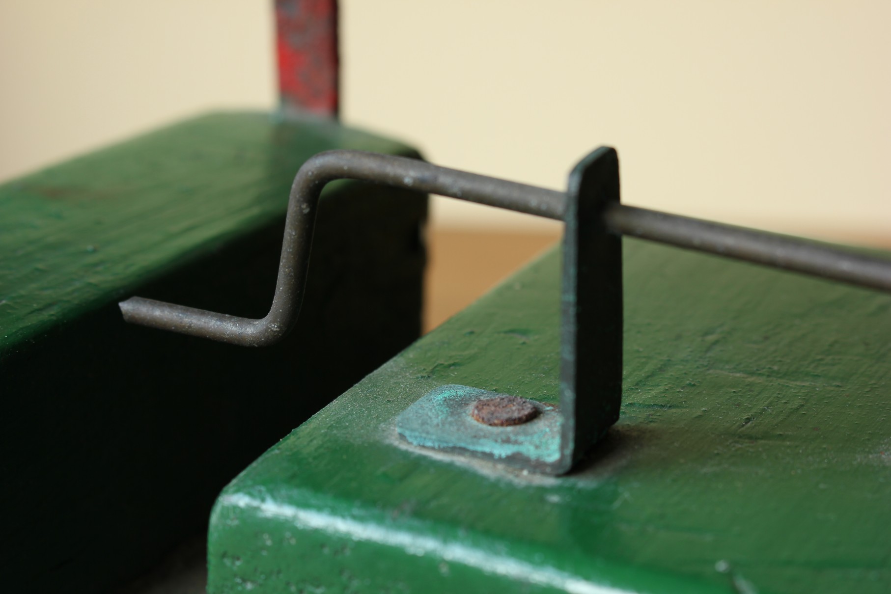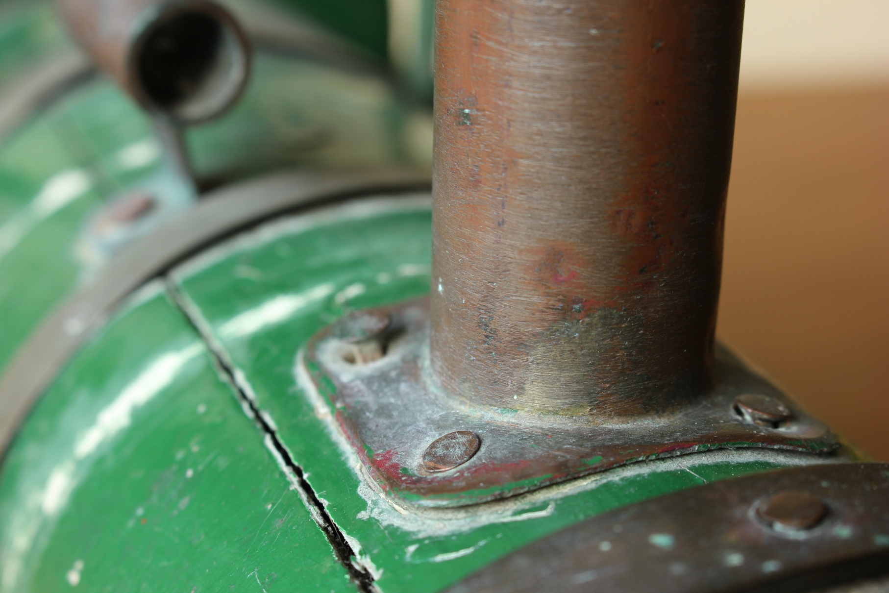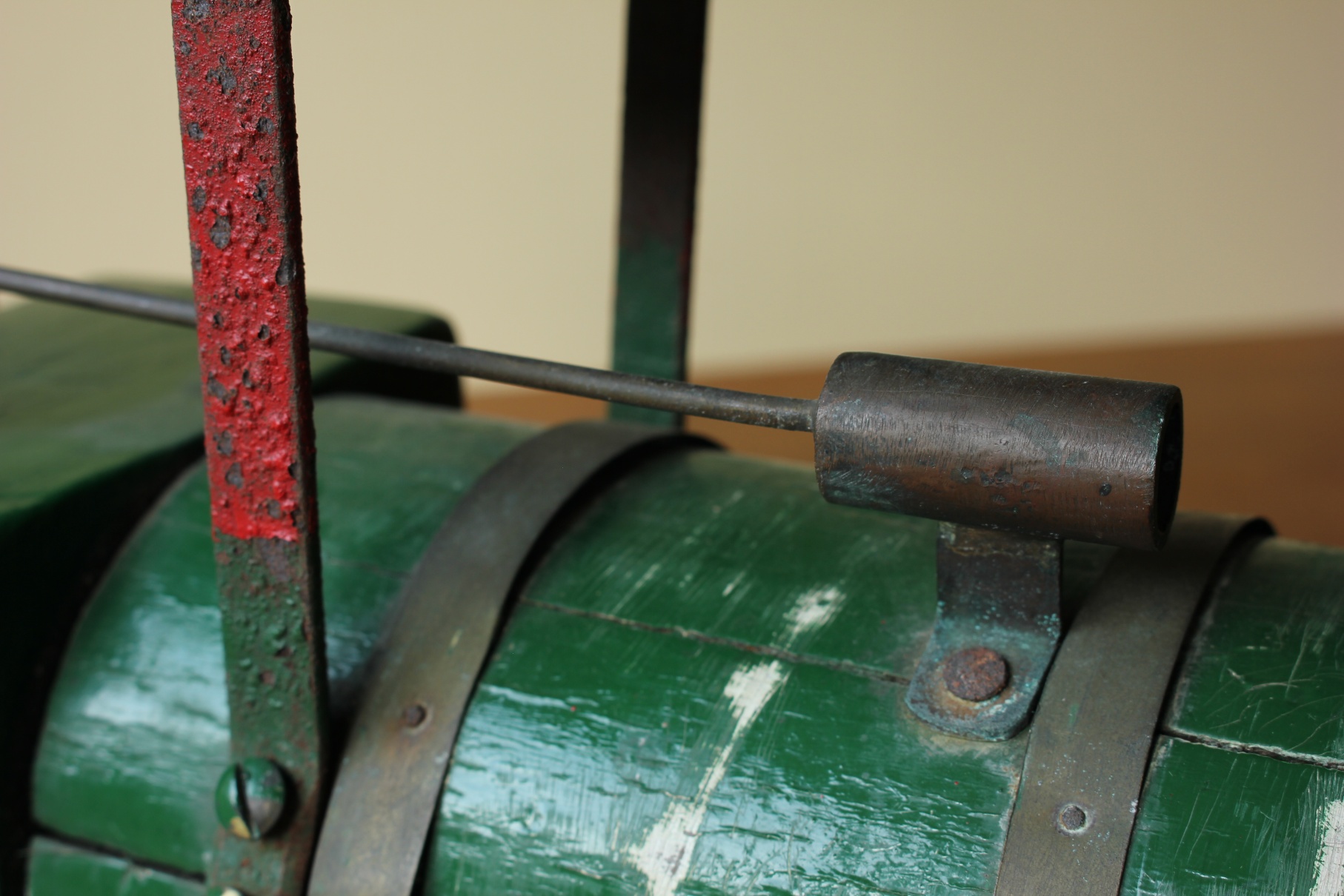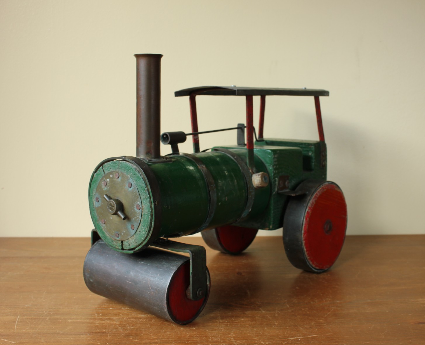 The model which looks to date from the middle of the 20th century is 15" in length, has nice detail with movable rear wheels, swivel roller and a tall copper funnel.