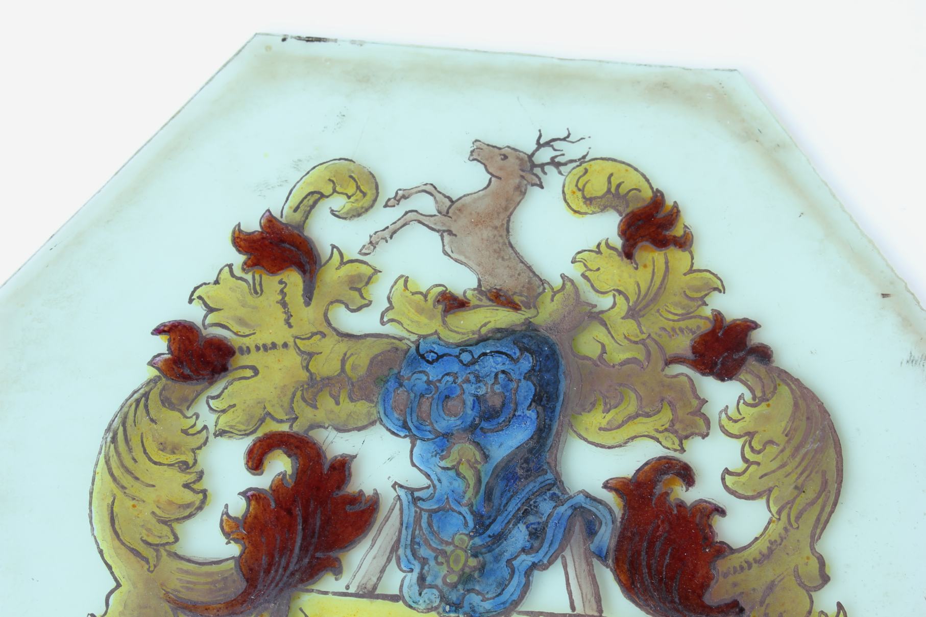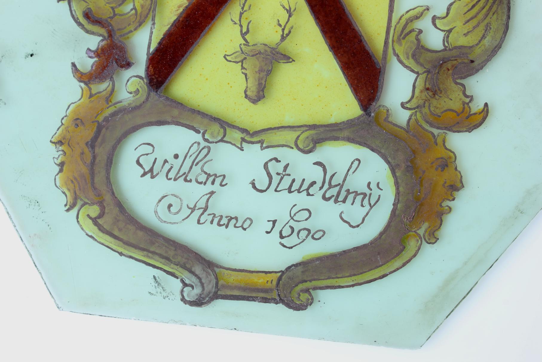 This excellent quality antique stained glass window panel which dates from 1690 features the Coat of Arms for Willem Studelmy and has beautiful hand painted deer, faces and floral decoration. This crest also has the name Willem Studelmy and Anno 1690 shown as part of the crest.