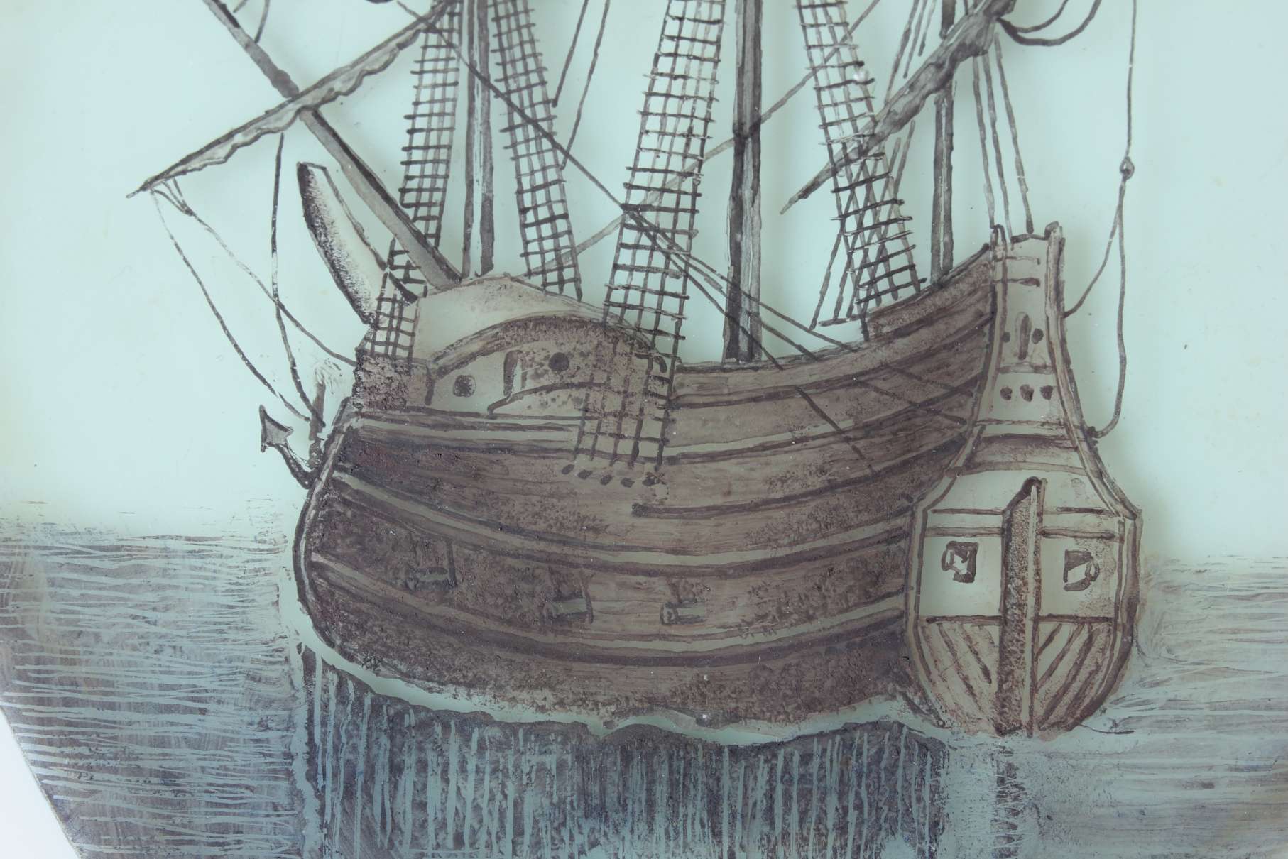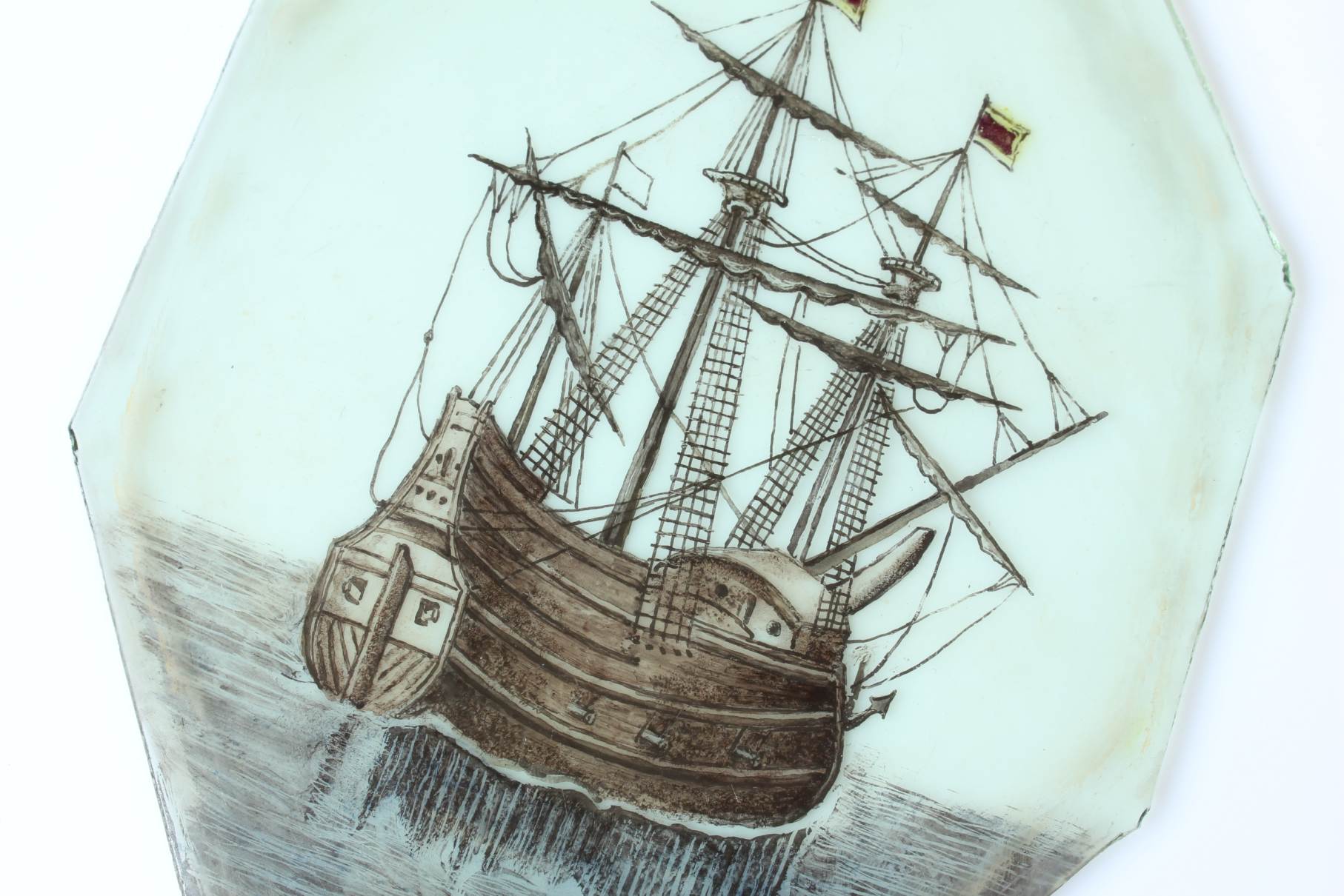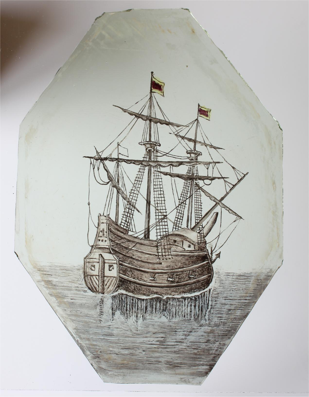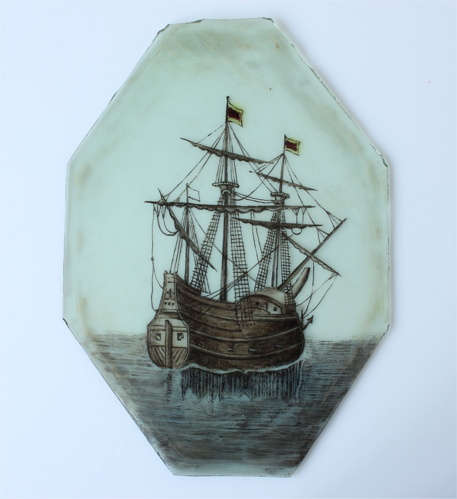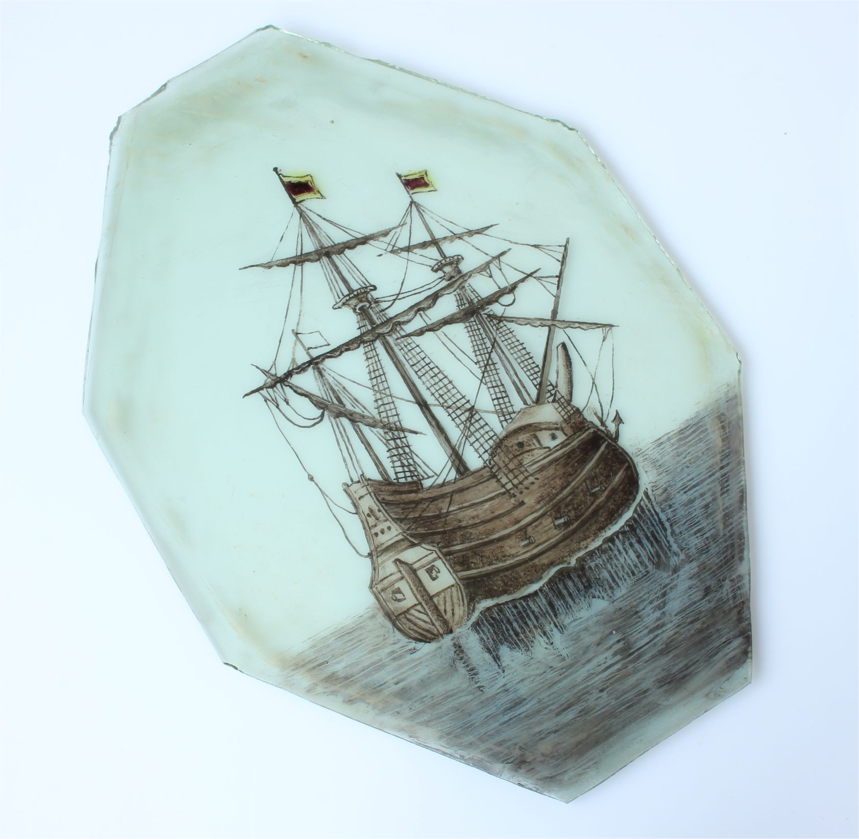 This antique stained glass window panel which features an old galleon ship out on the high seas has good quality hand painted detail and dates from the 17th century.