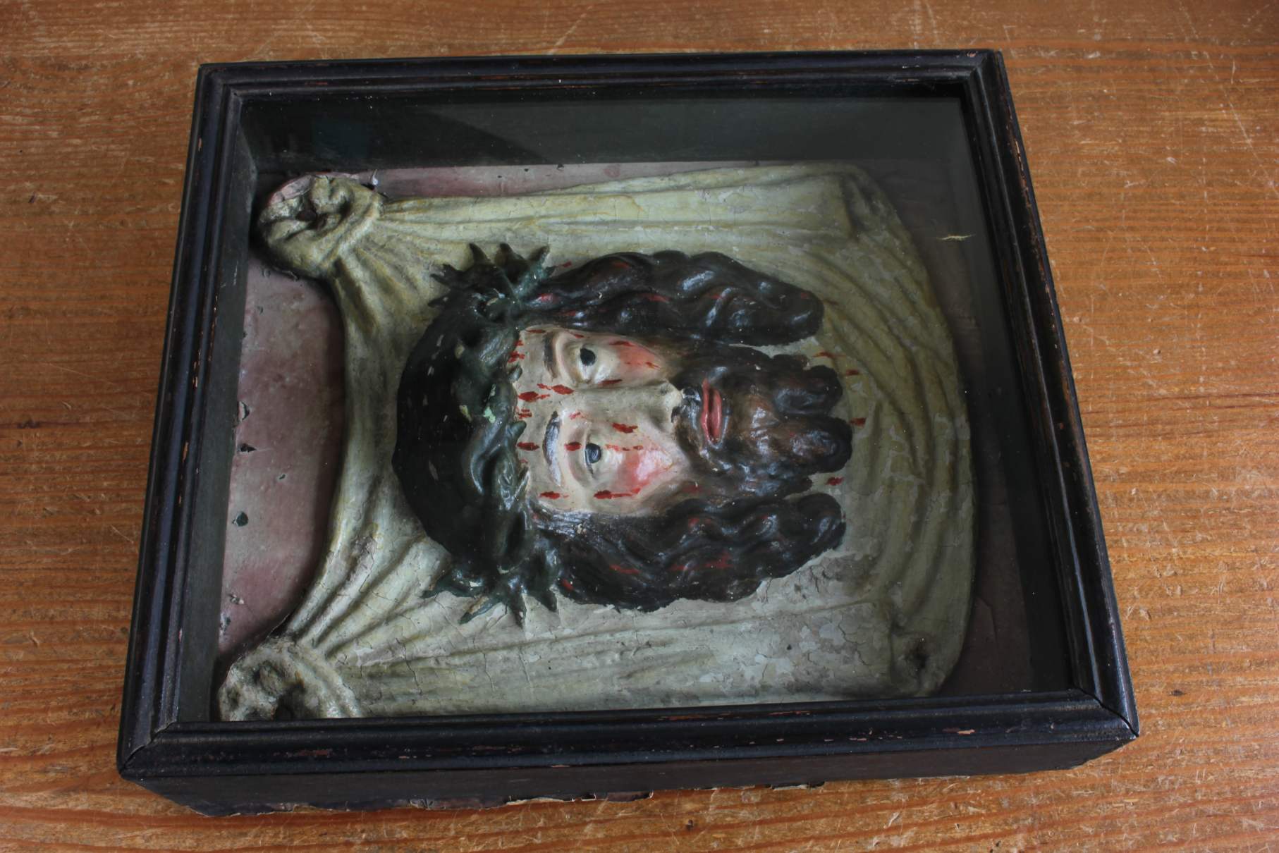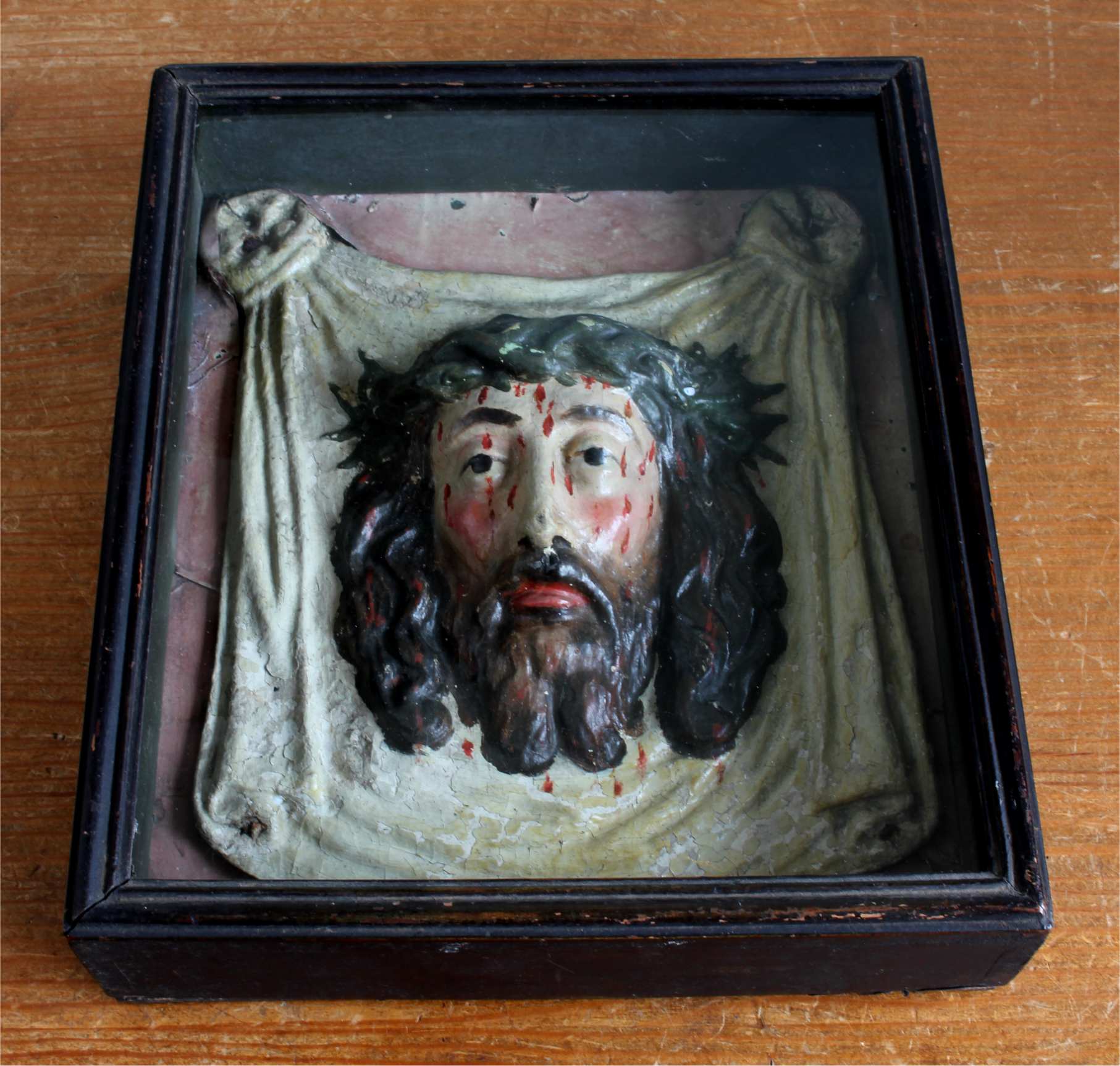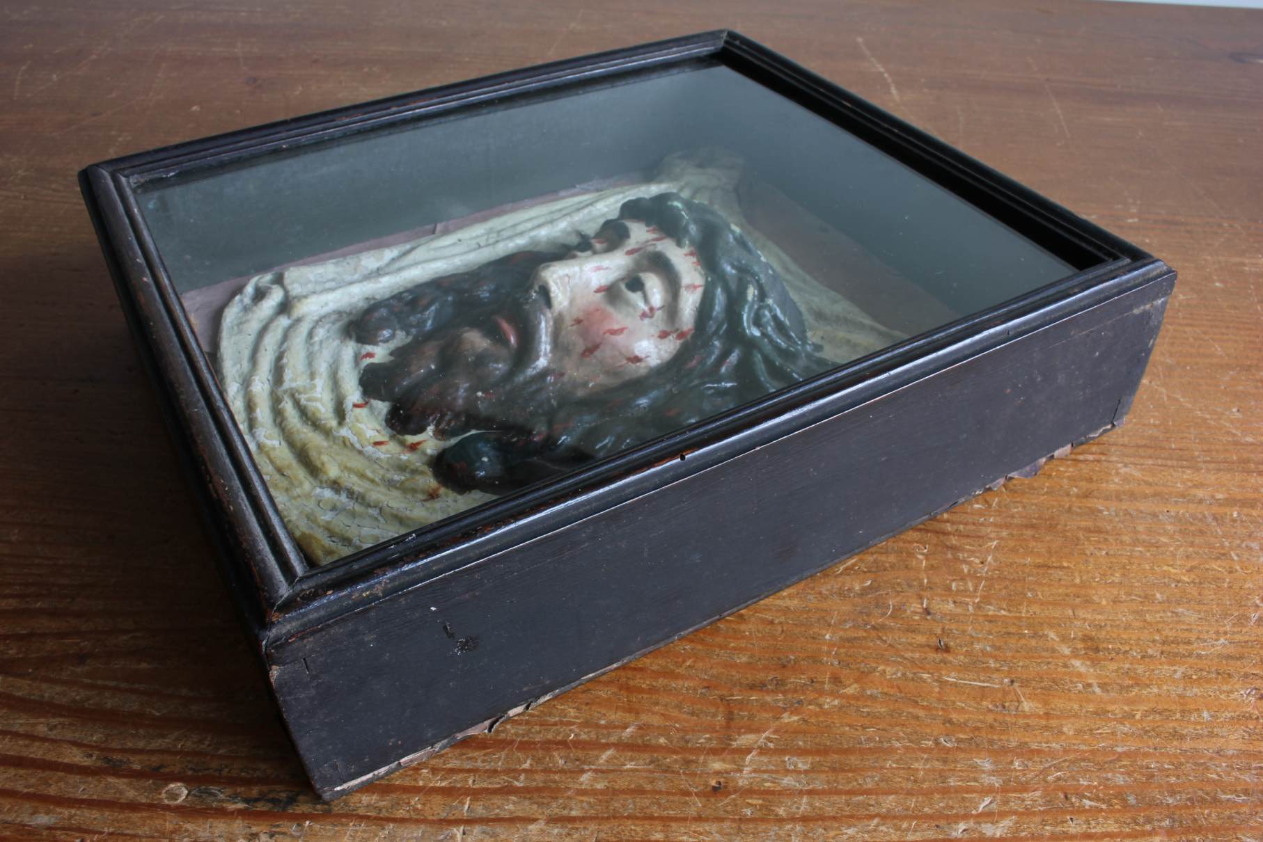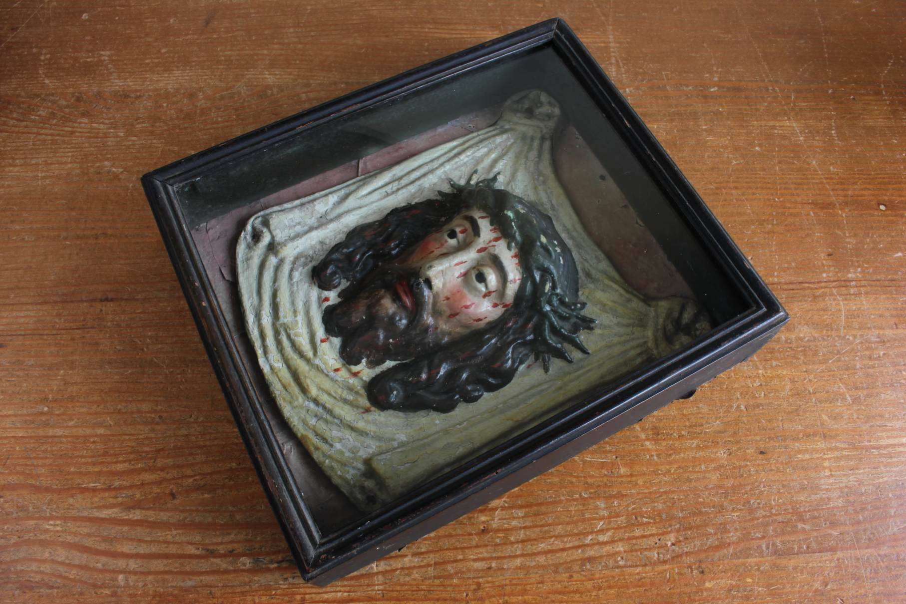 This unusual religious antique piece which is made of papier mache is of the Veil of Veronica and has a glazed front.