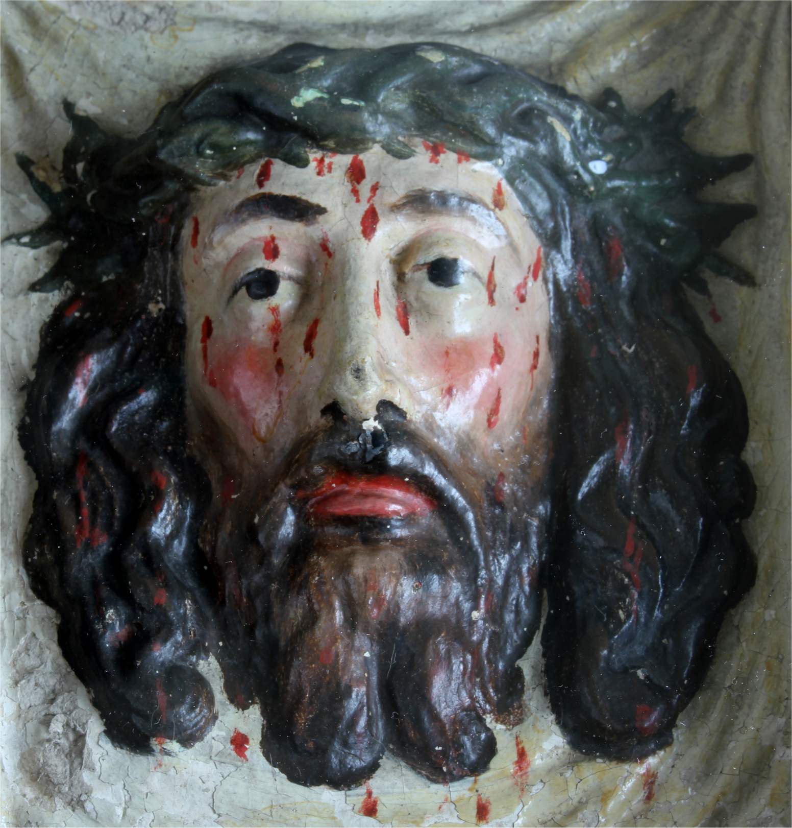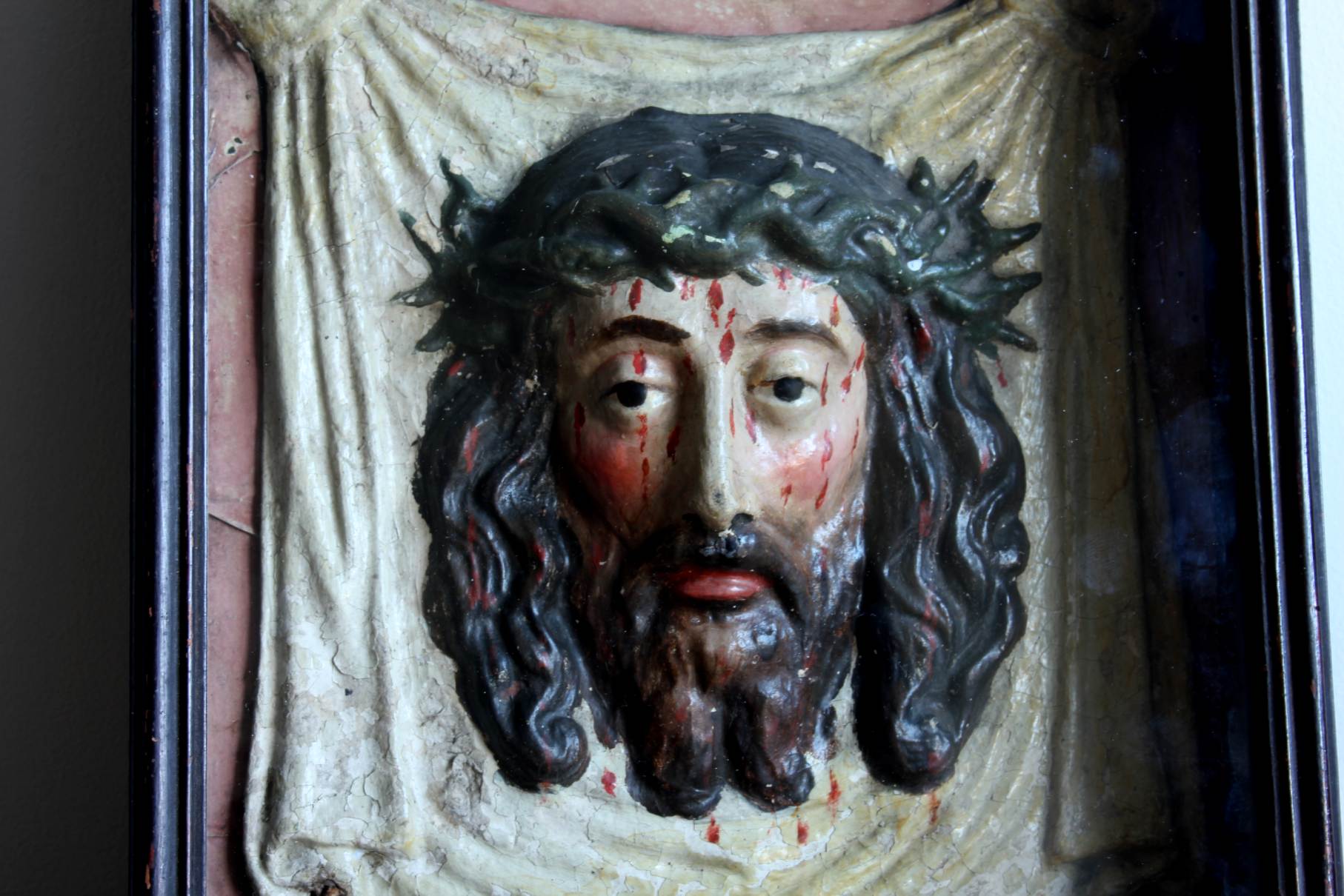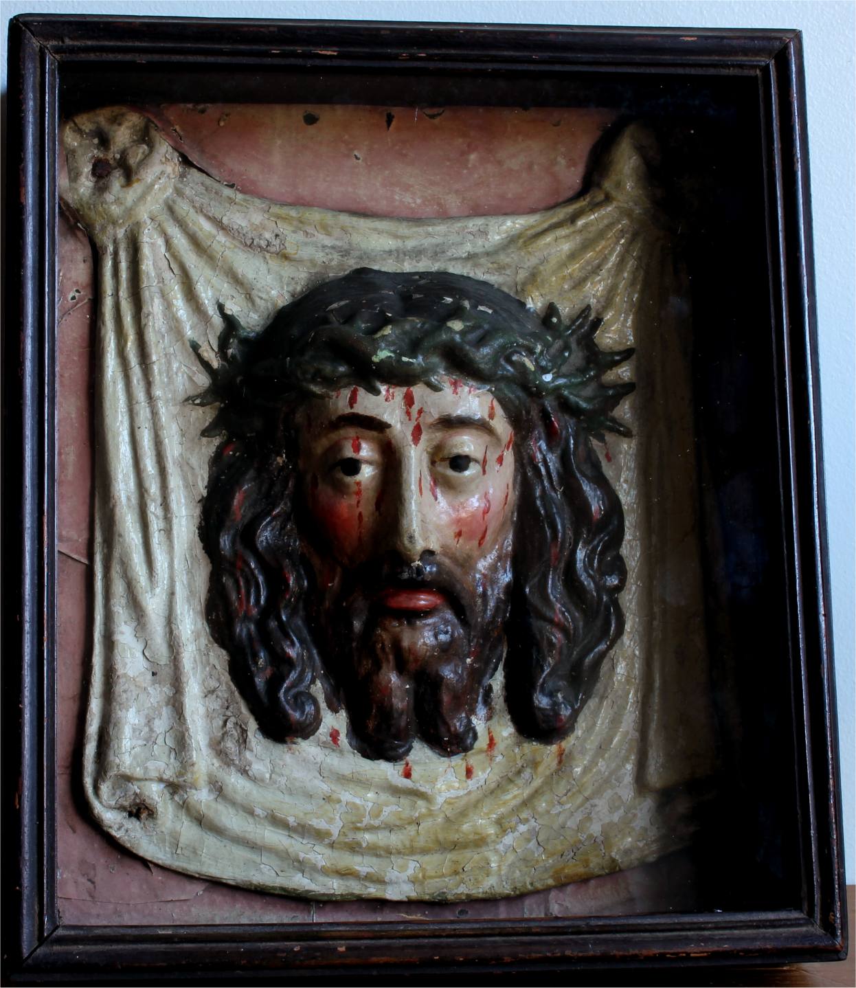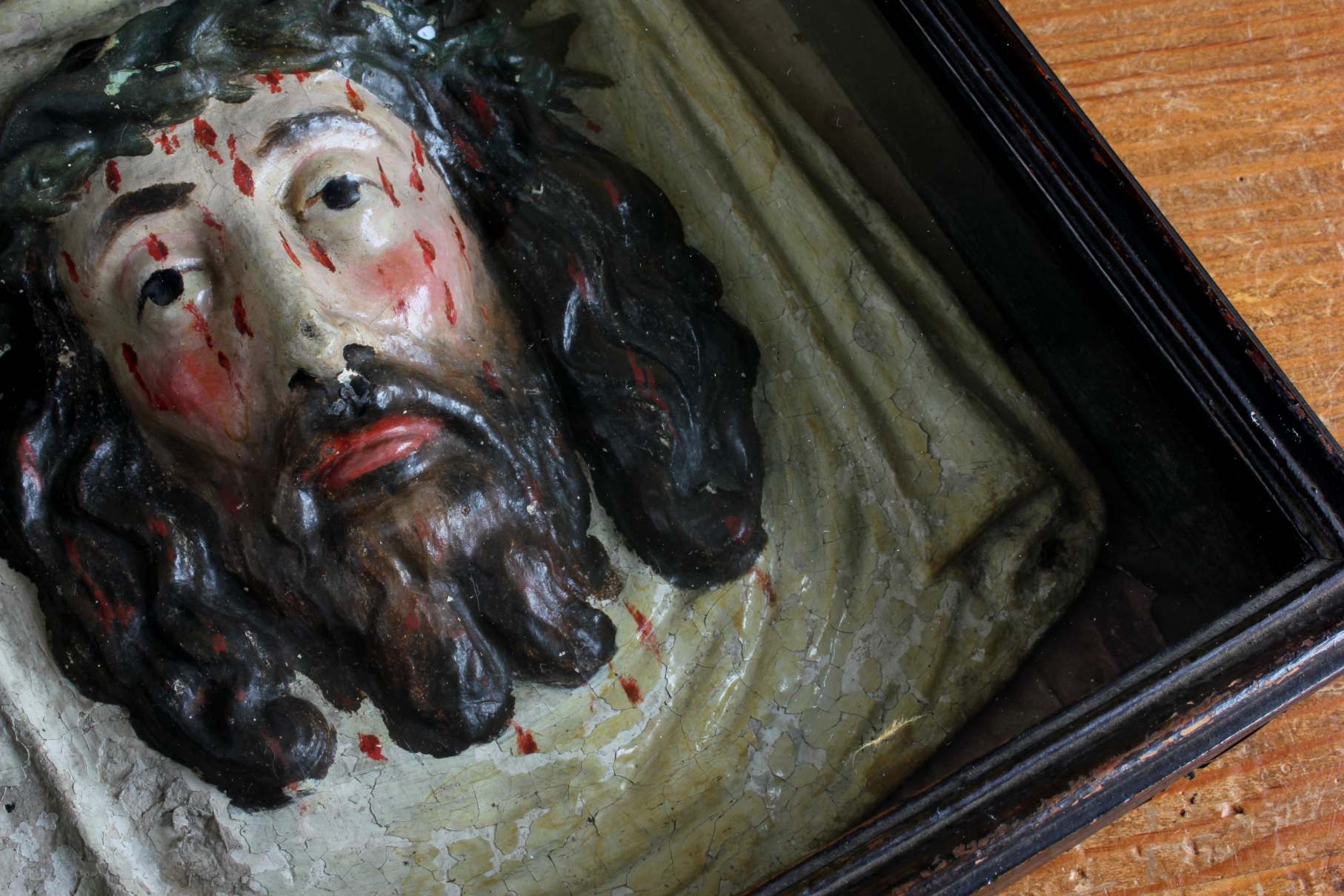 This unusual religious antique piece which is made of papier mache is of the Veil of Veronica and has a glazed front.
