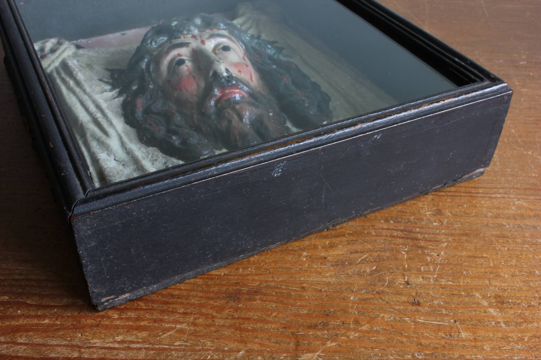 This antique polychrome head of Jesus Christ mounted in a wooden framed case most likely originates from Italy and dates from the 1800's.