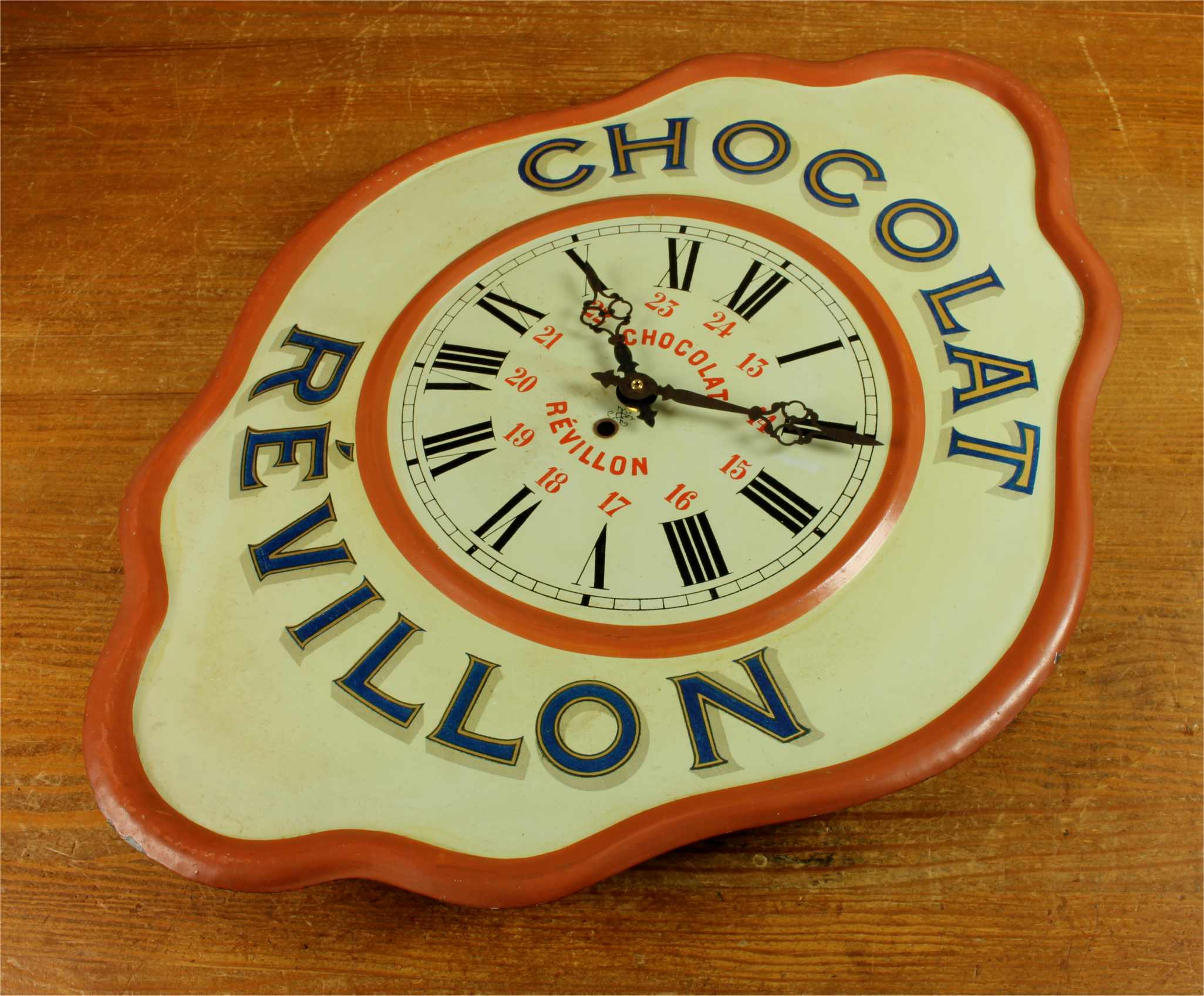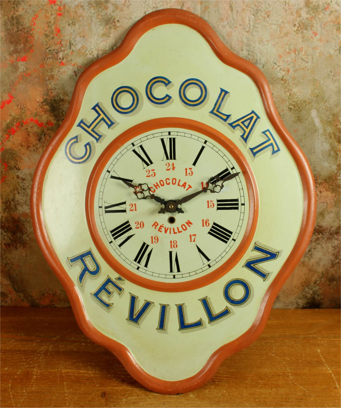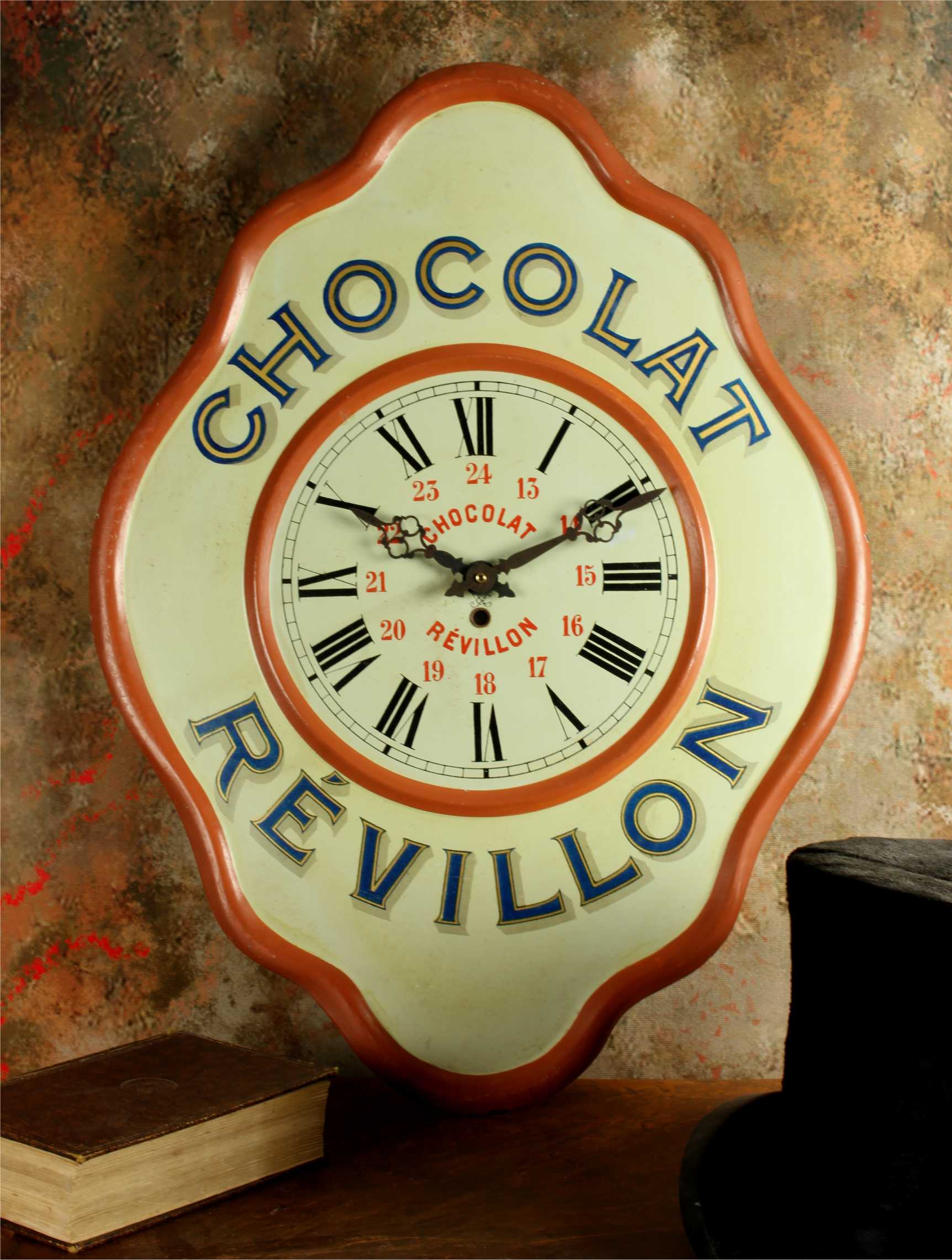 This highly decorative advertising clock would have originally been hung in a French Chocolate shop or cafe to advertise Chocolat Revillon and has lots of charm.