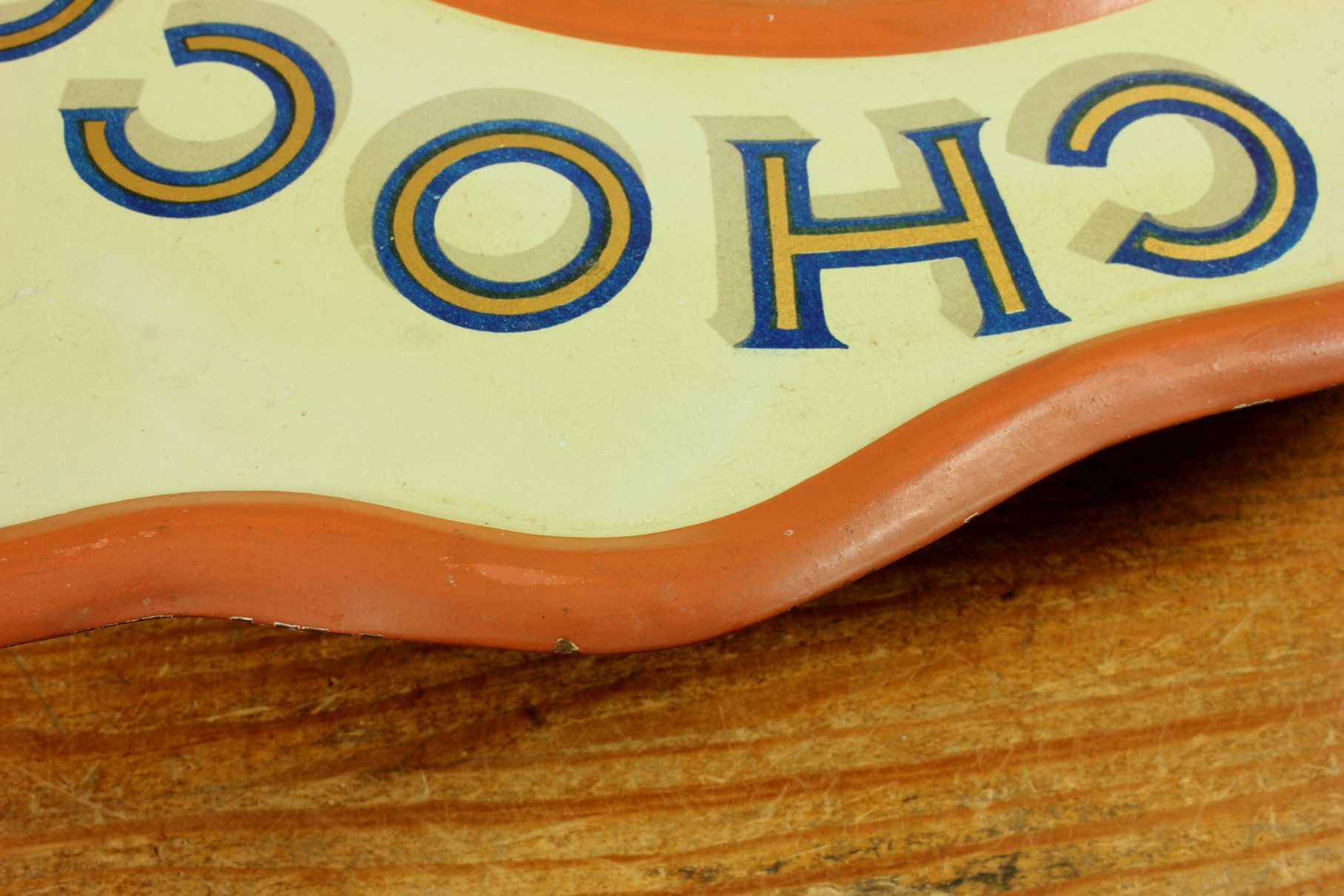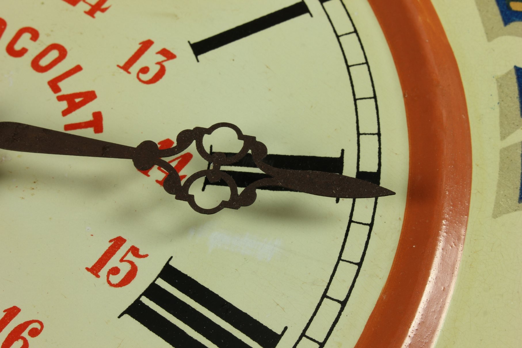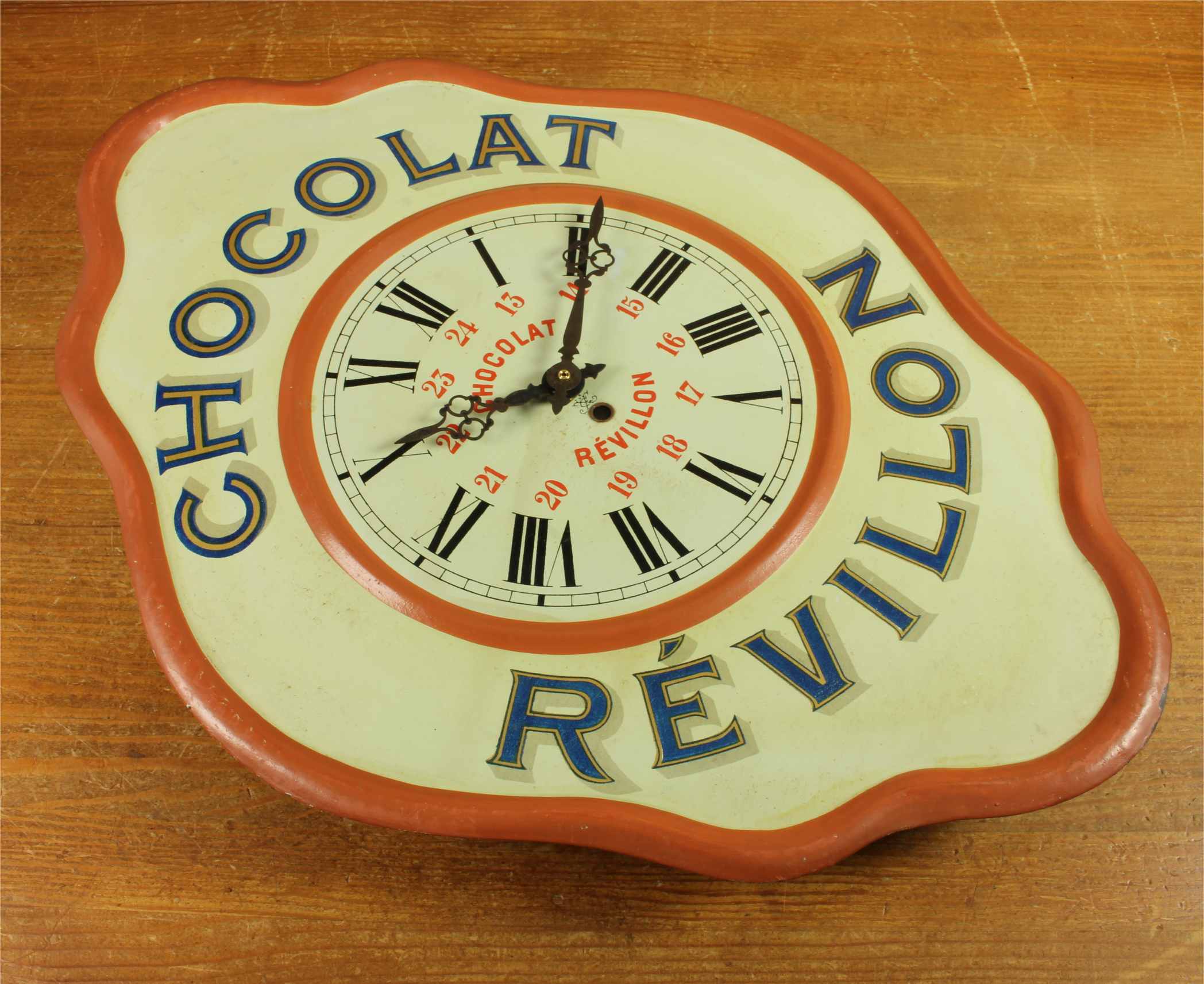 This highly decorative advertising clock would have originally been hung in a French Chocolate shop or cafe to advertise Chocolat Revillon and has lots of charm.