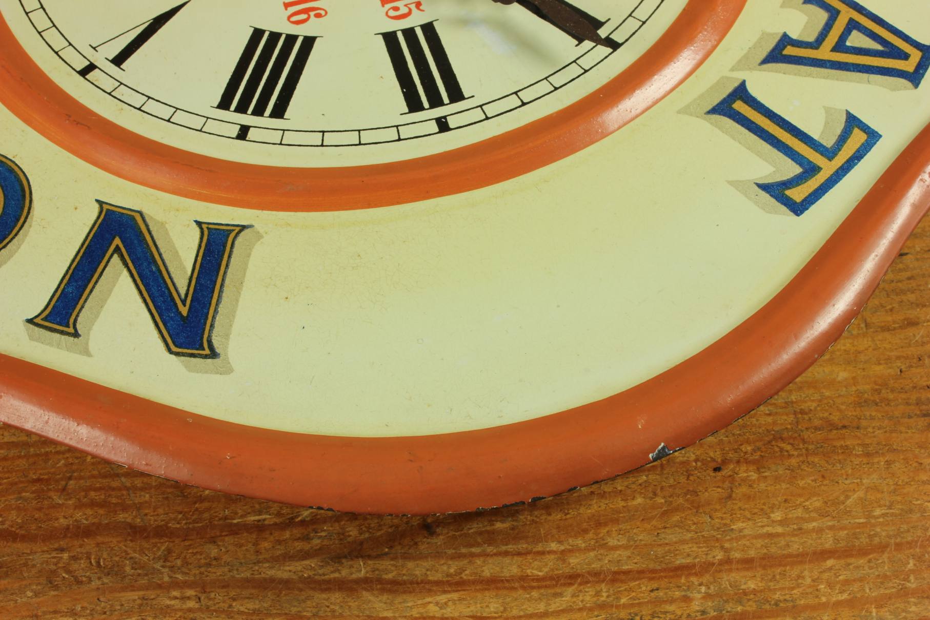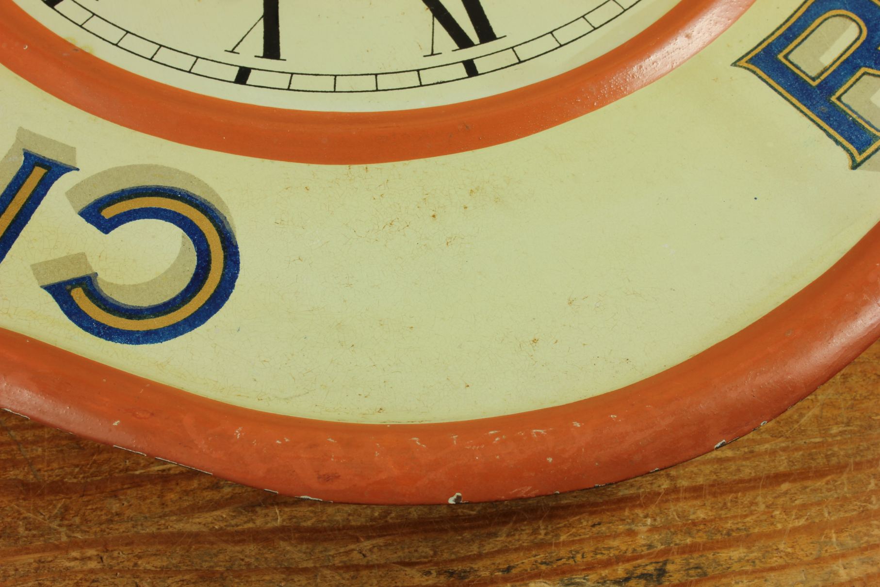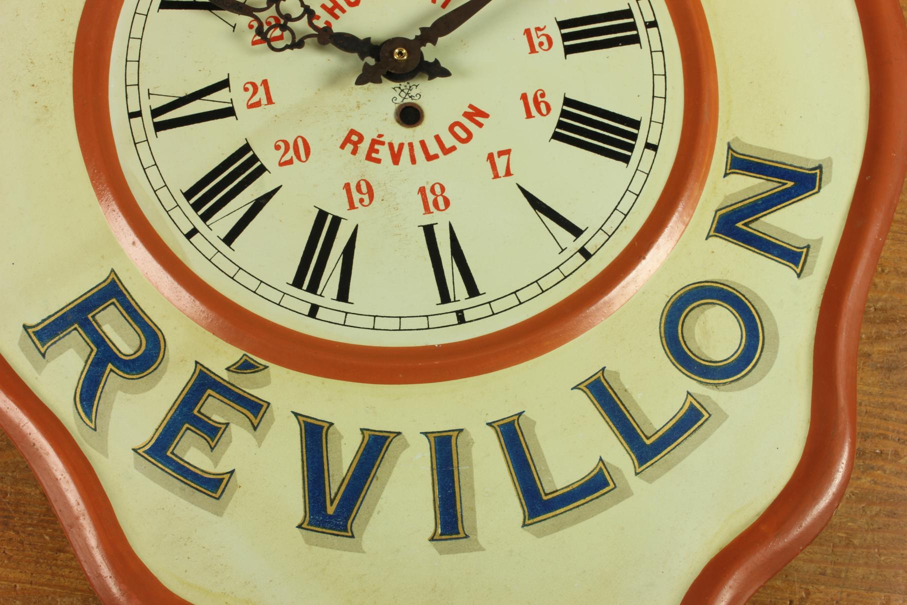 This stylish antique French toleware Chocolat Revillon advertising wall clock which dates from the second quarter of the 20th century has a wavy outer, is made of painted metal and is in excellent condition.
