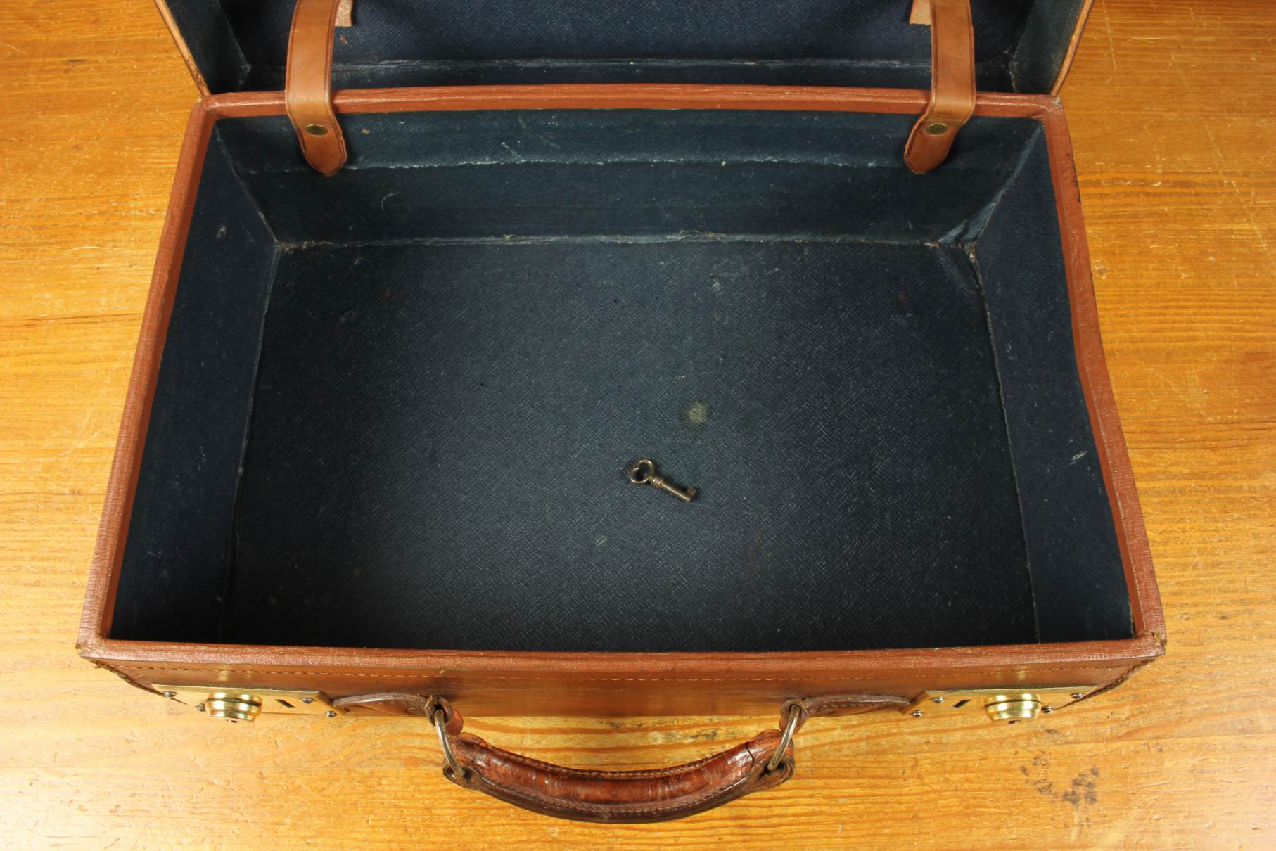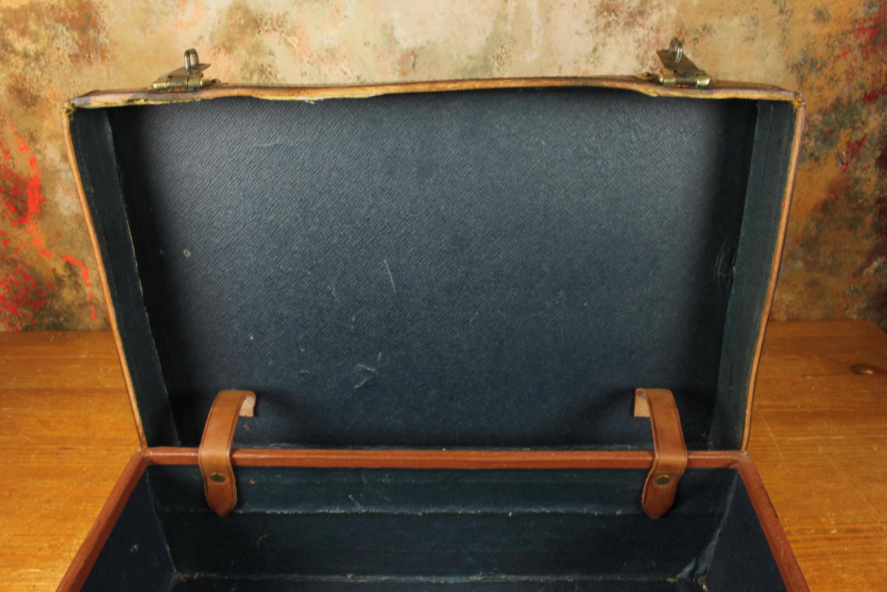 Condition: Excellent used antique condition with signs of use in keeping with age. Some age related wear and nice patina. The case is very sound and usable with good stitching, strong handle and corners. Locks work and we have the key. A few marks to inside. Please see pictures.