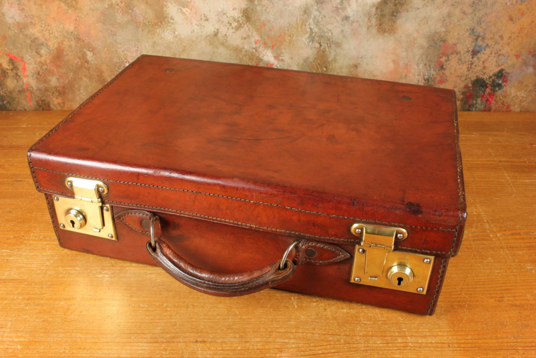 This handsome antique leather small size case which would make an excellent briefcase is made from high quality leather, has a stitched leather handle with sturdy brass fittings, two brass locks/clasps and locks with the key.