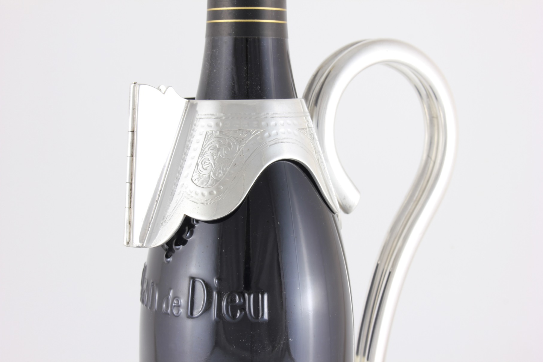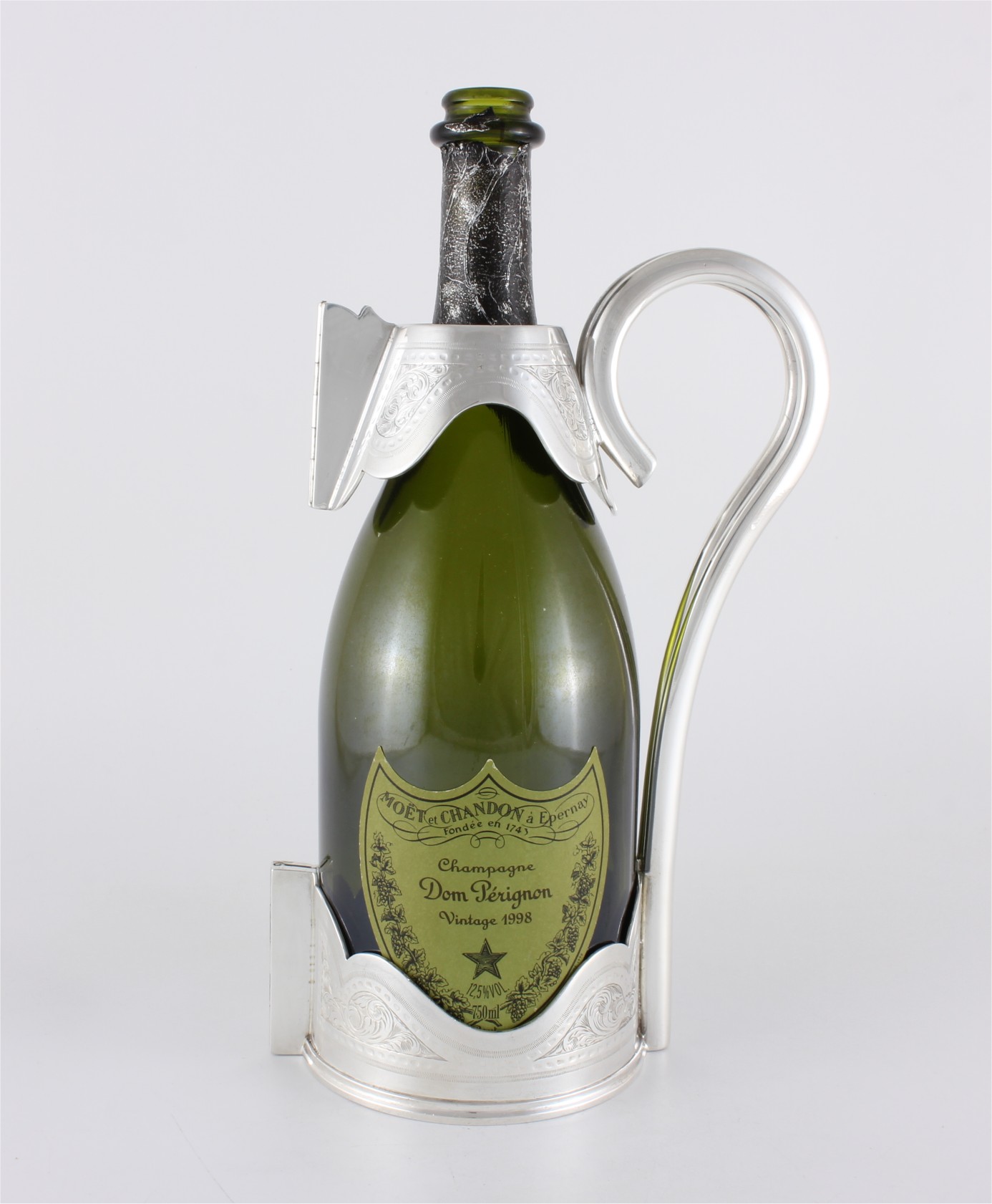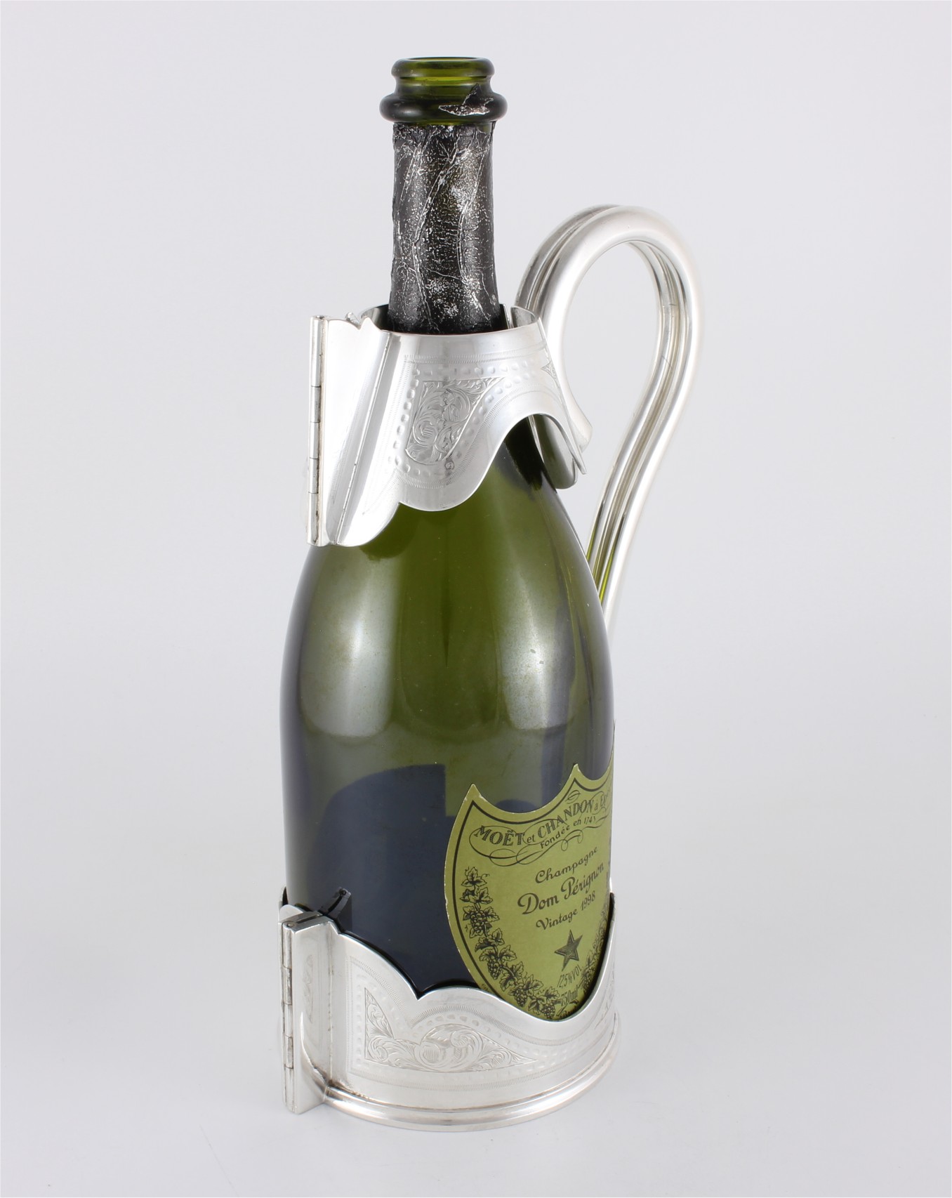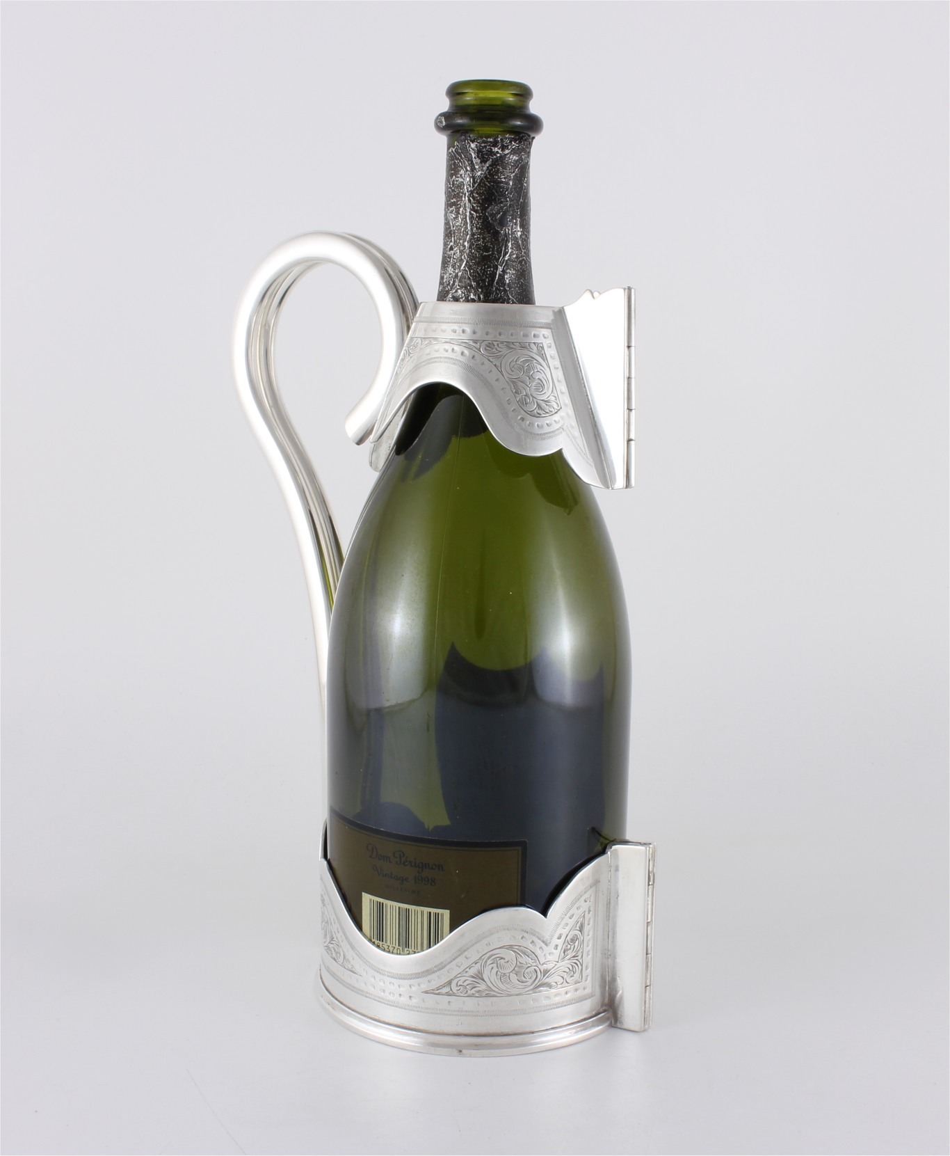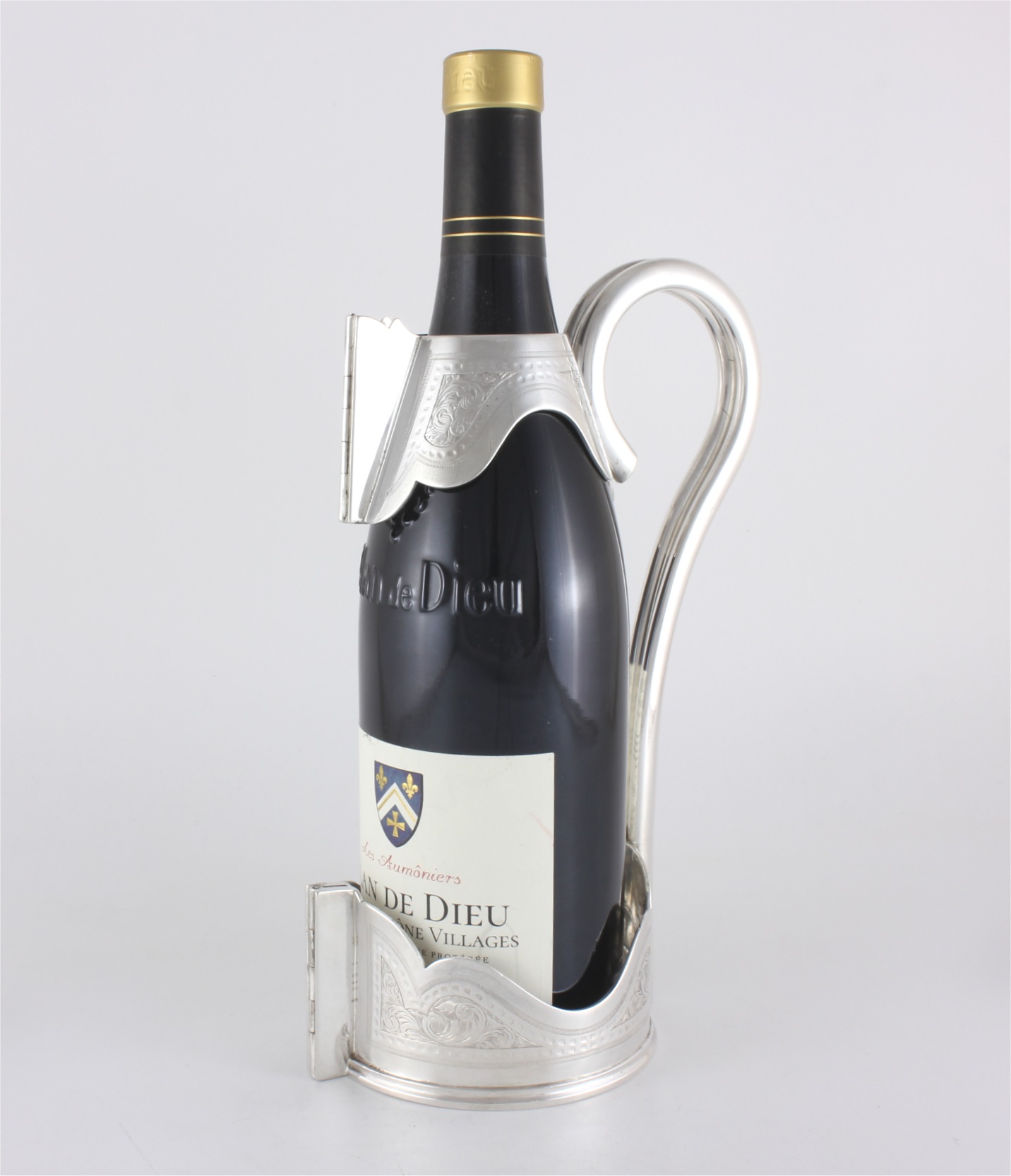 The Victorian bottle holder opens so you can insert your wine bottle and then closes around it with the handles holding the bottle in place. Holds a standard bottle of wine (holds a wine or Champagne bottle with a bottom diameter of 9.5 cm max) and is a stylish way to serve wine from the bottle.