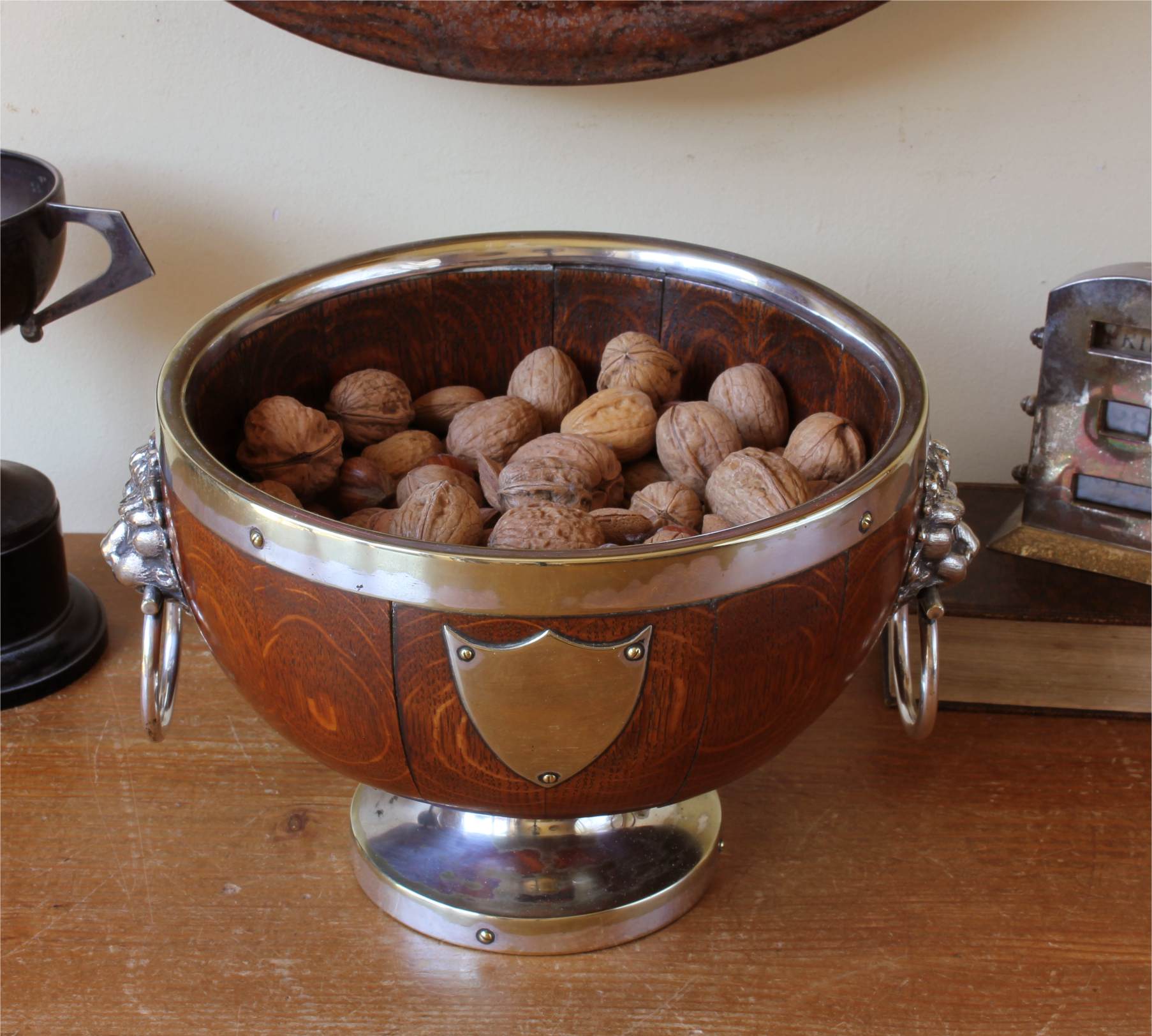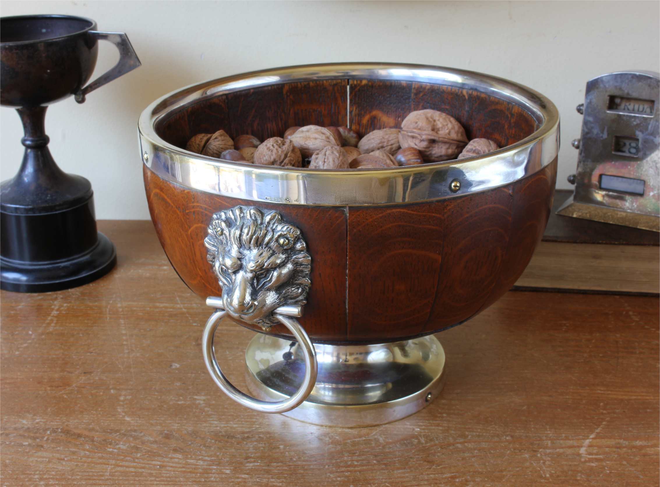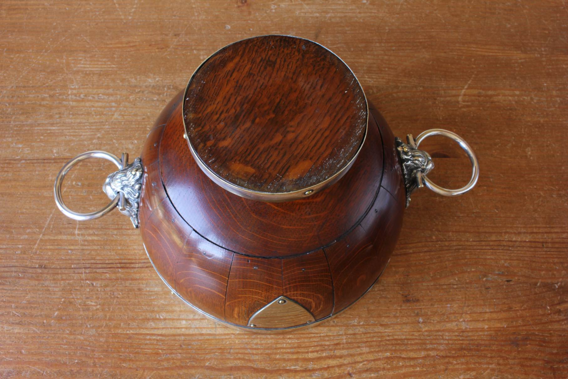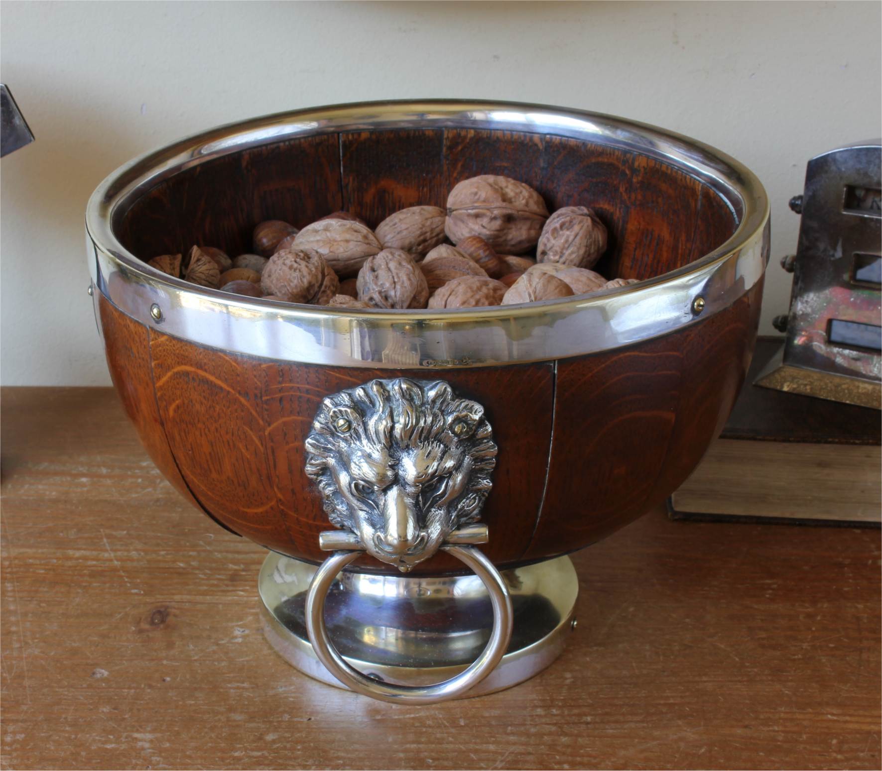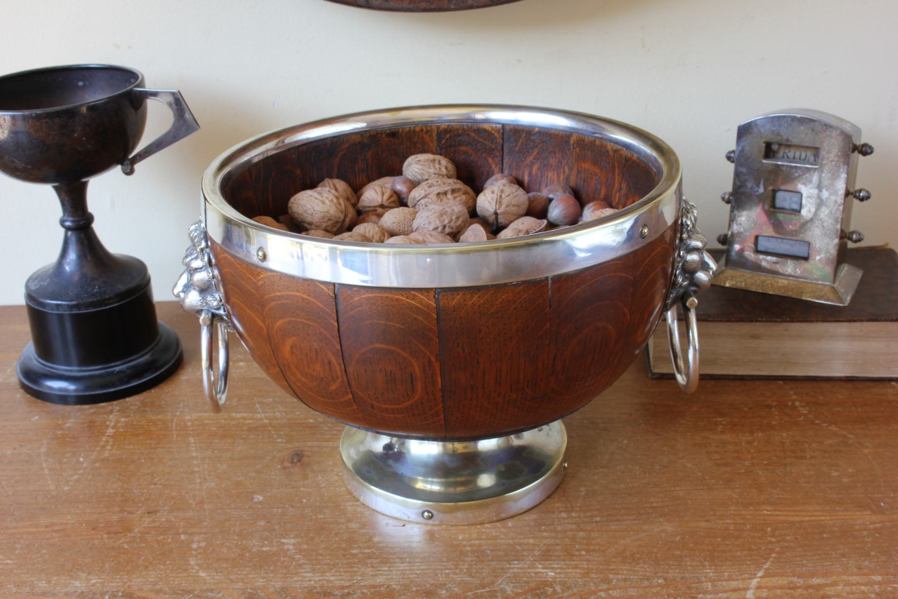 This handsome English Oak fruit bowl which is by William Hutton & Sons Ltd dates from c1900, has silver plated lion head and ring handles to the sides, silver plated rim and sits on a raised silver plated foot.