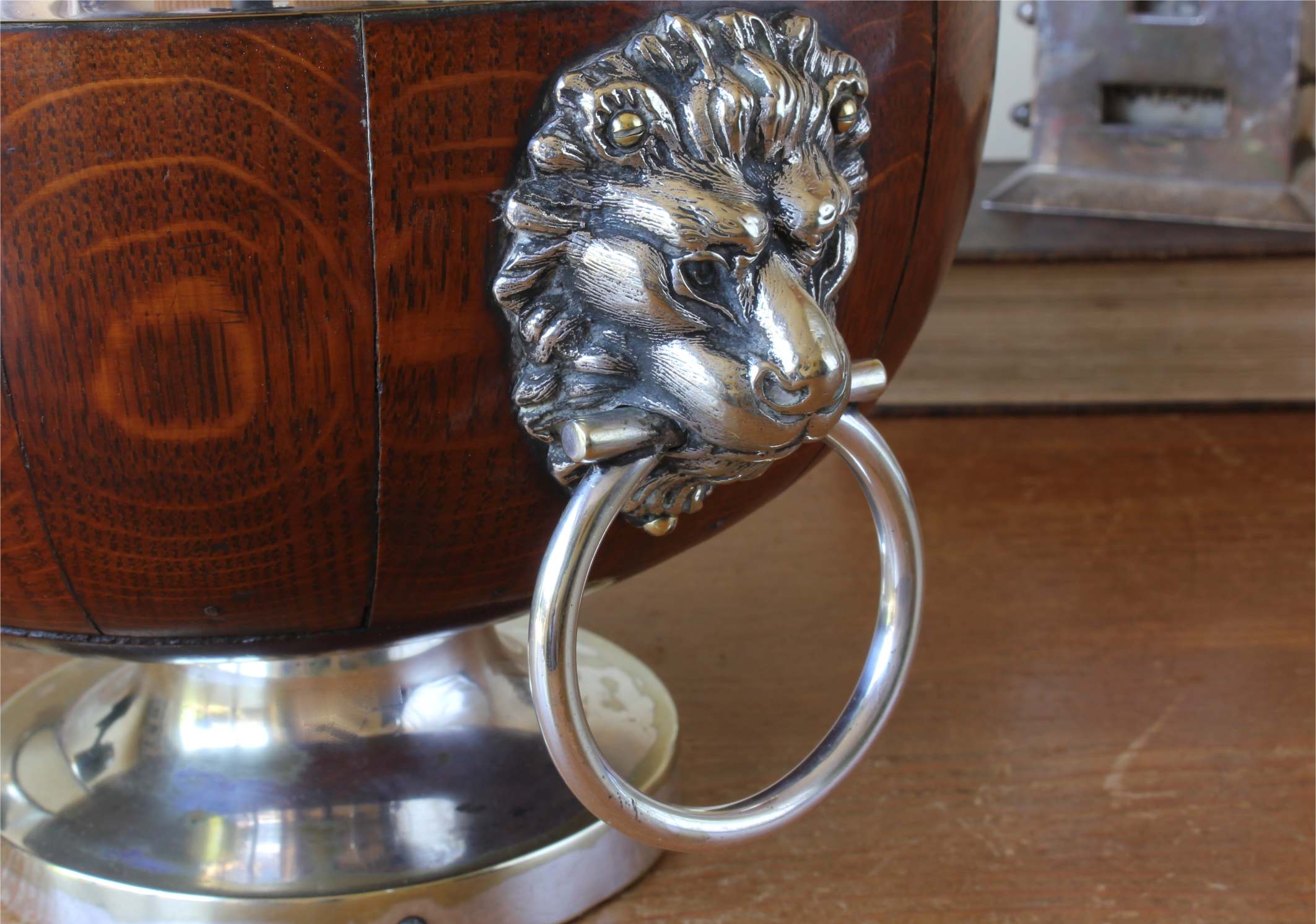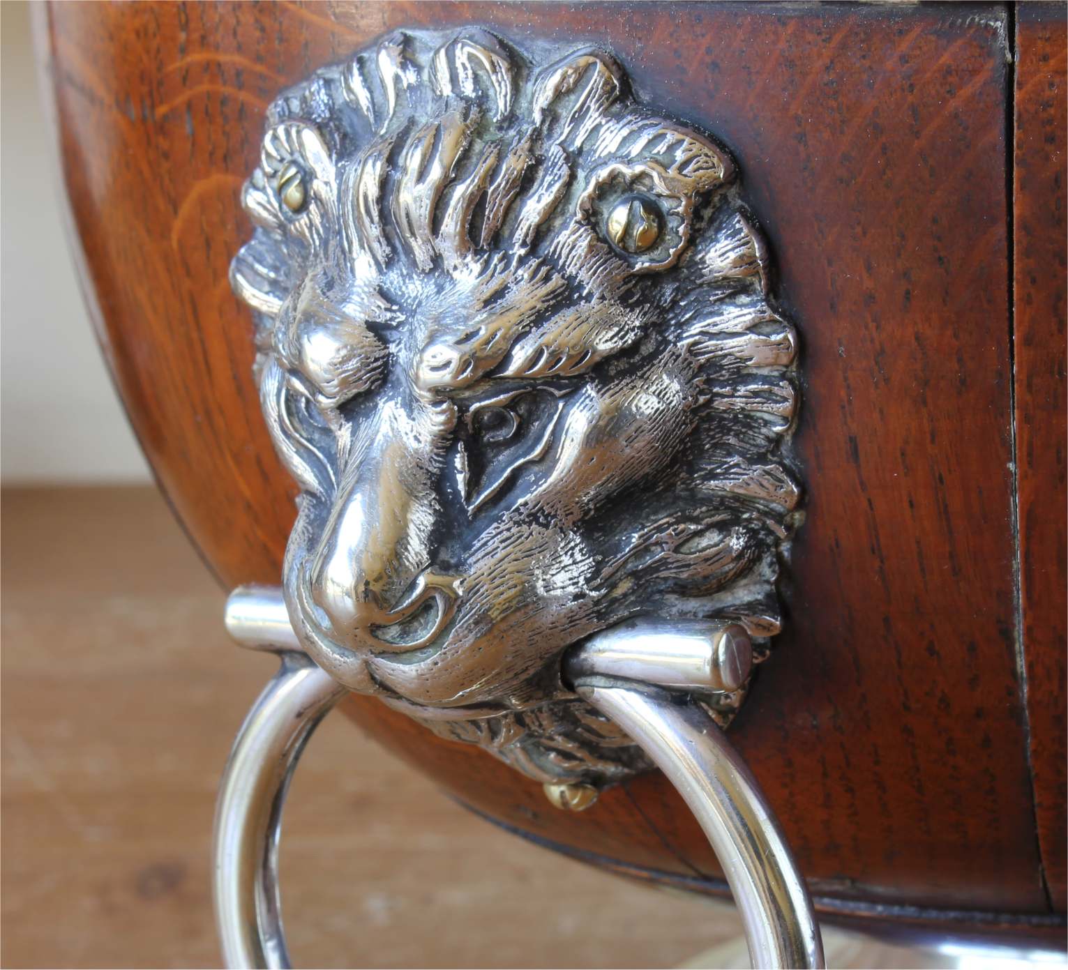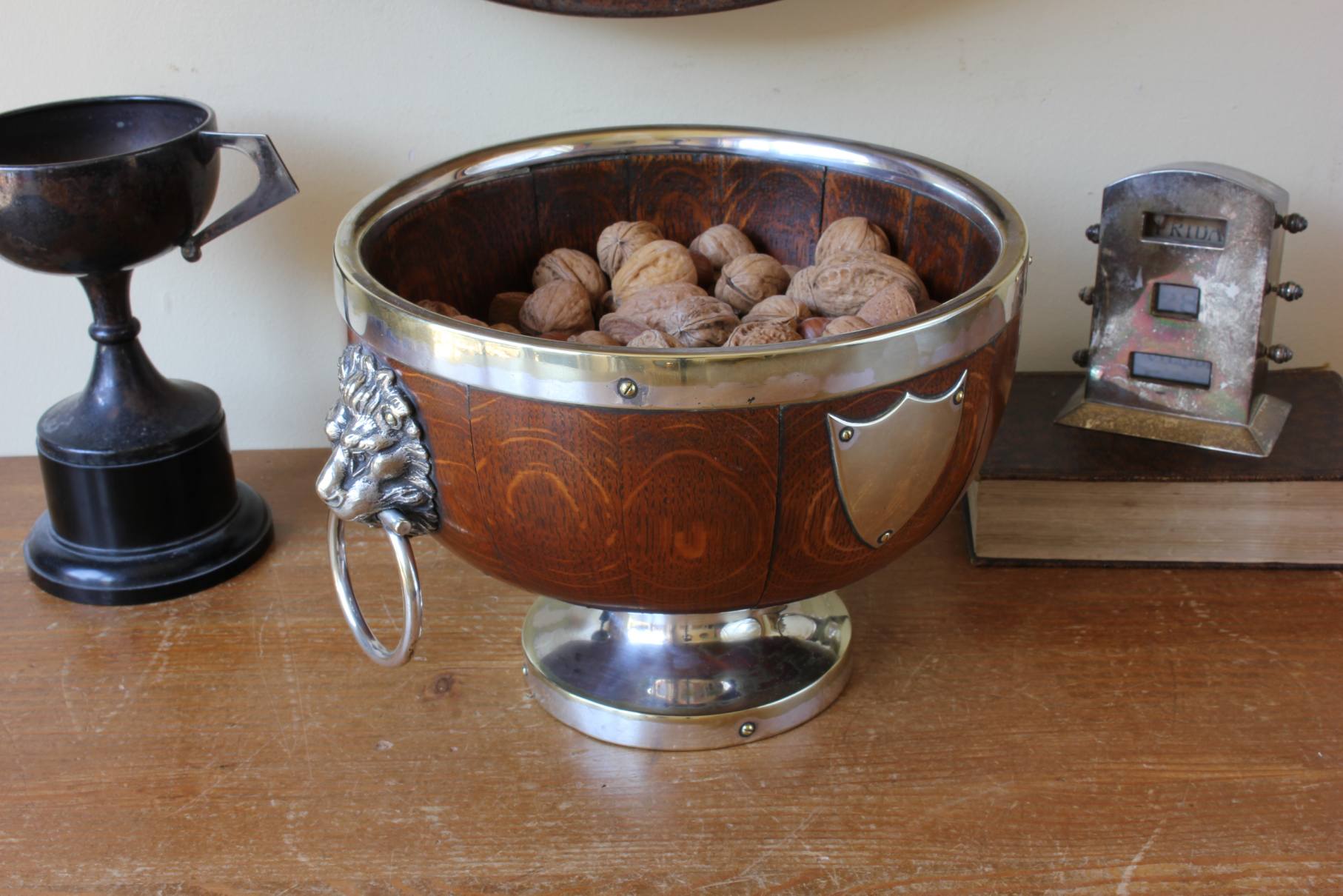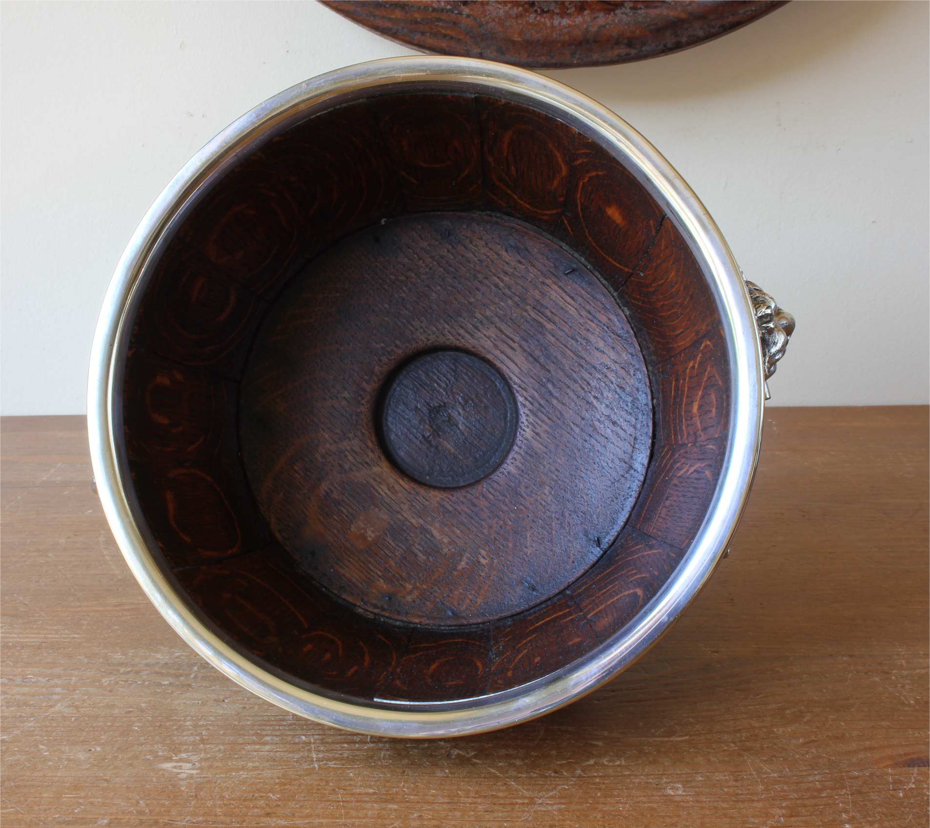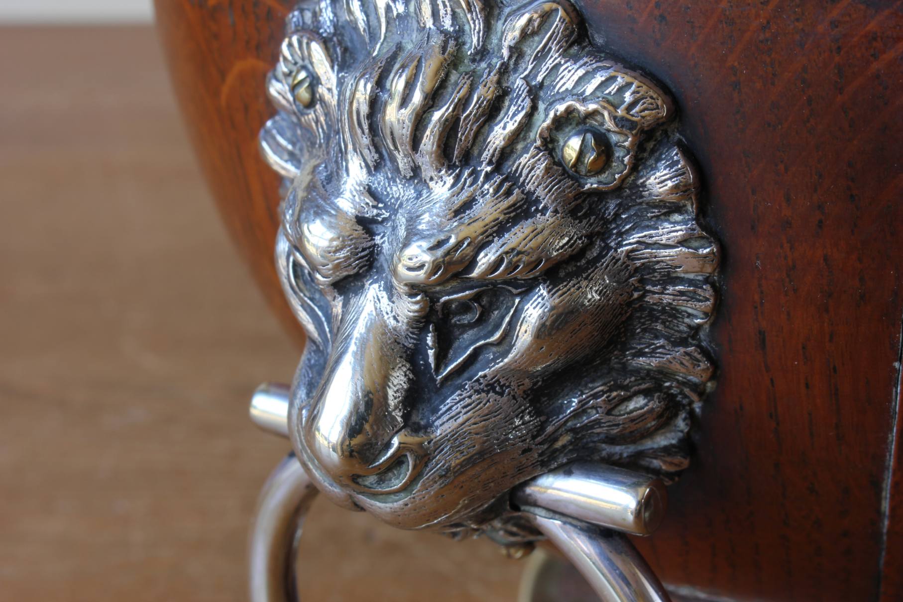 This handsome English Oak fruit bowl which is by William Hutton & Sons Ltd dates from c1900, has silver plated lion head and ring handles to the sides, silver plated rim and sits on a raised silver plated foot.