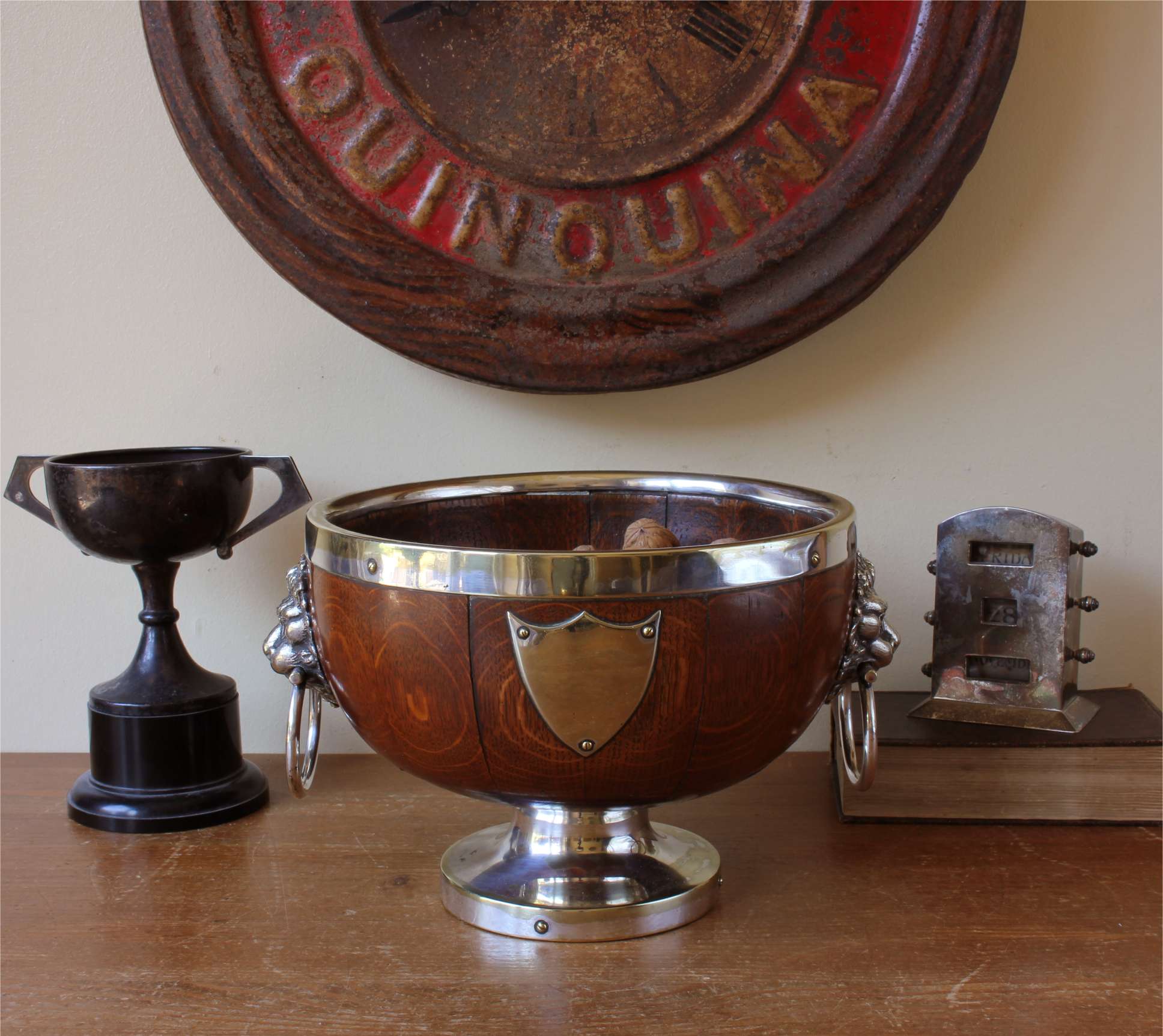 This antique serving bowl which has good detail to the lion head handles has a large vacant silver plated shield cartouche to the front so could be inscribed if you so wanted.