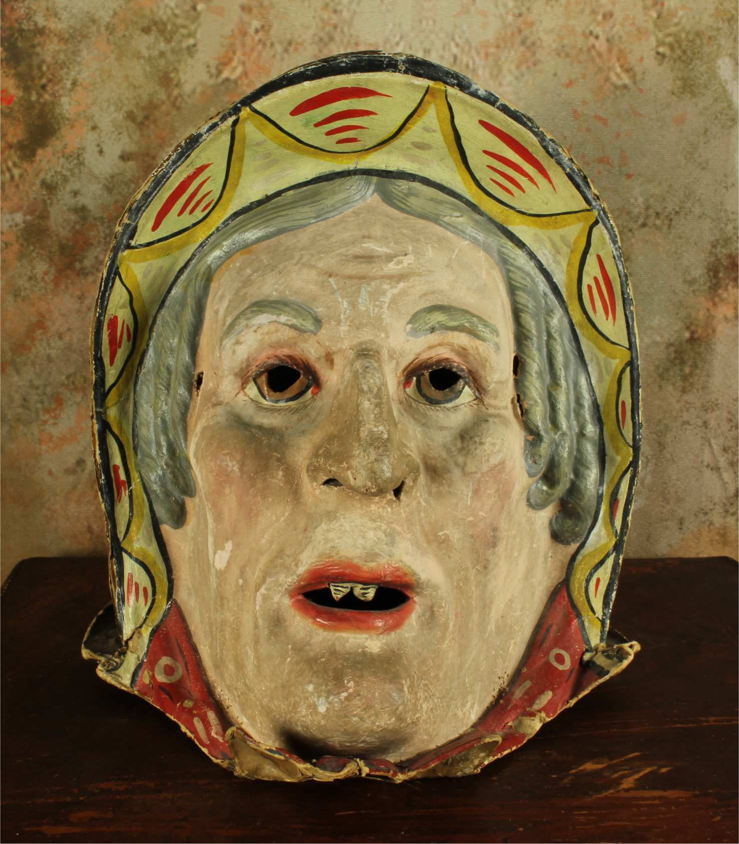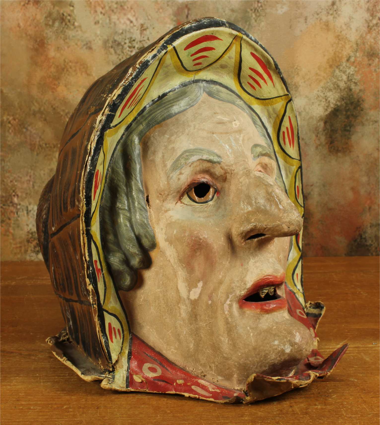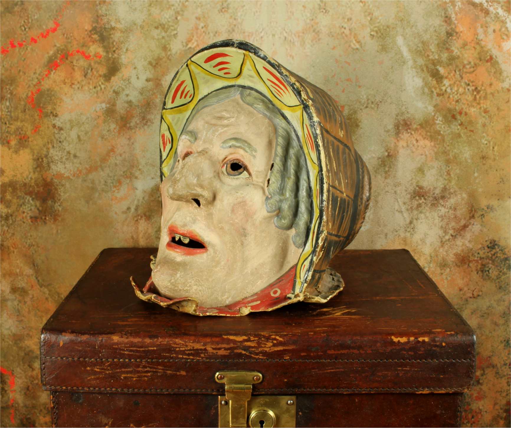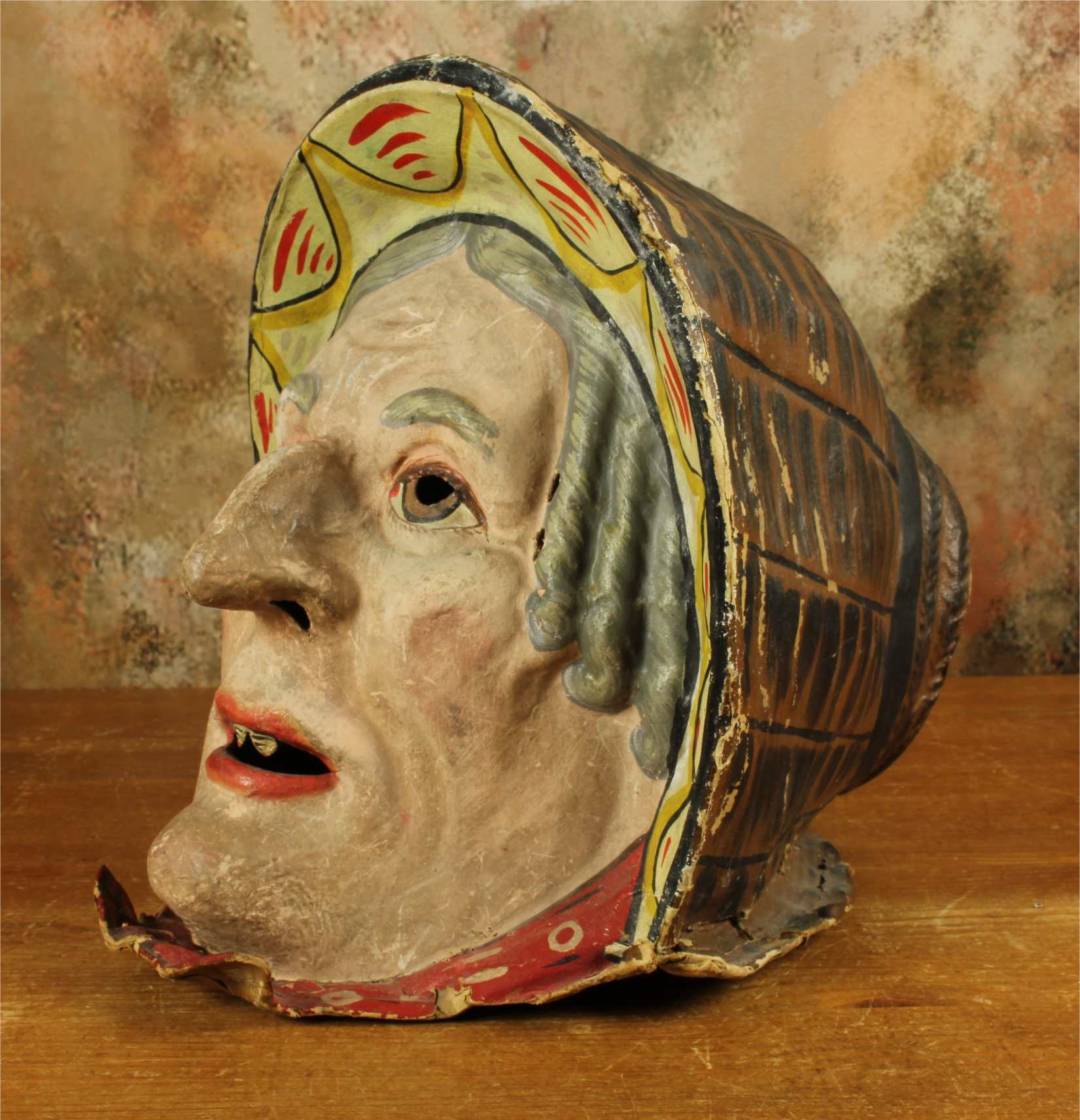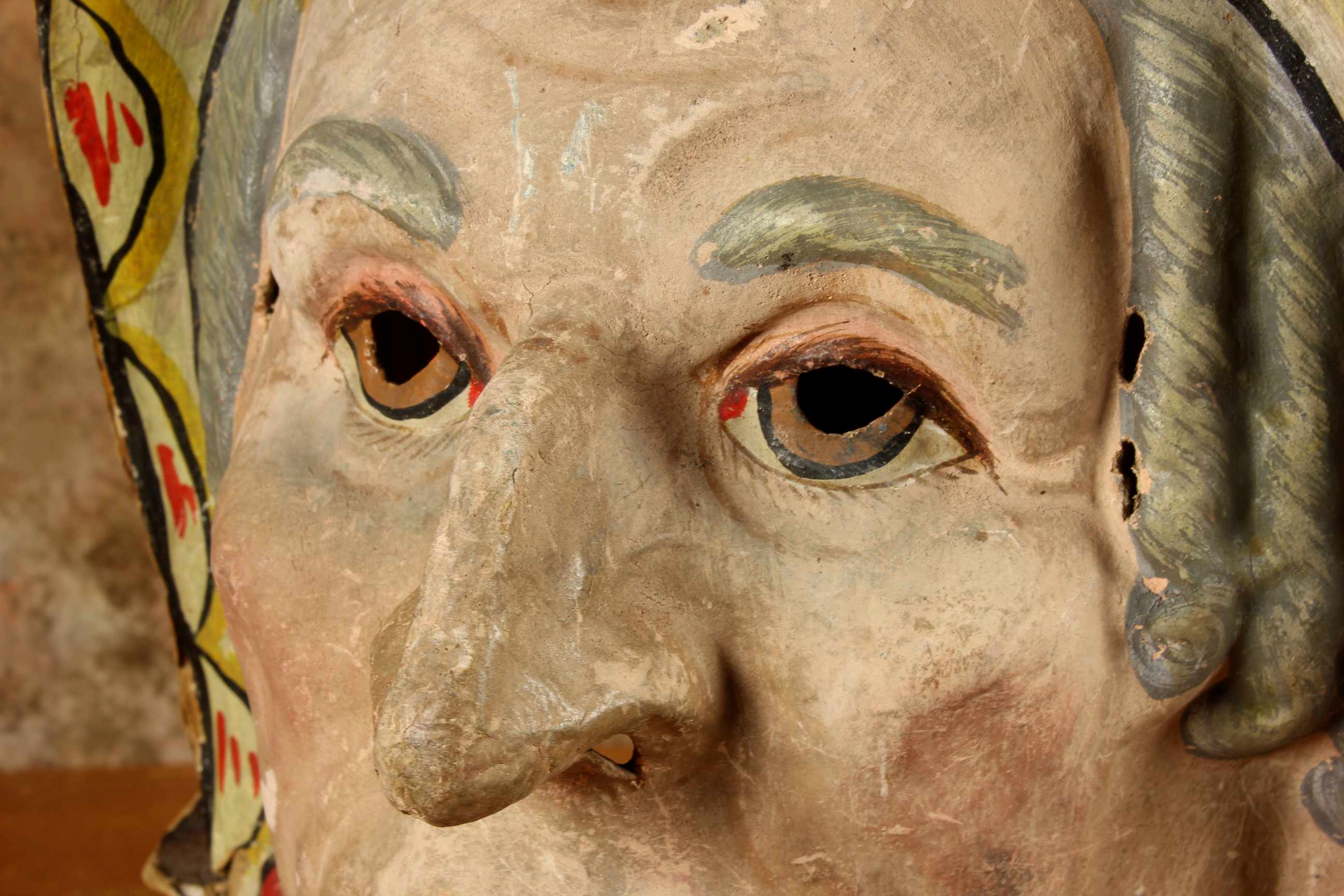 This stunning antique carnival mask which is made of papier mache dates from the early 20th century, originates from Europe and is in the form of an old lady's head.