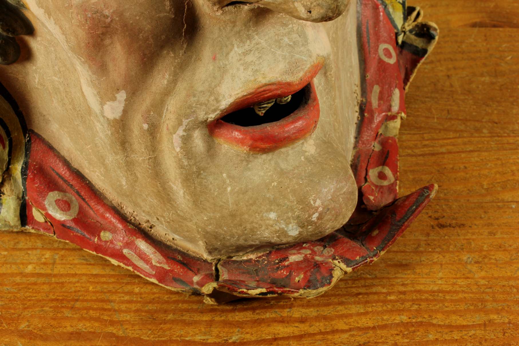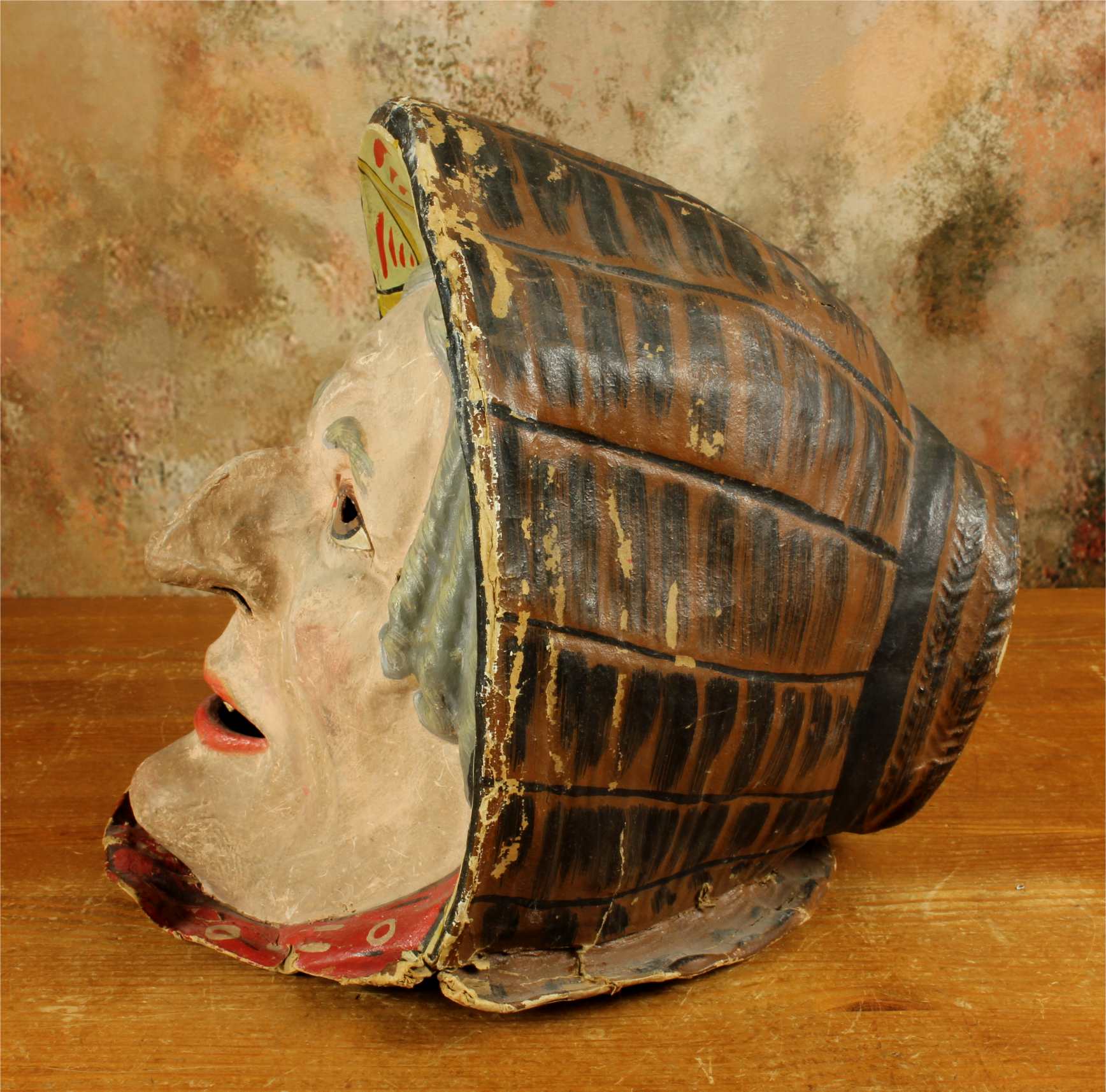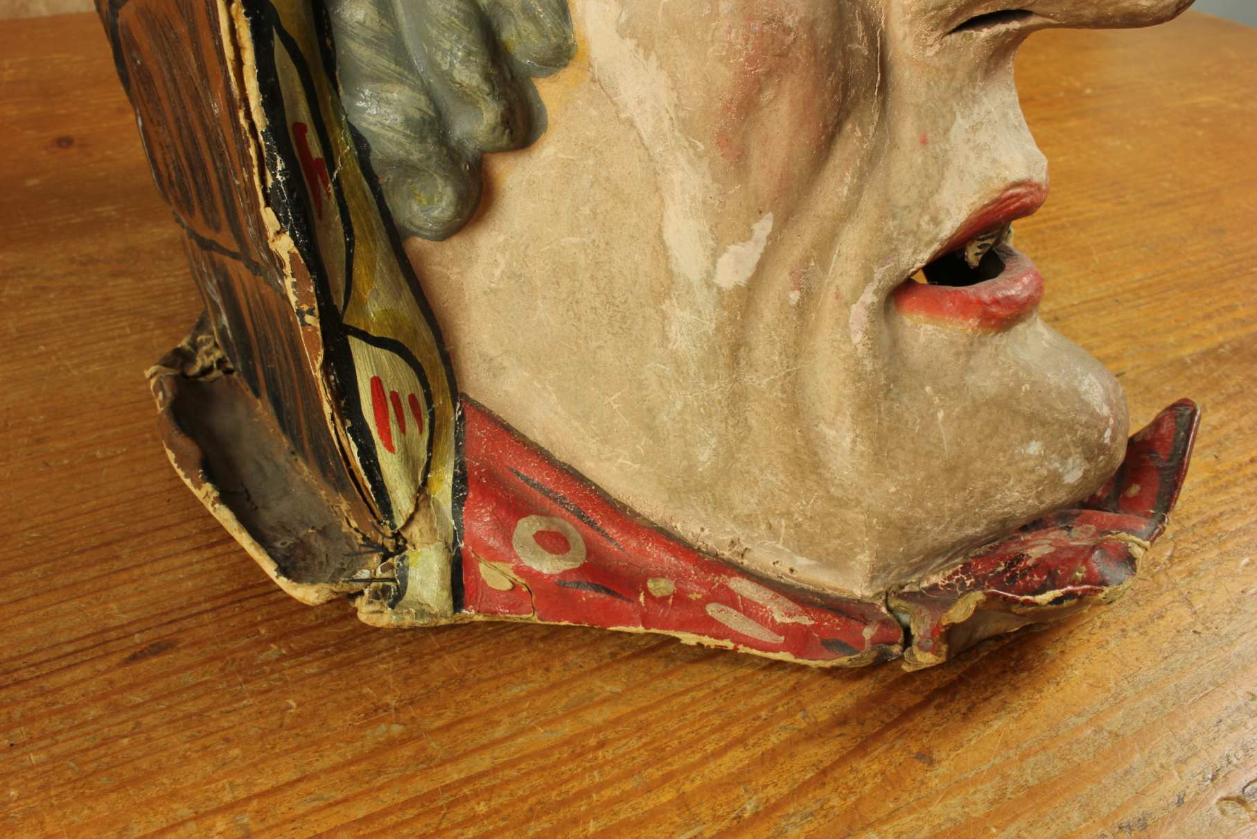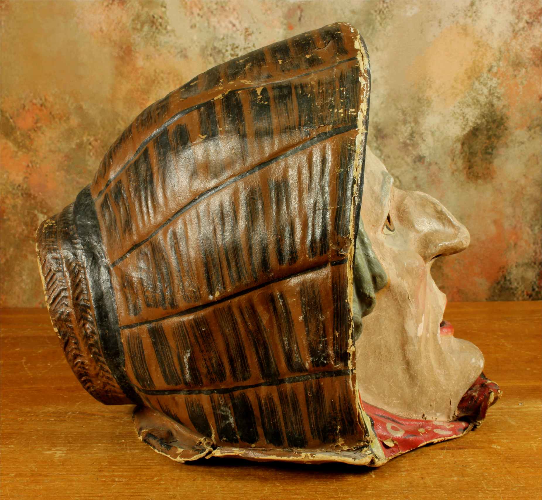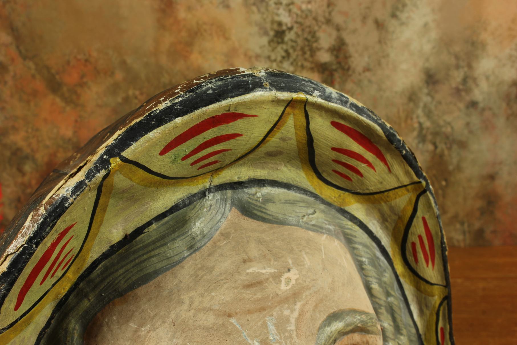 This stunning antique carnival mask which is made of papier mache dates from the early 20th century, originates from Europe and is in the form of an old lady's head.