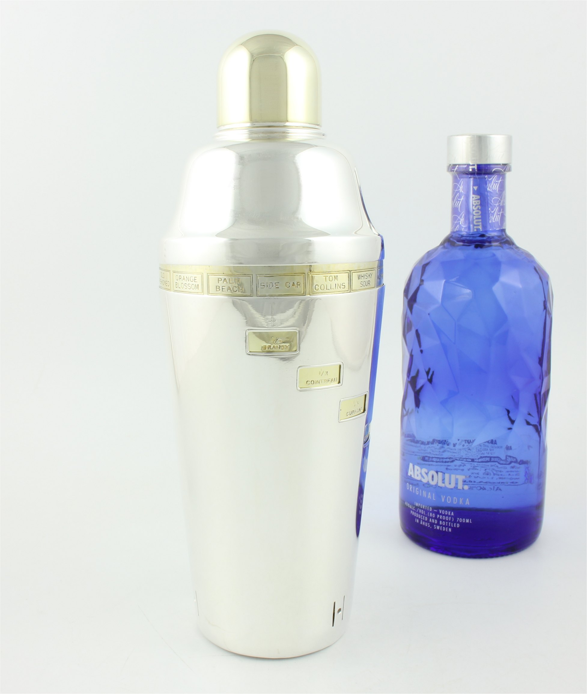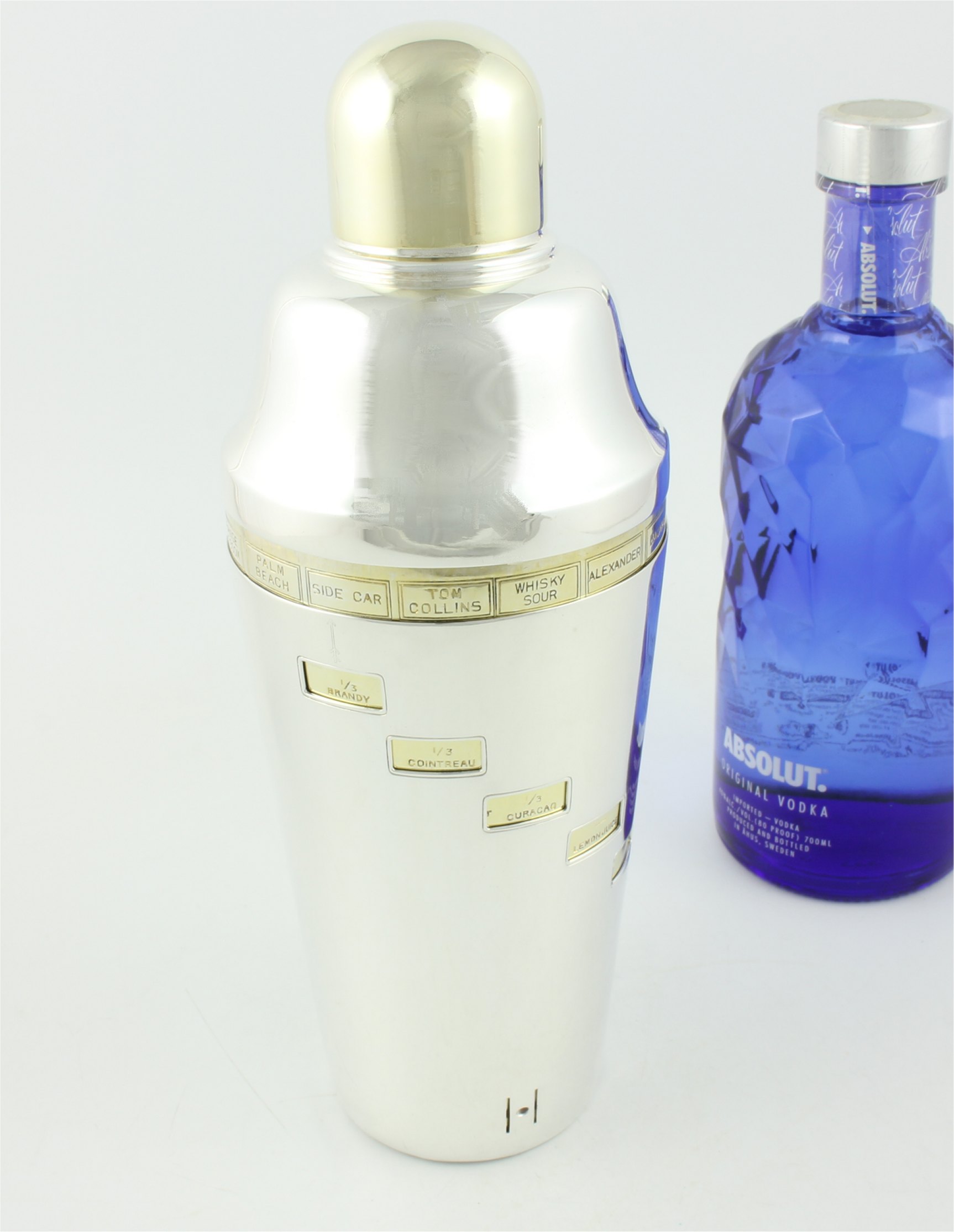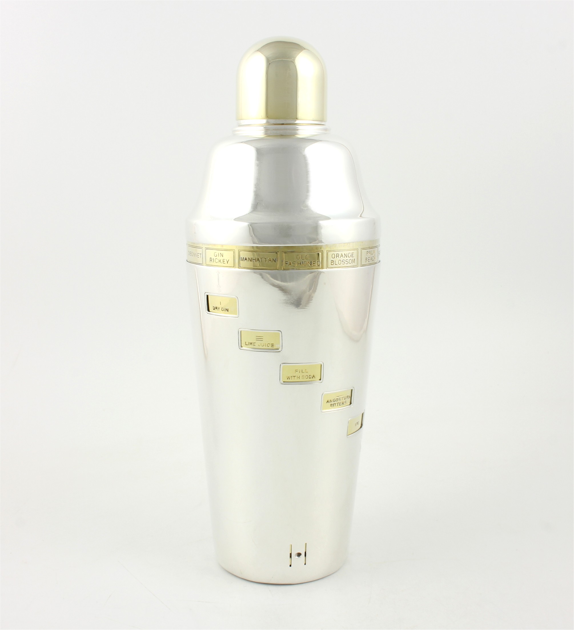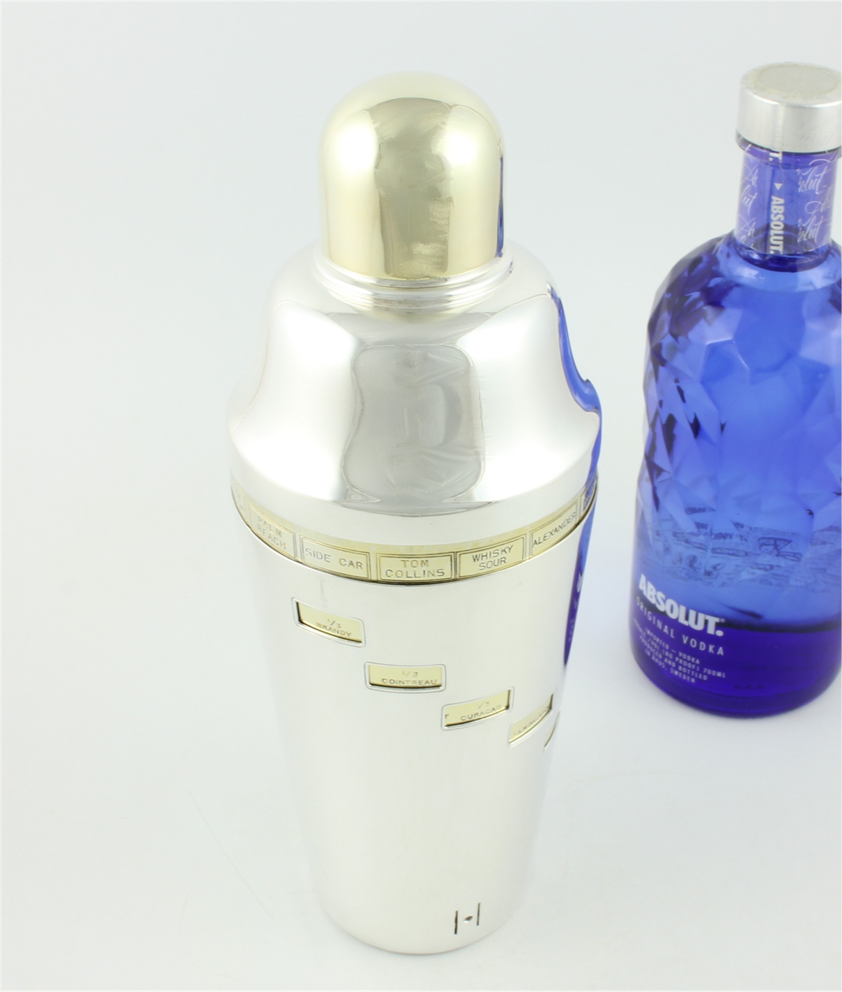 This Art Deco cocktail shaker which is a nice large size shows 15 cocktail choices engraved around the body. Once you have chosen your cocktail by pointing to it with the arrow, the ingredients are shown in the windows below.