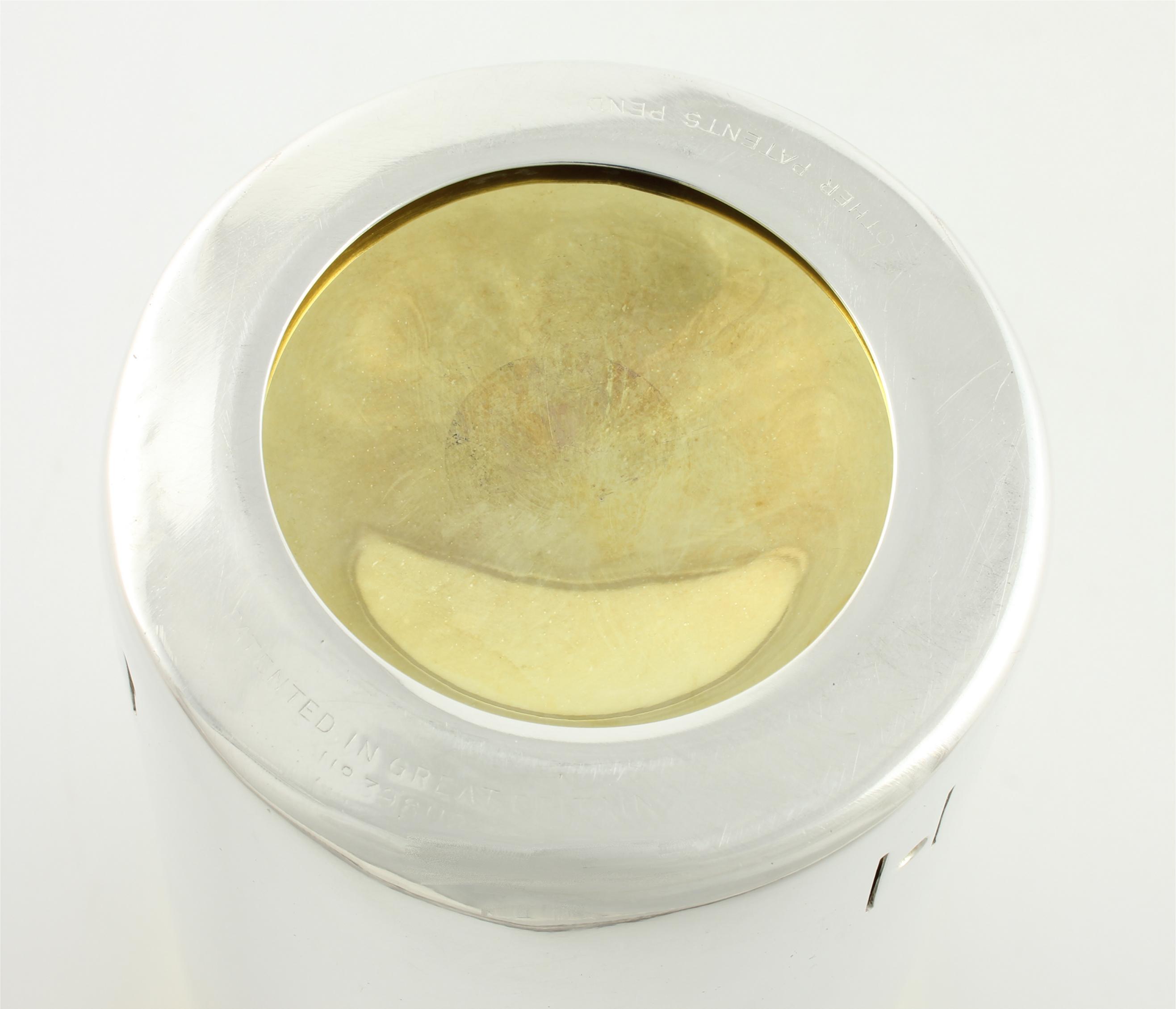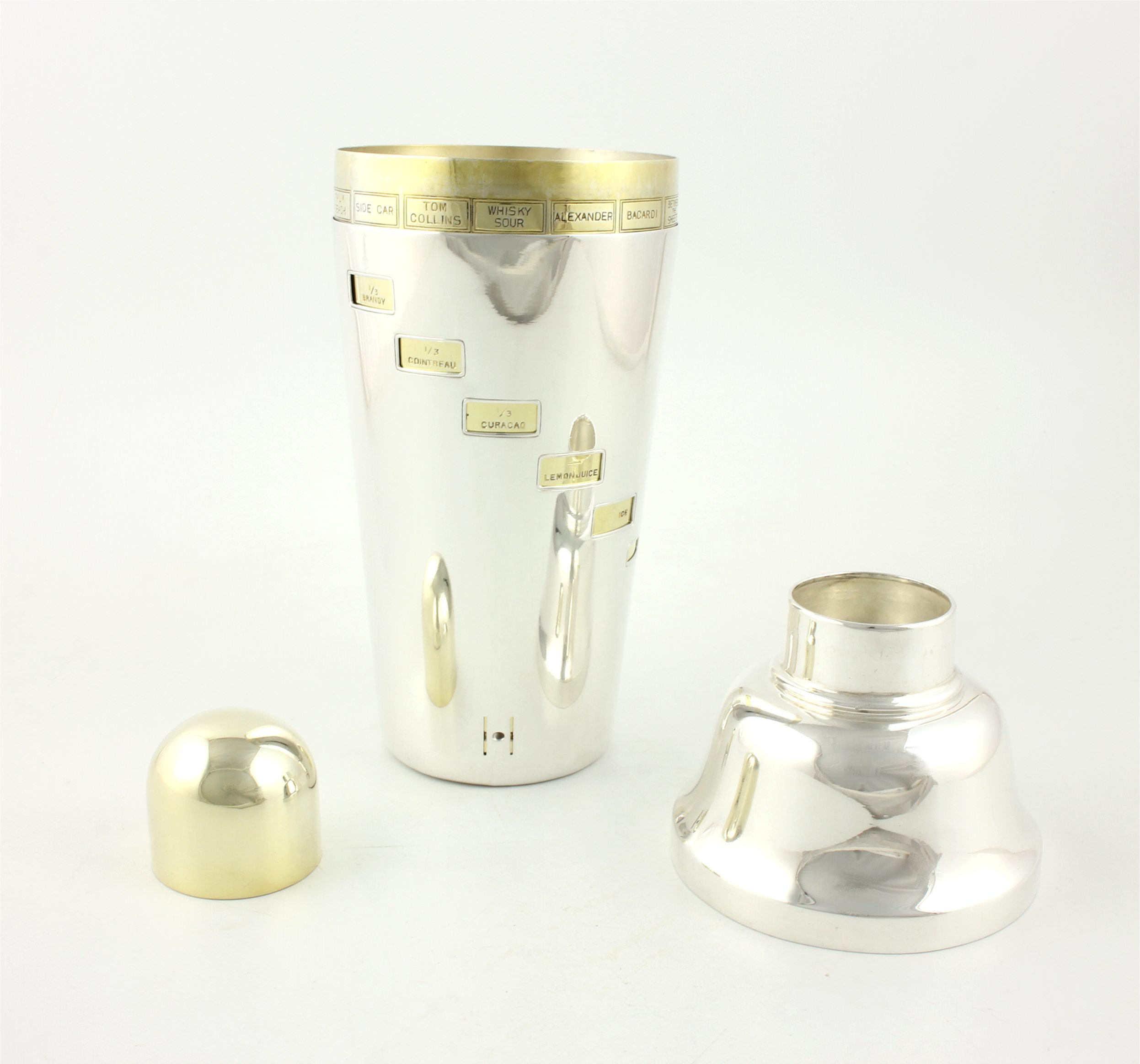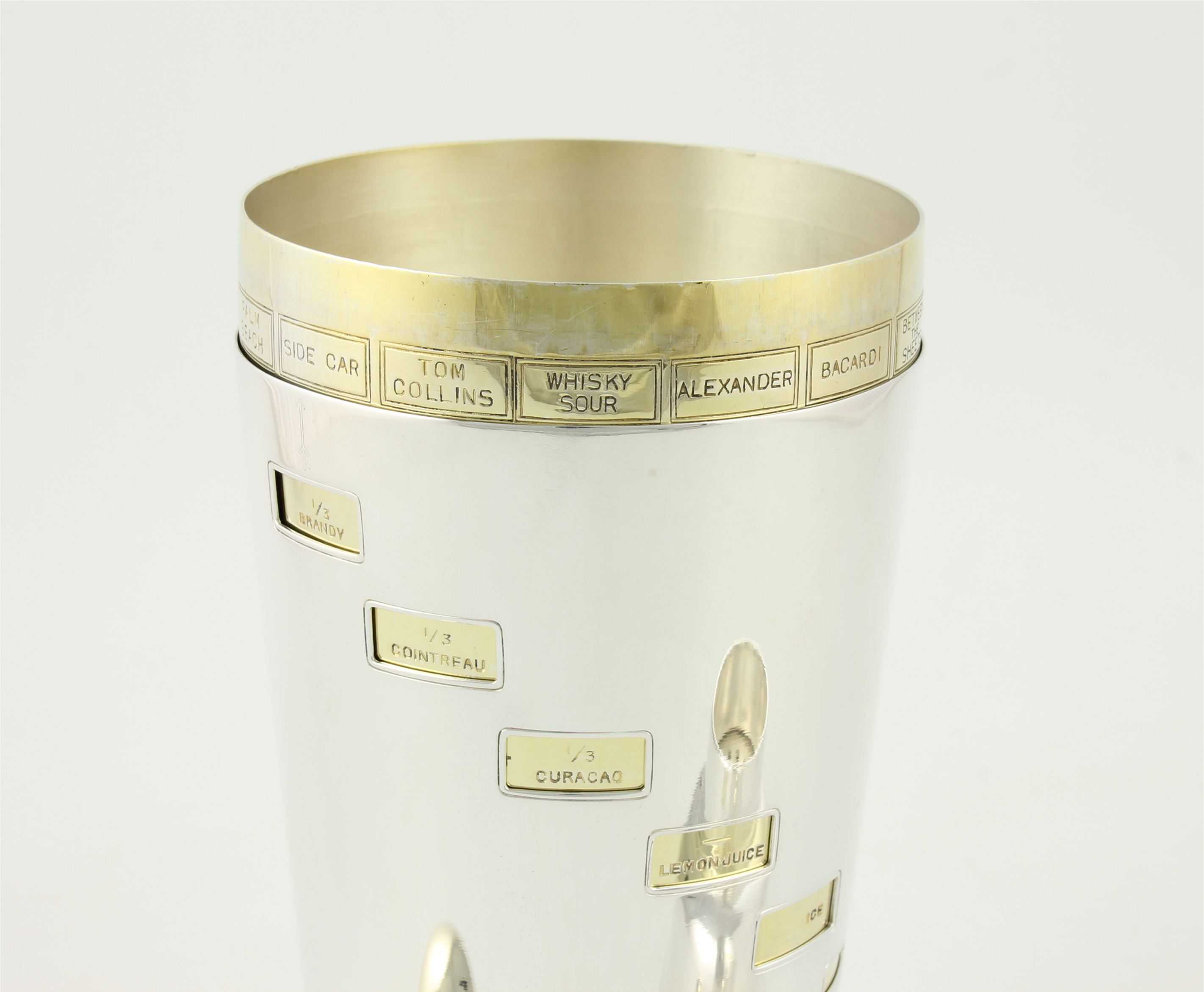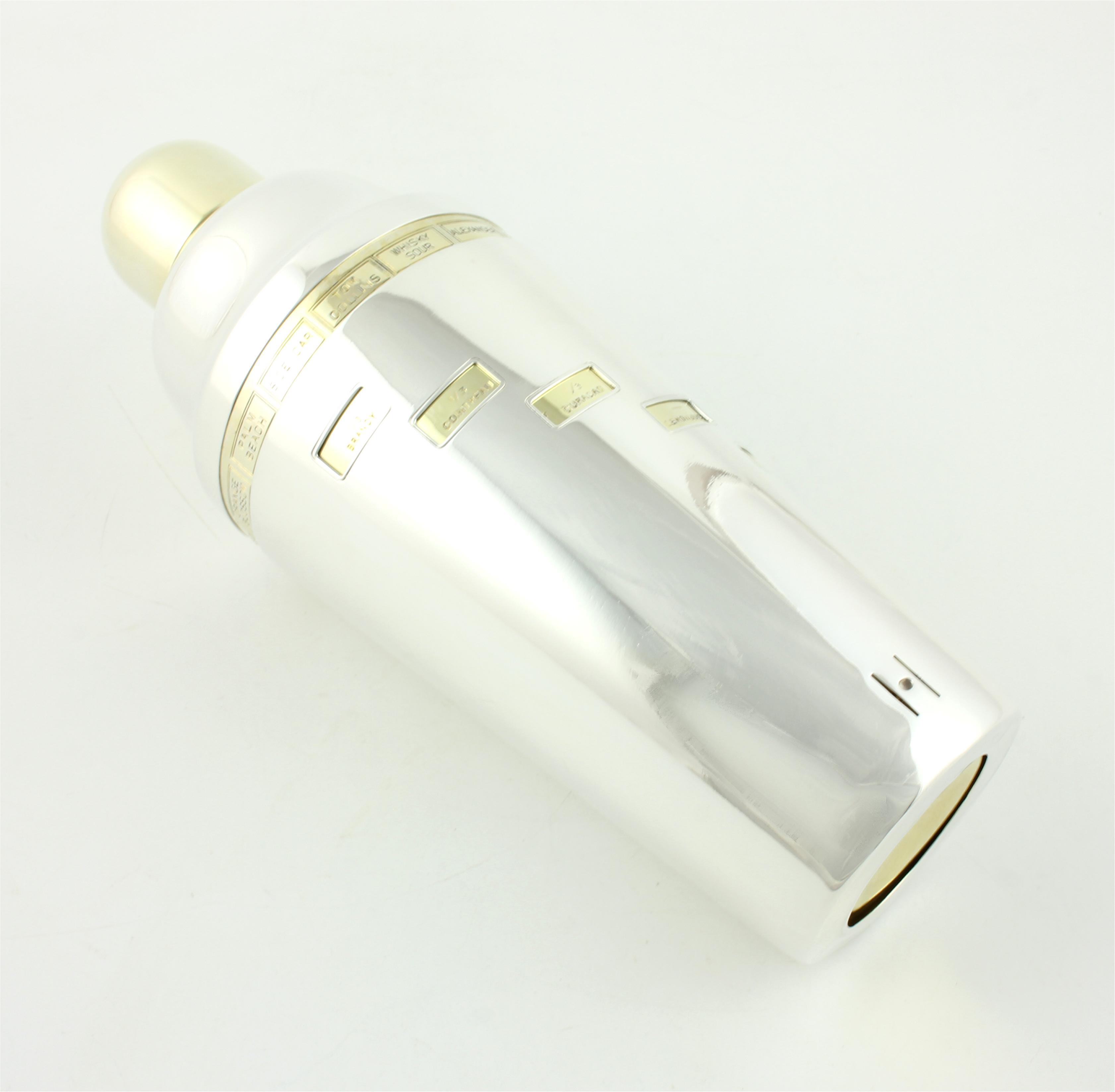 This stylish four piece Dial a Drink recipe cocktail shaker which is in wonderful original condition features a silver plated sleeve which fits over the gilded body, has a silver plated top strainer section, lightly gilded lid and is marked to the underside with Patented in Great Britain. Number 398119. Other Patents Pending.