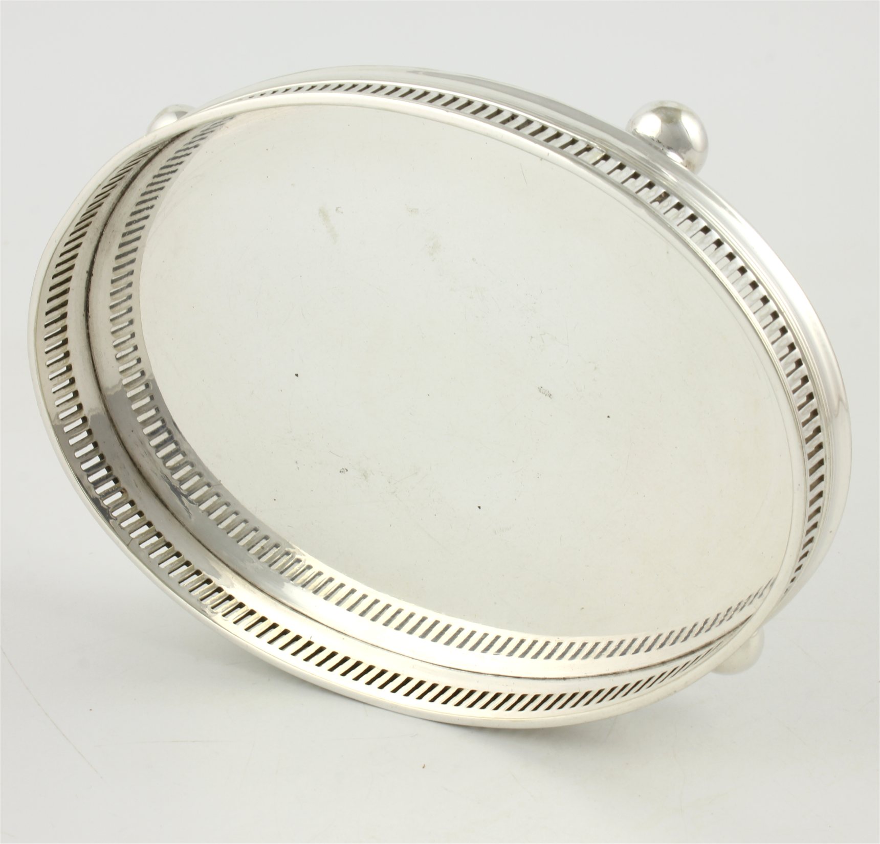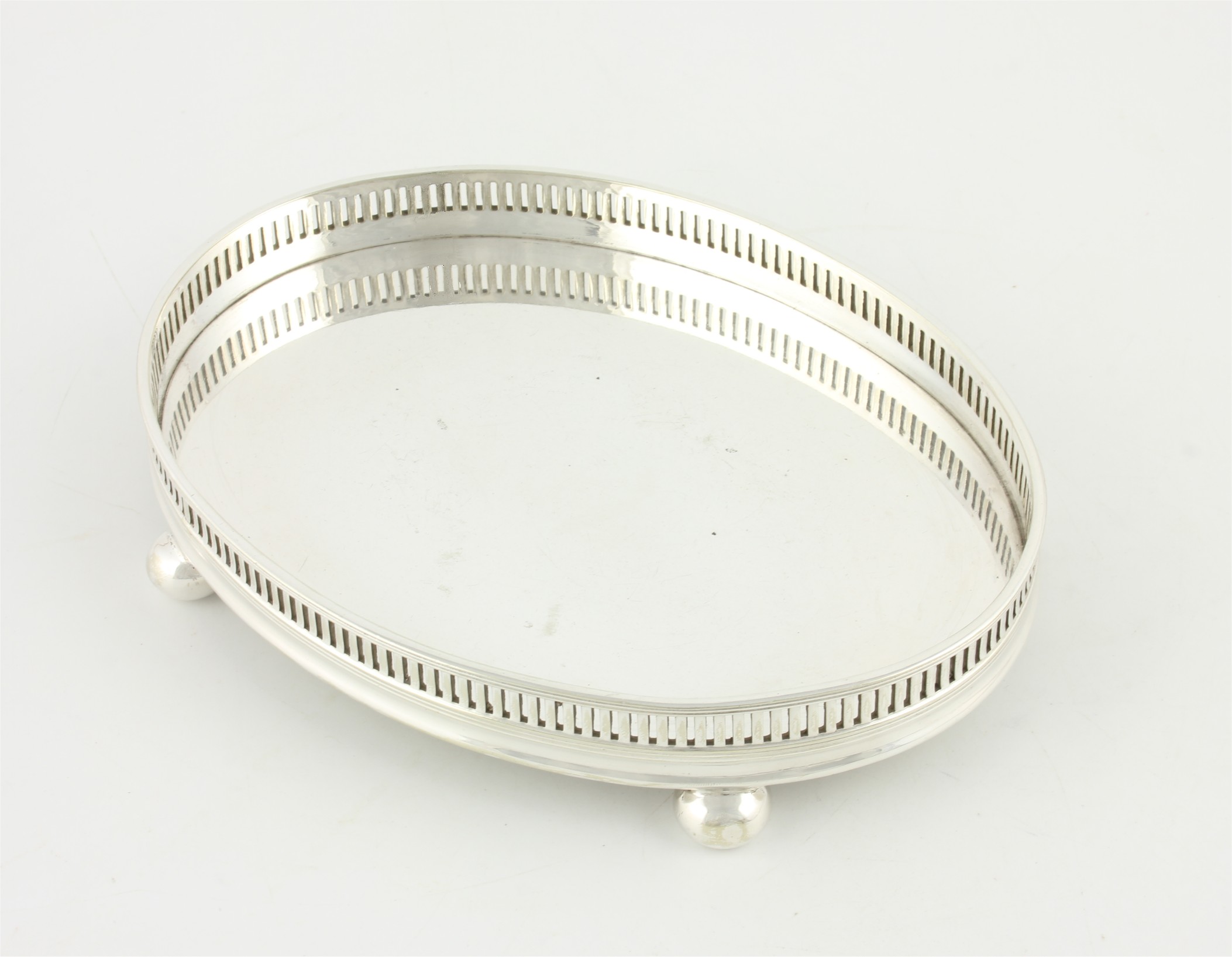 This charming drinks coaster which is in the form of a miniature oval gallery tray is made of silver plate, dates from the early 20th century and is marked to the base with it's maker's marks.