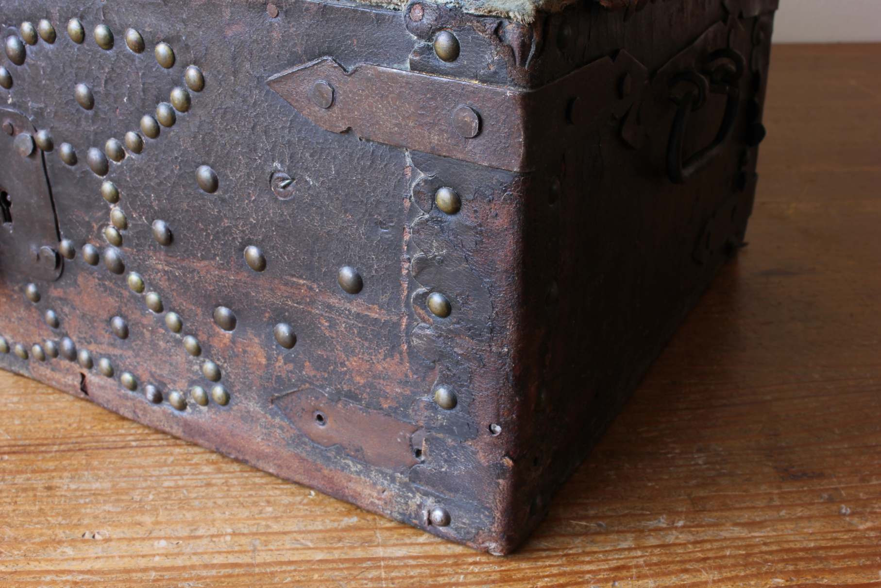Condition: Very good antique condition with signs of use in keeping with age. Some losses and wear to leather. Some missing studs and metalwork. Box can be opened and locked using the key which is not original. Please see pictures.