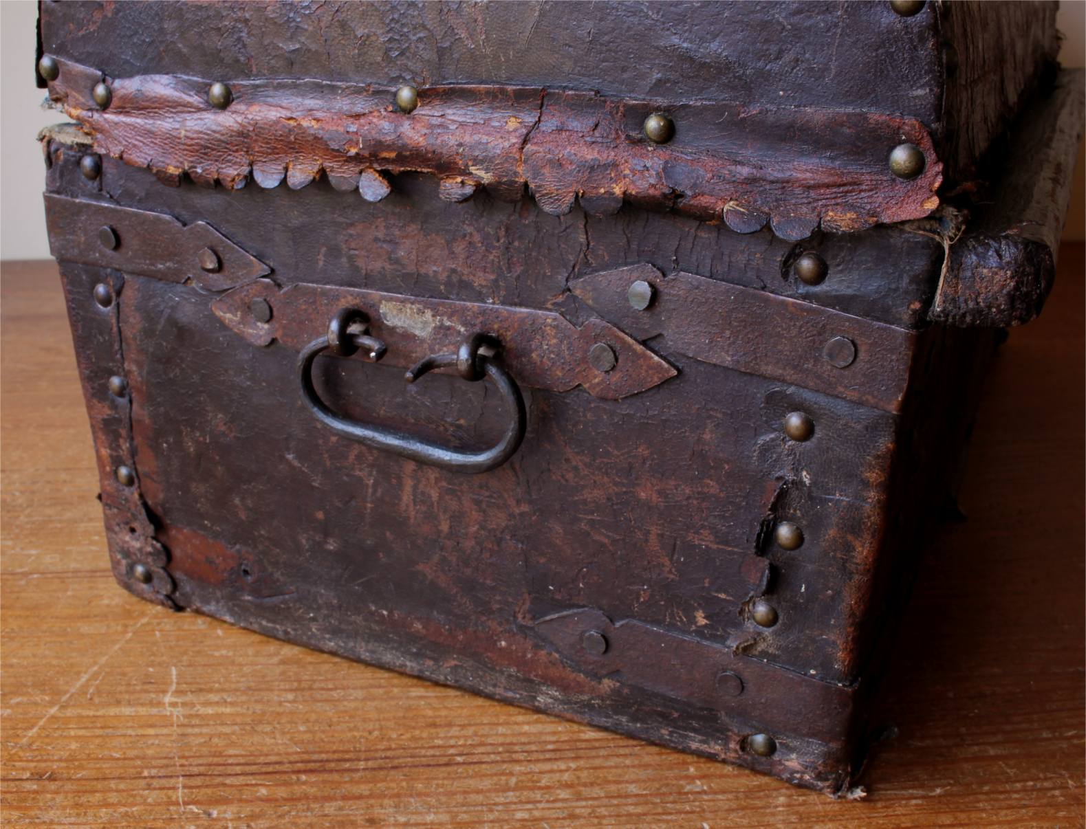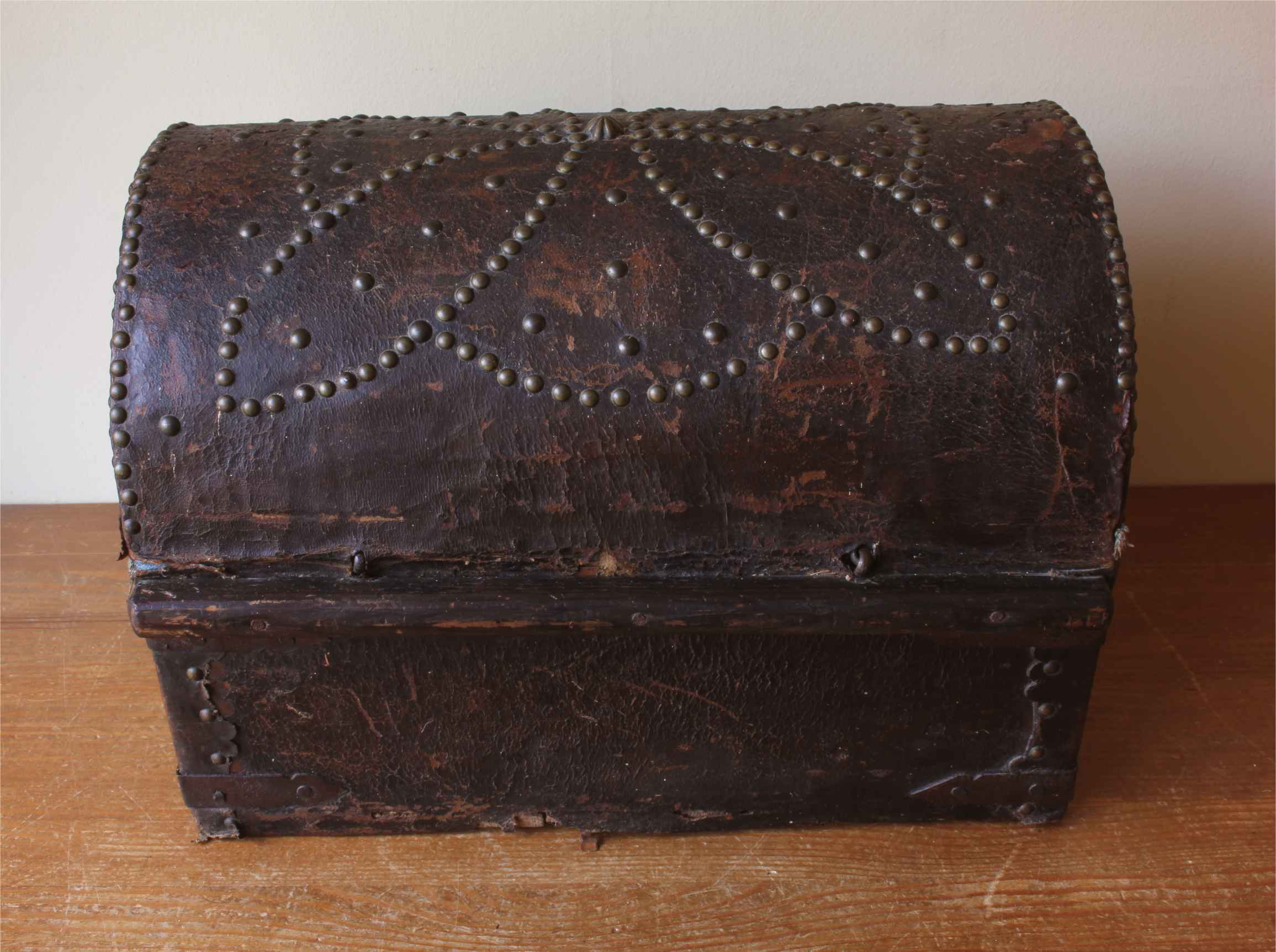 This fabulous Spanish brown leather trunk with beautiful brass stud-work which includes floral studs has a domed lid and dates from the late 17th / early 18th century.