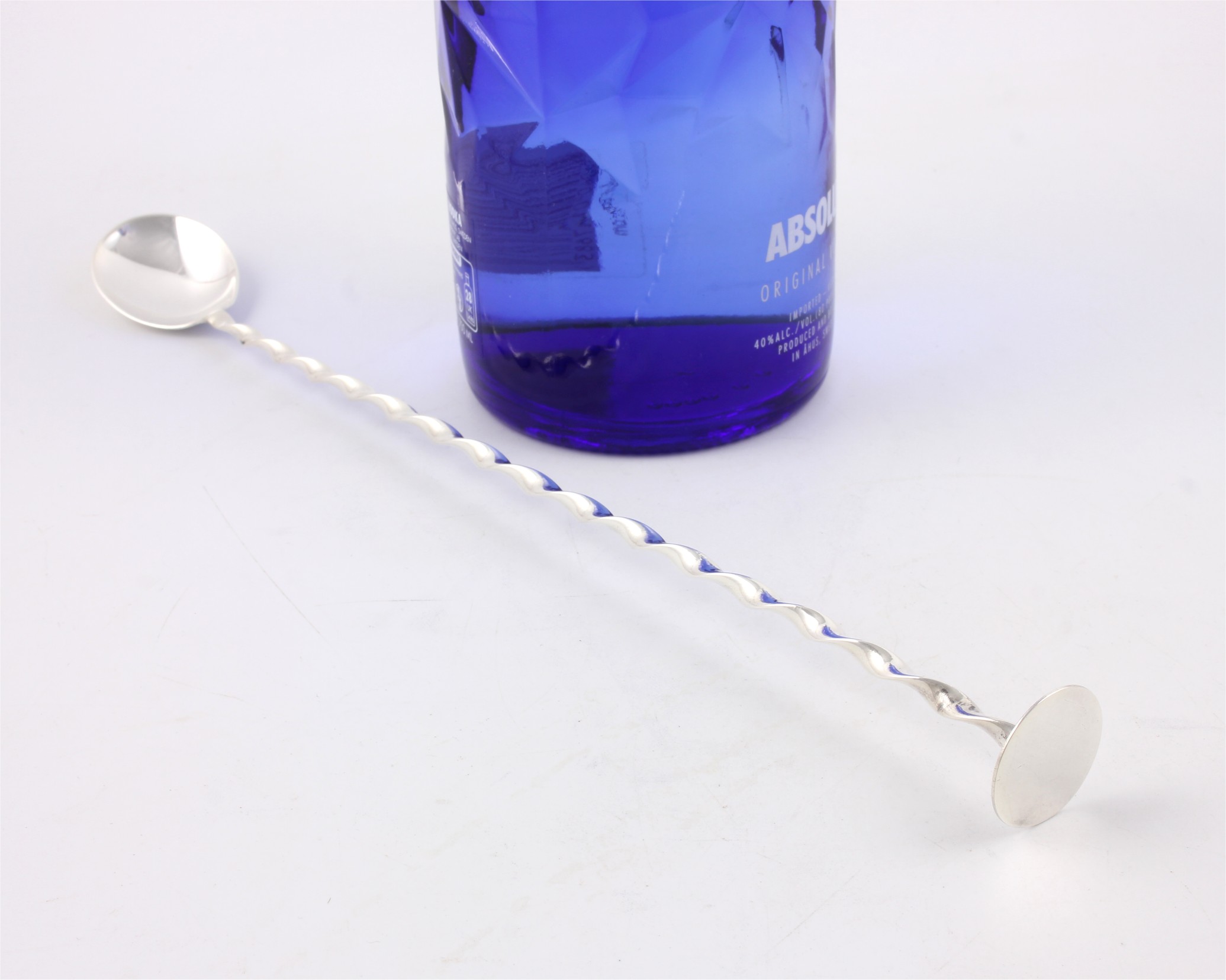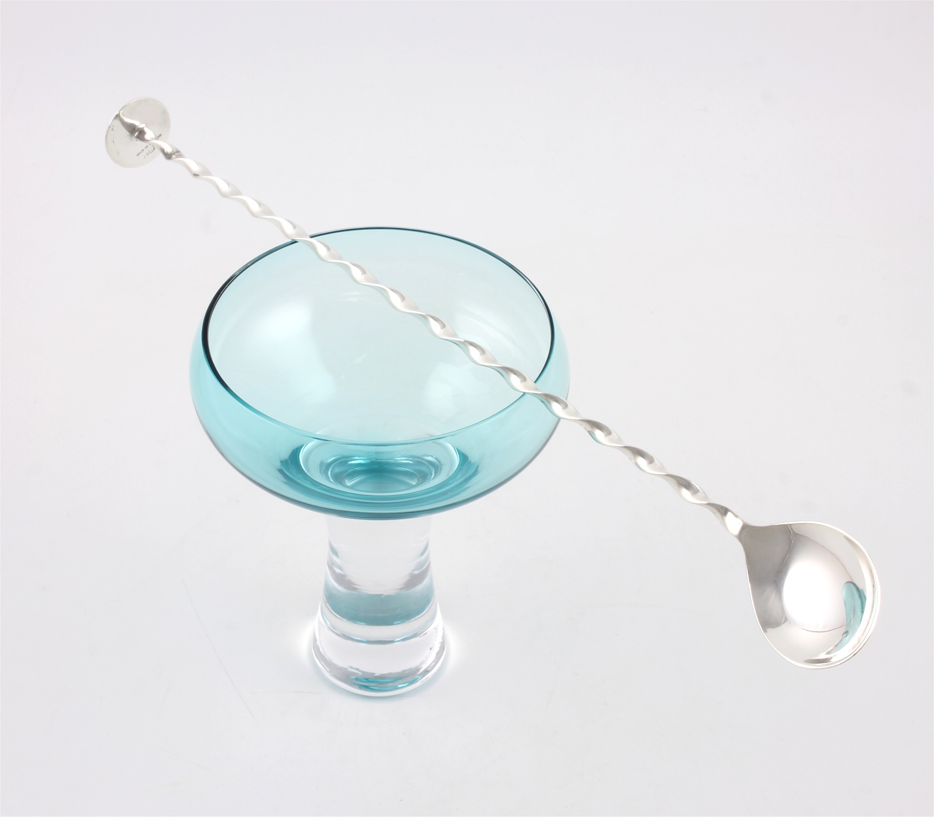 This long silver plated cocktail stirrer spoon which dates from c1920 is by Charles S Green & Co Ltd, has a twisted design with a spoon to one end and a flat muddler for crushing your cocktail ingredients at the other.