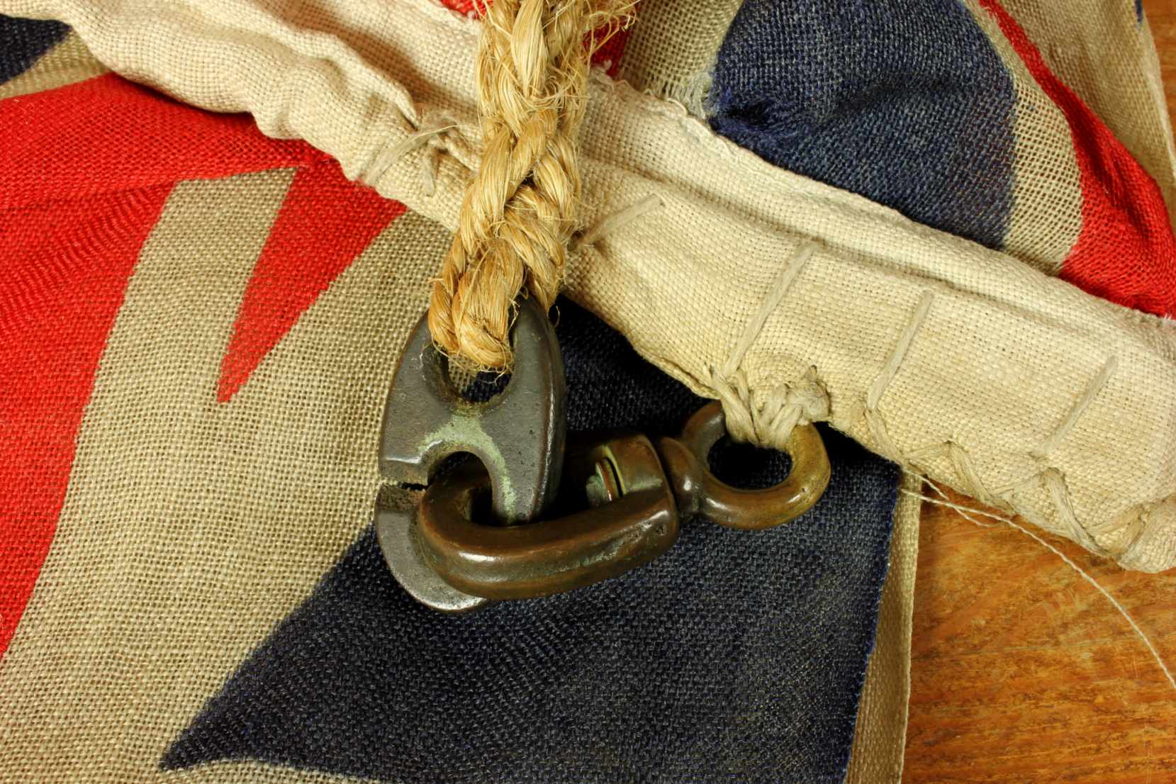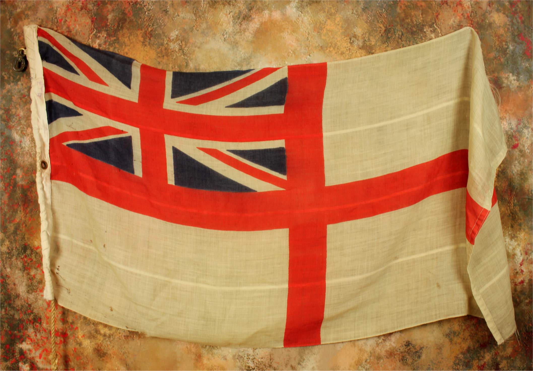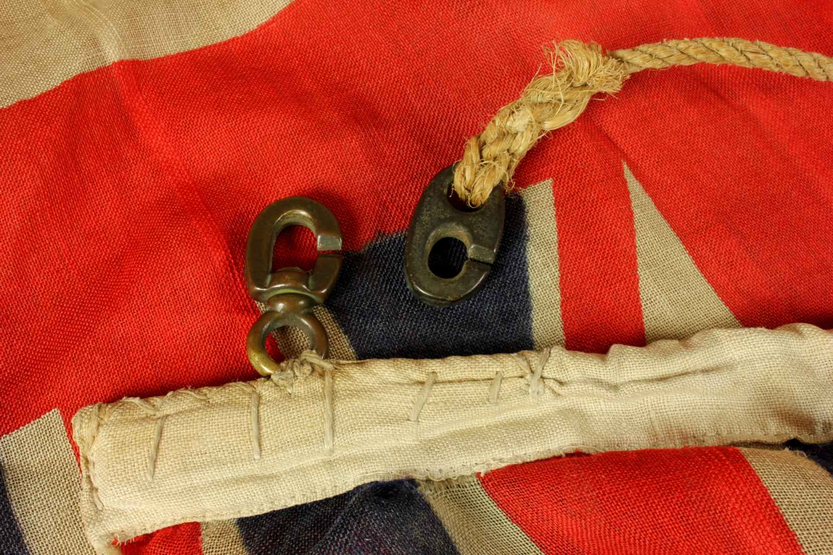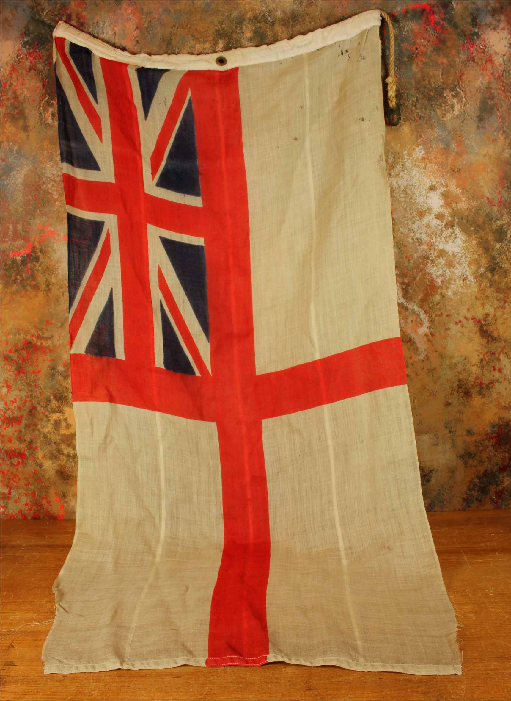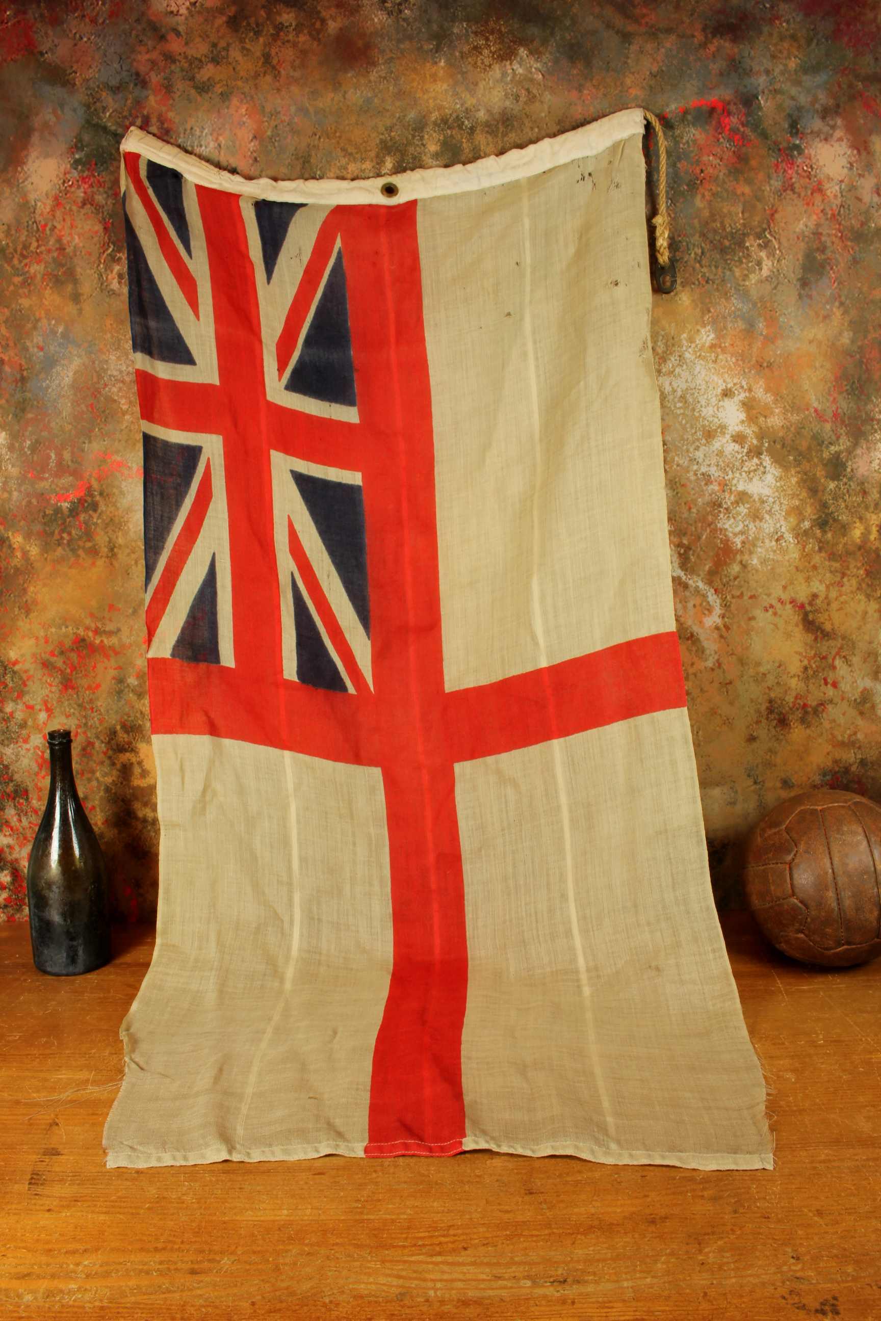 This antique British White Ensign Flag which is made of quality linen dates from c1900, has a halyard rope with bronze metal fittings and would have been used on the rear of a ship or boat.