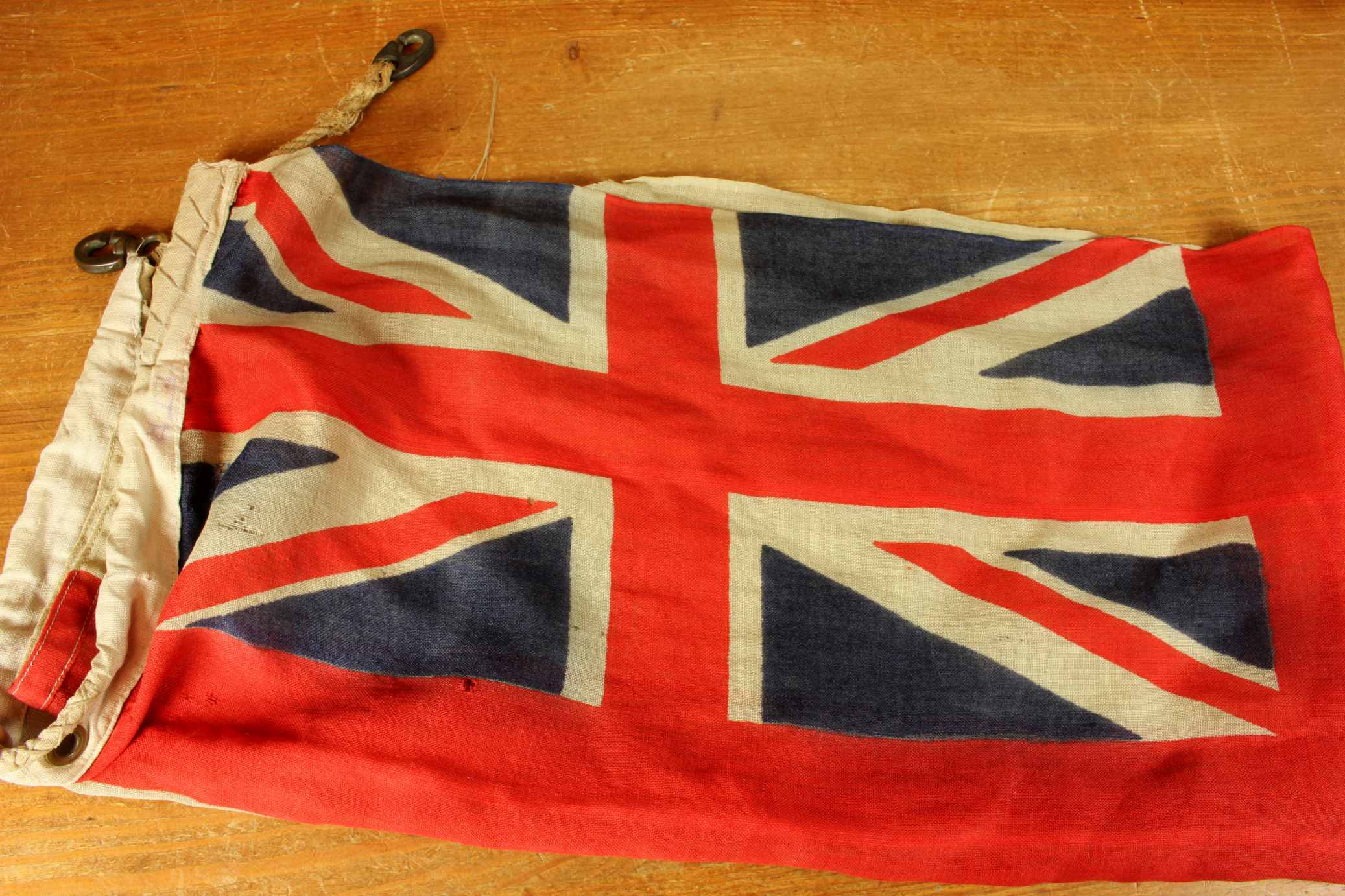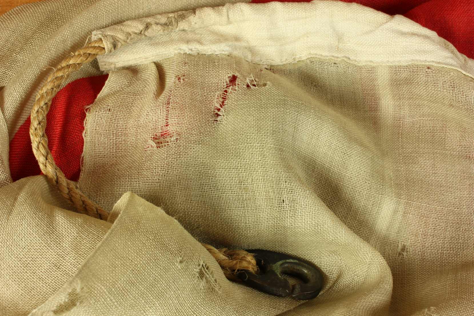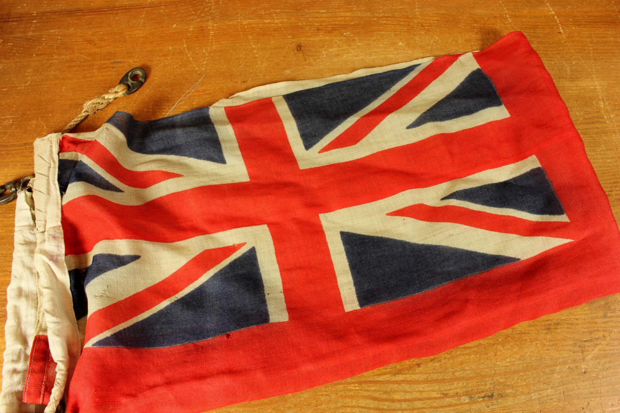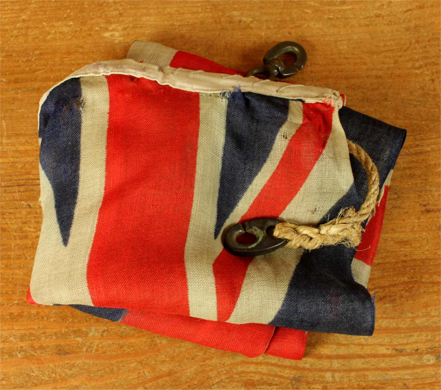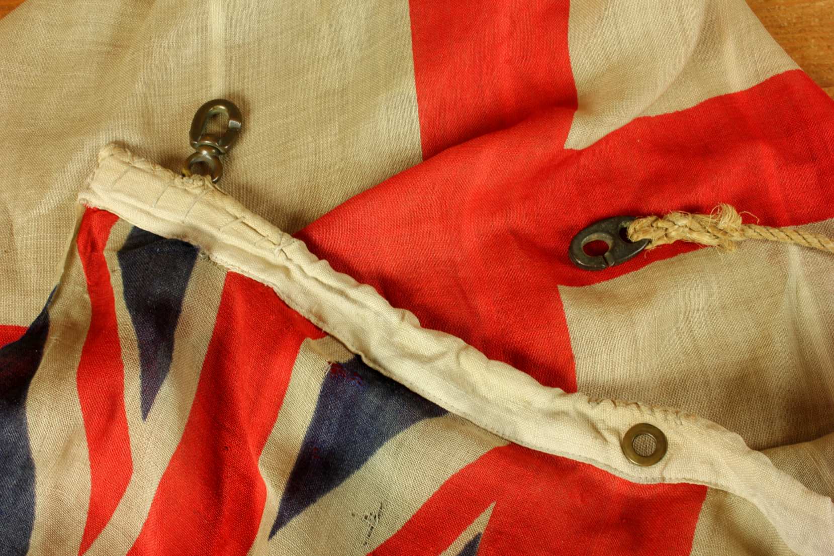 This antique British White Ensign Flag which is made of quality linen dates from c1900, has a halyard rope with bronze metal fittings and would have been used on the rear of a ship or boat.