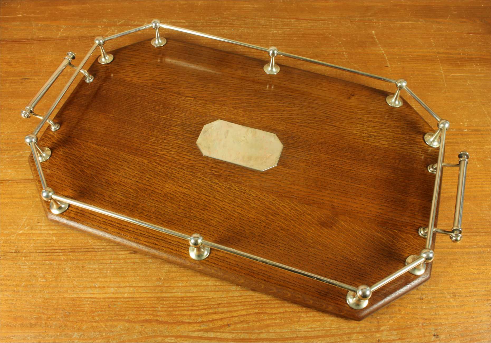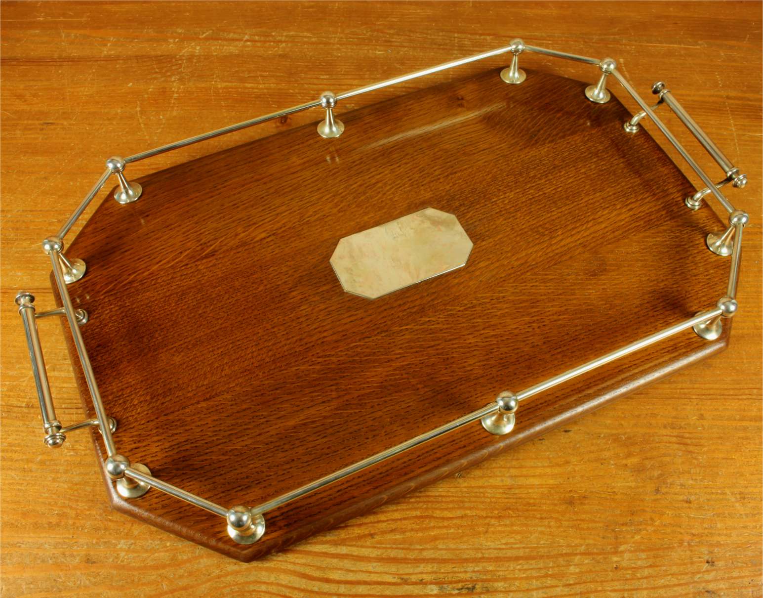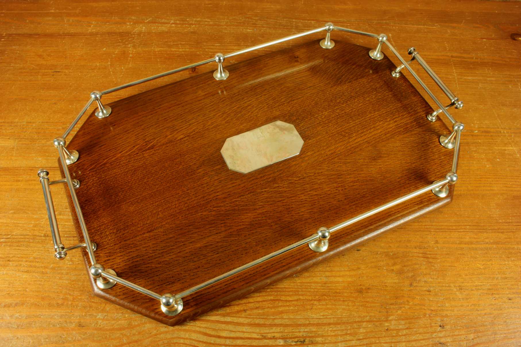 This handsome octagonal gallery tray which is made of English oak is an extra large size tray that has silver plated fittings and gallery rail, silver plate handles, has a central octagonal silver plated blank cartouche and sits on four wooden feet.