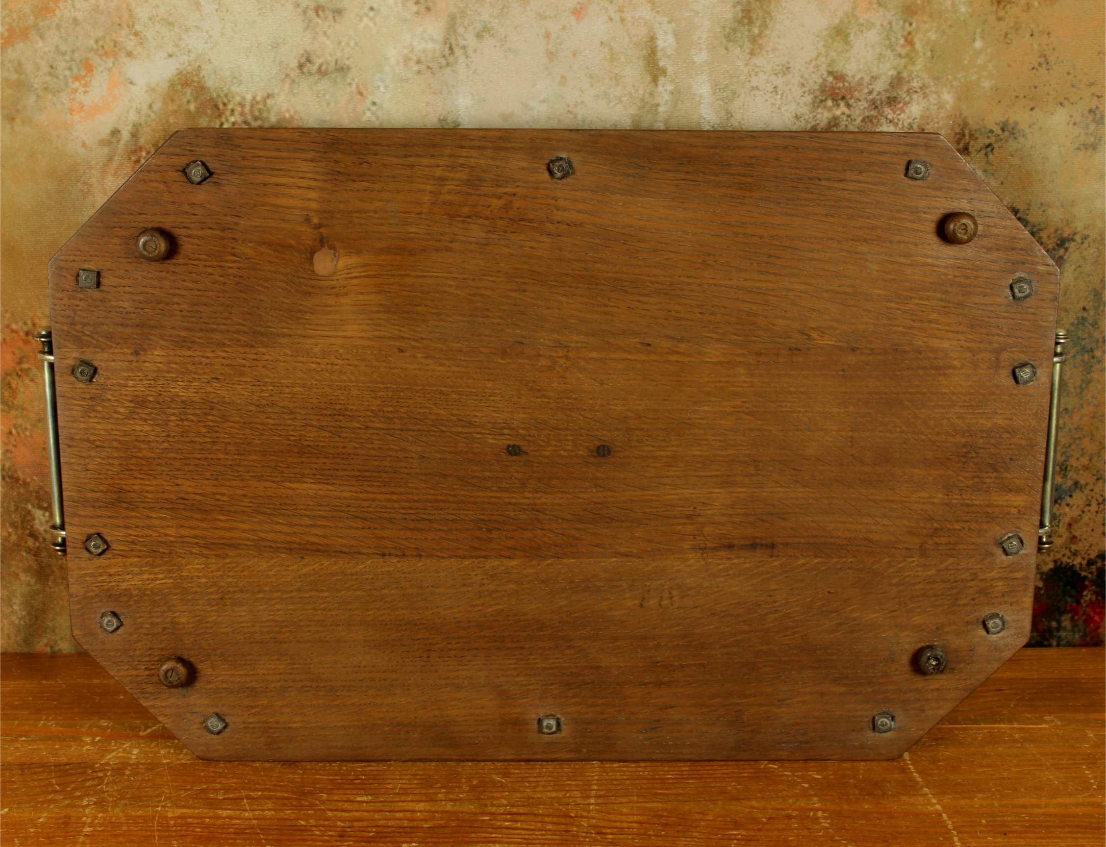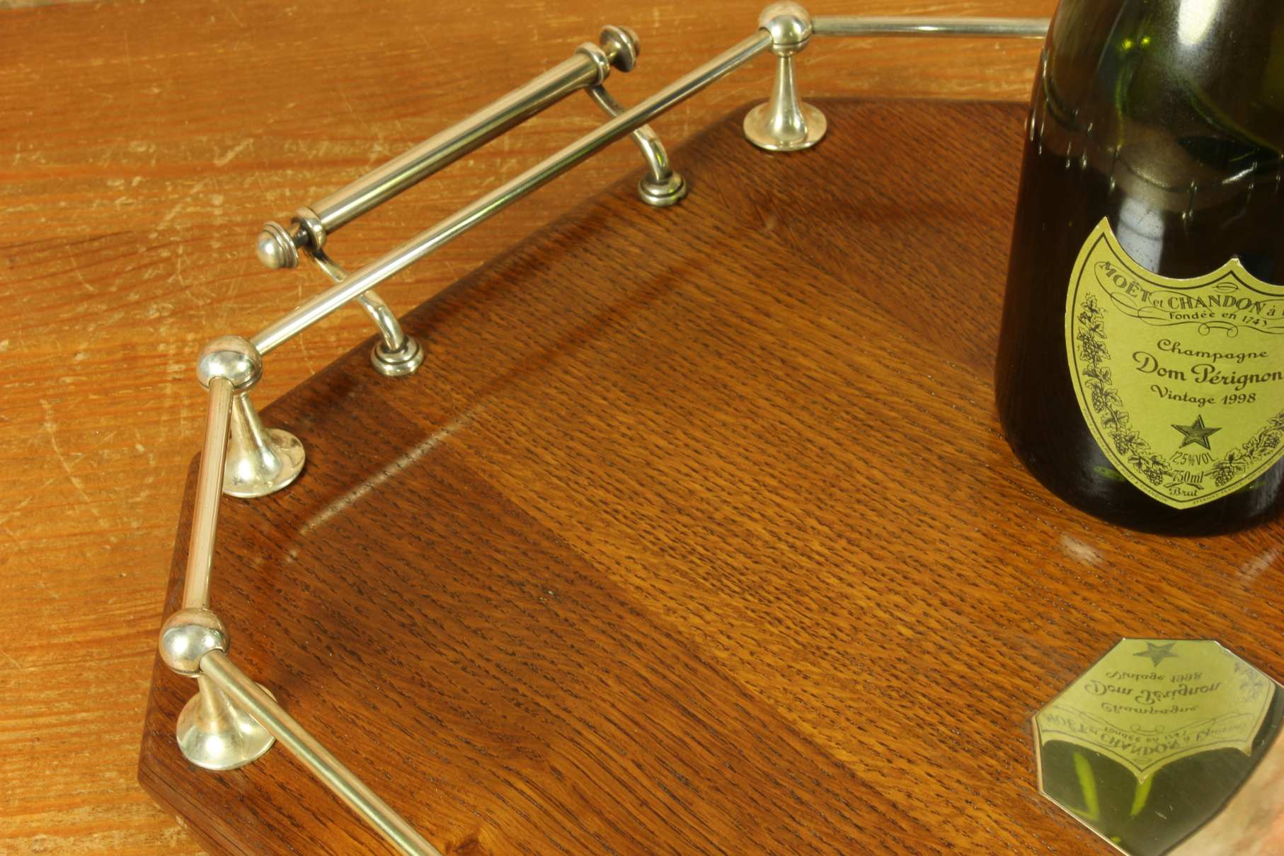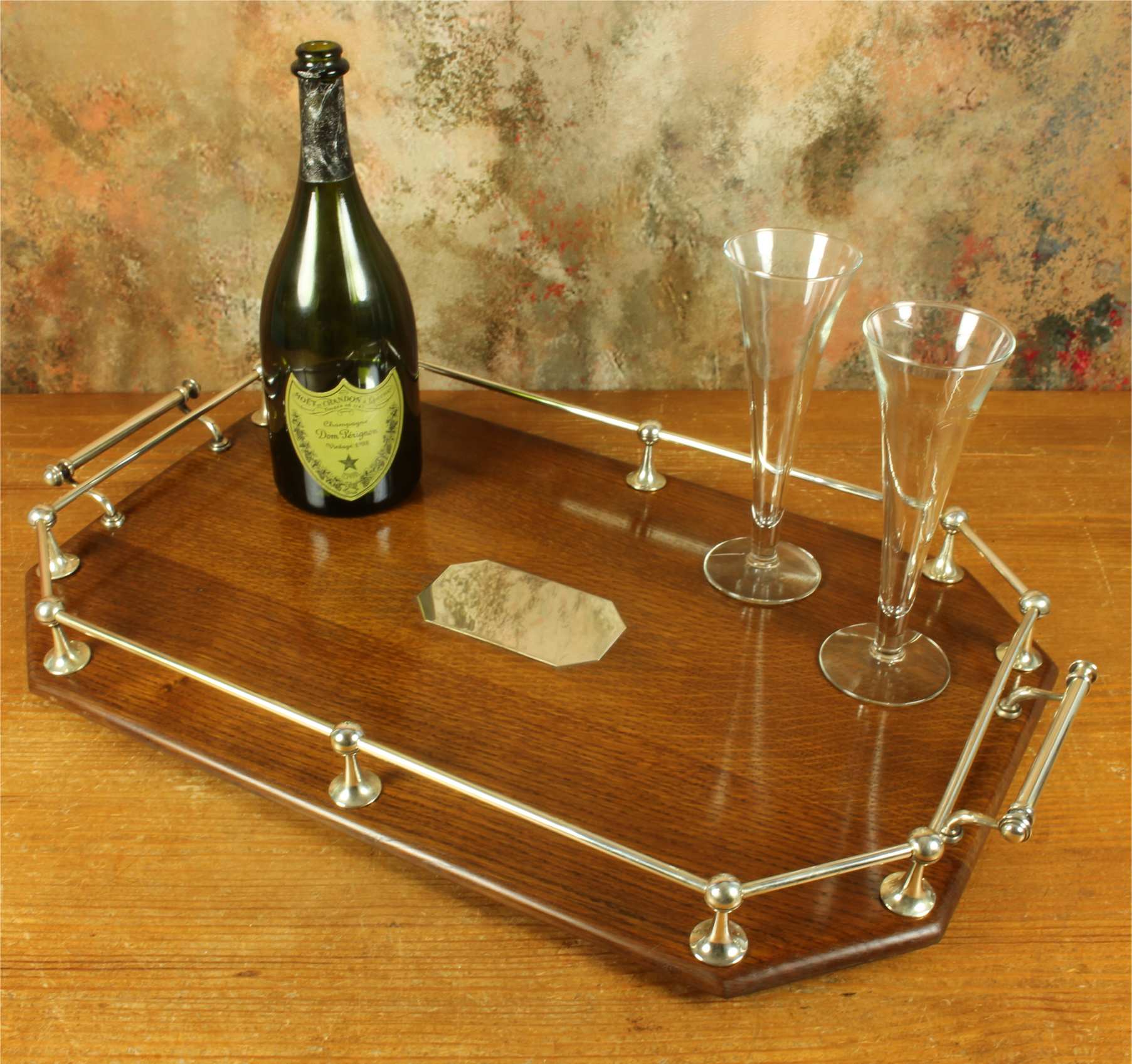 This handsome octagonal gallery tray which is made of English oak is an extra large size tray that has silver plated fittings and gallery rail, silver plate handles, has a central octagonal silver plated blank cartouche and sits on four wooden feet.