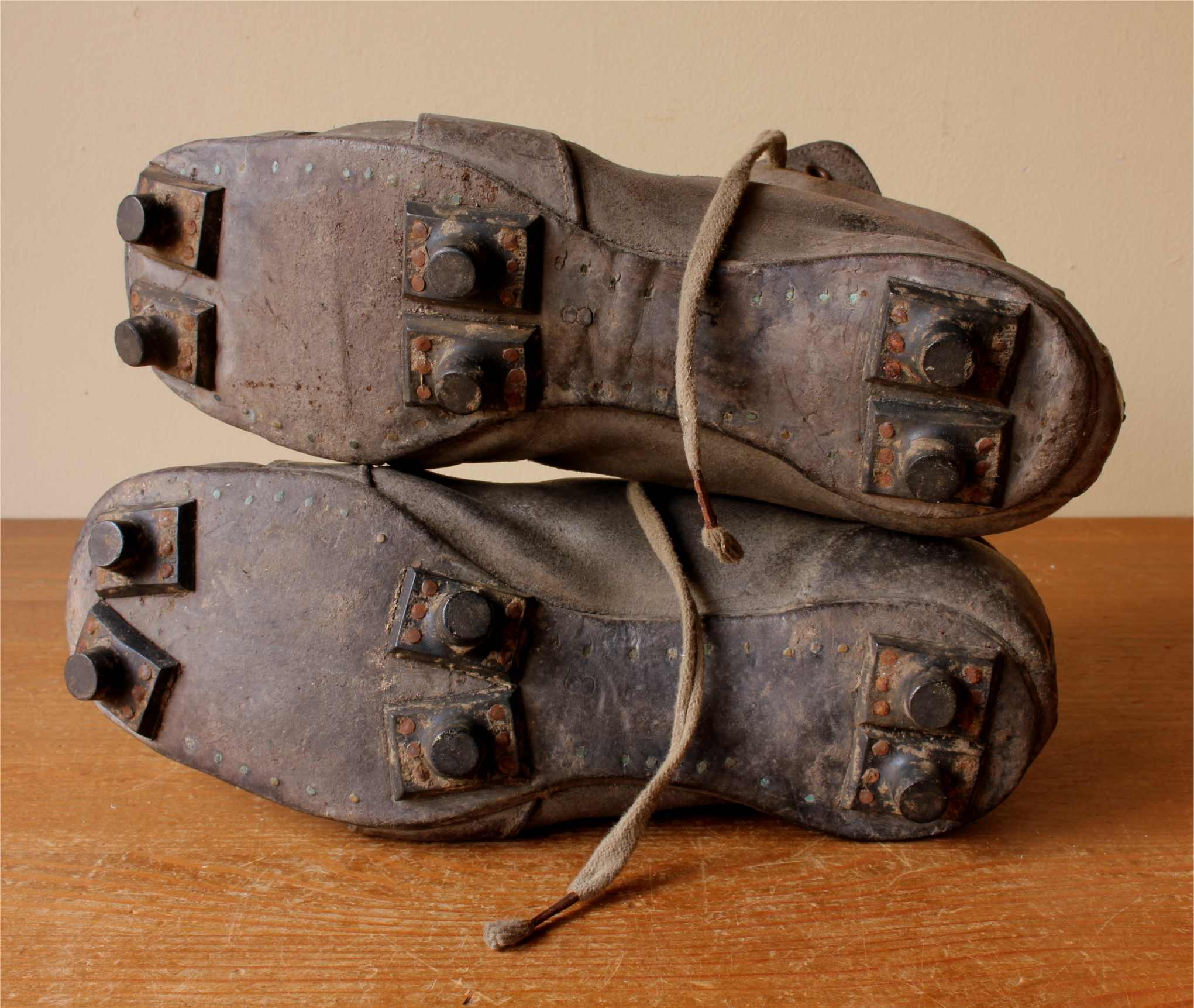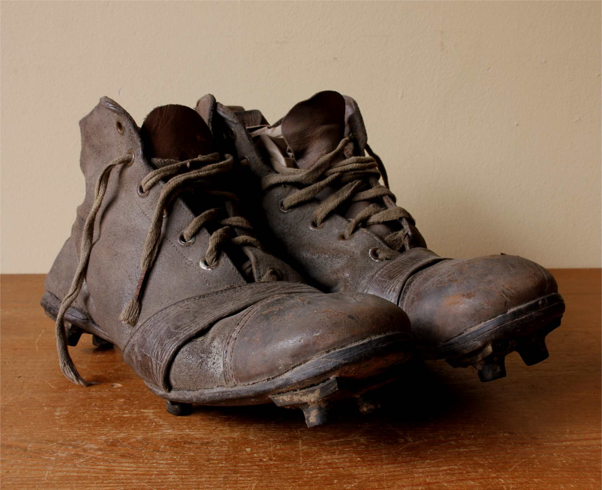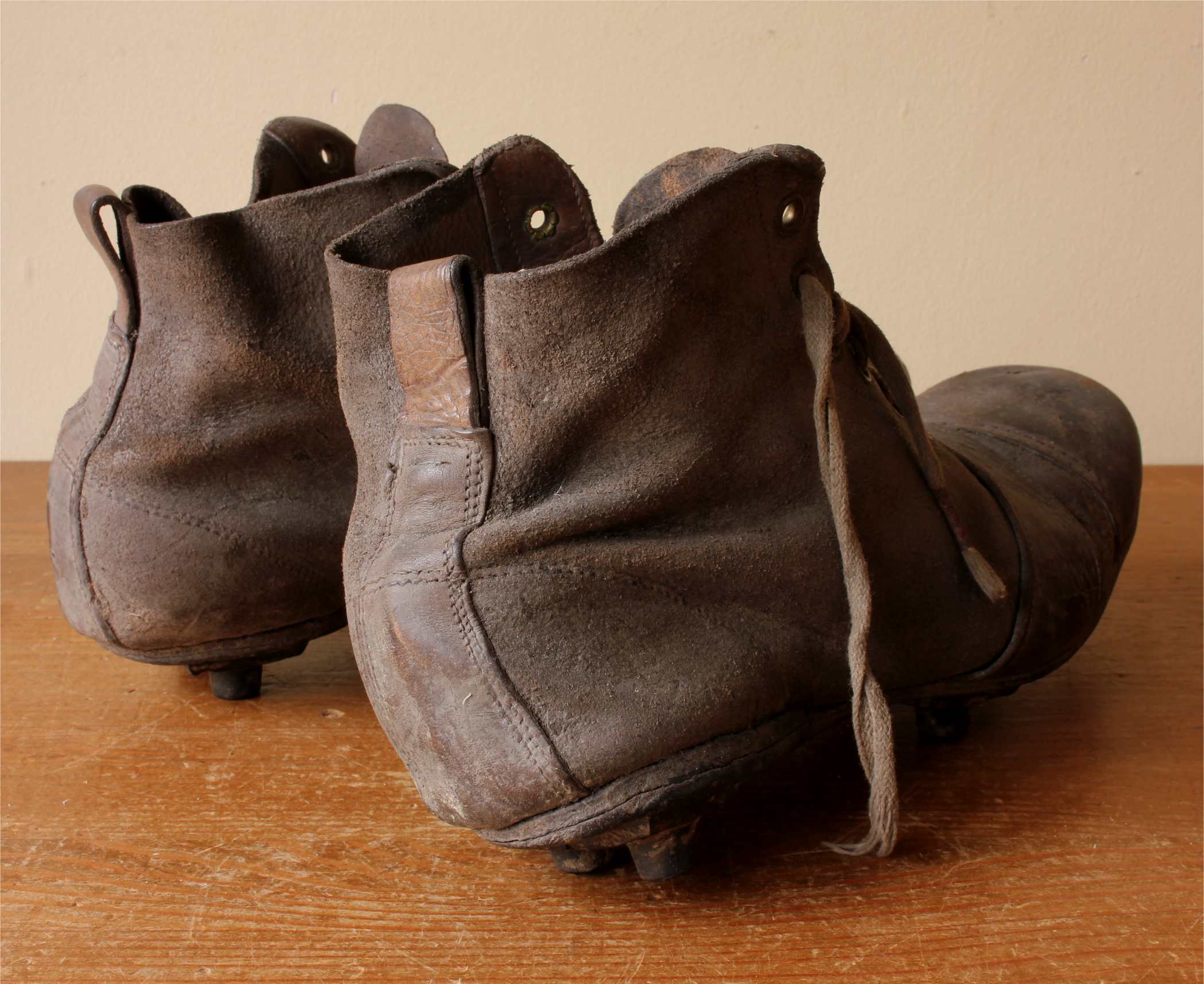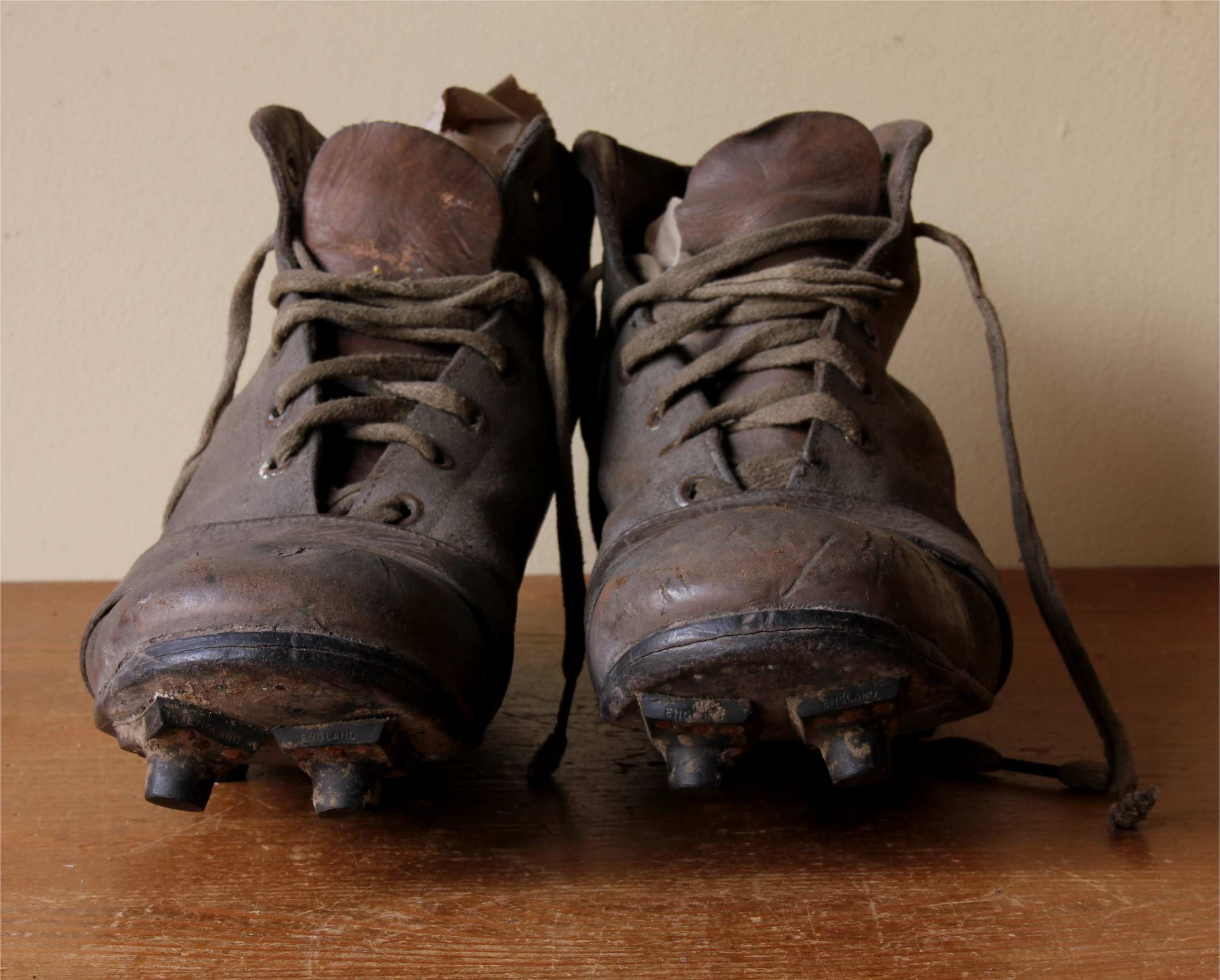 This well used pair of vintage brown leather football boots which date from c1940 have leather soles with nailed on rubber studs and cord laces.
