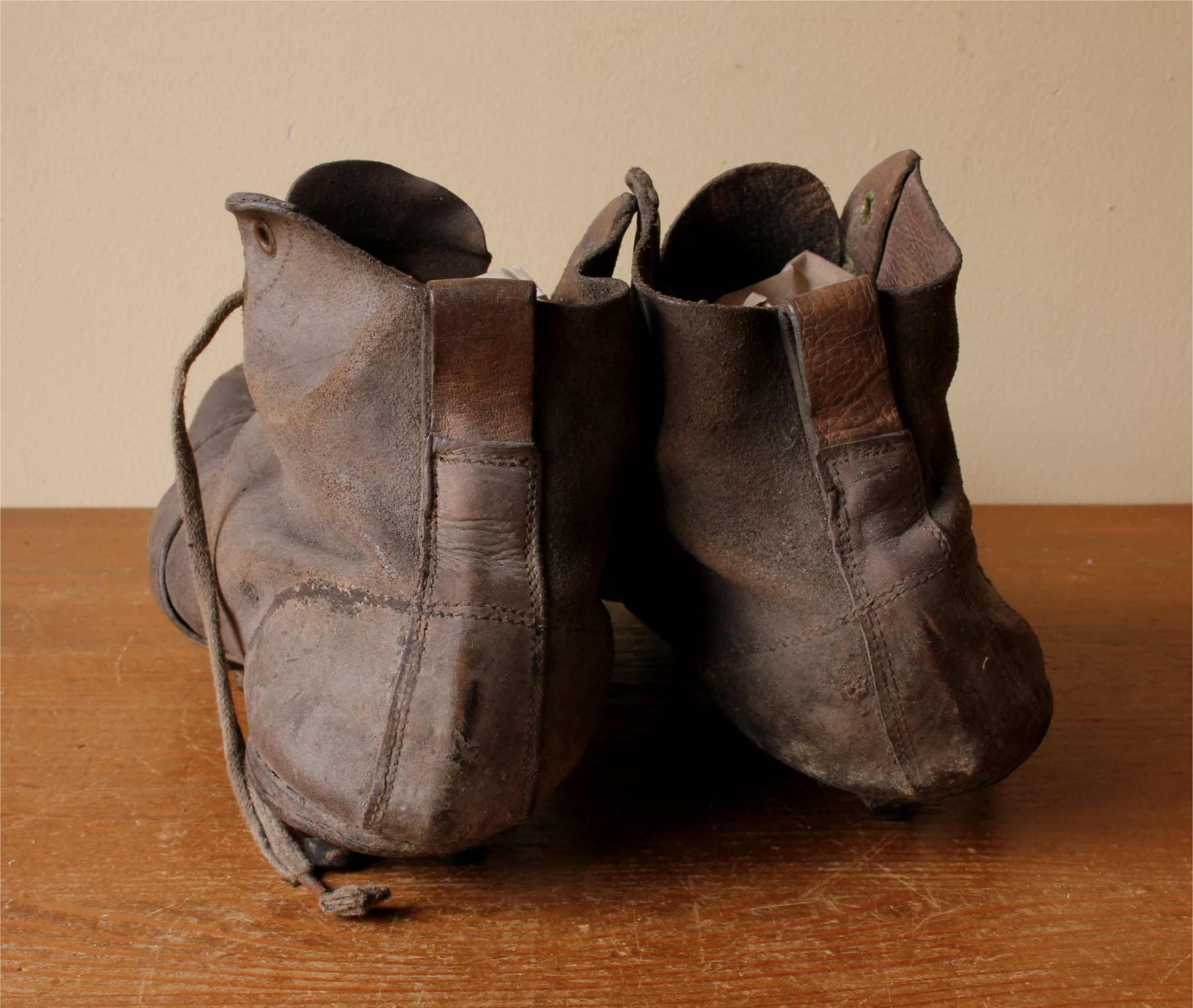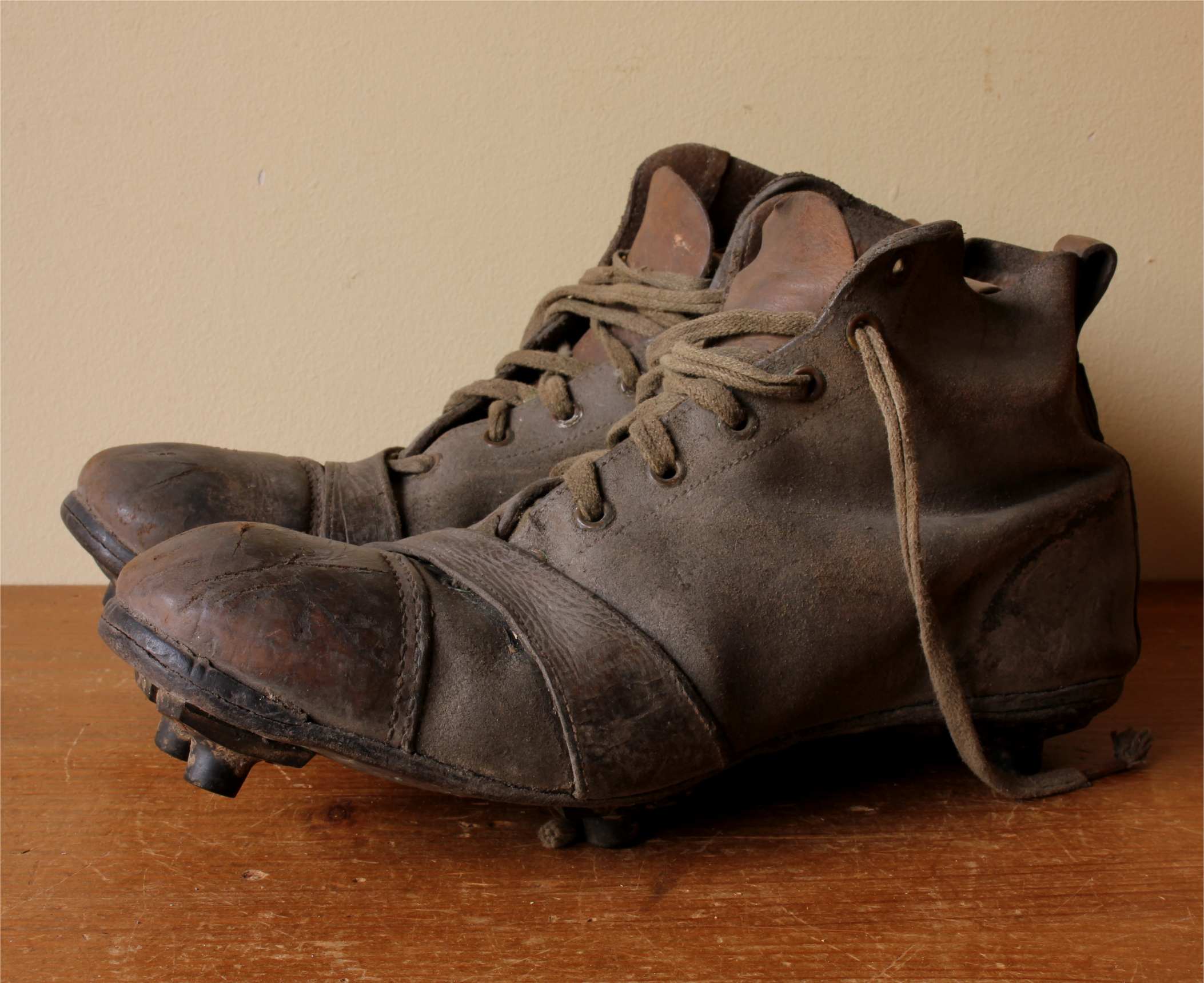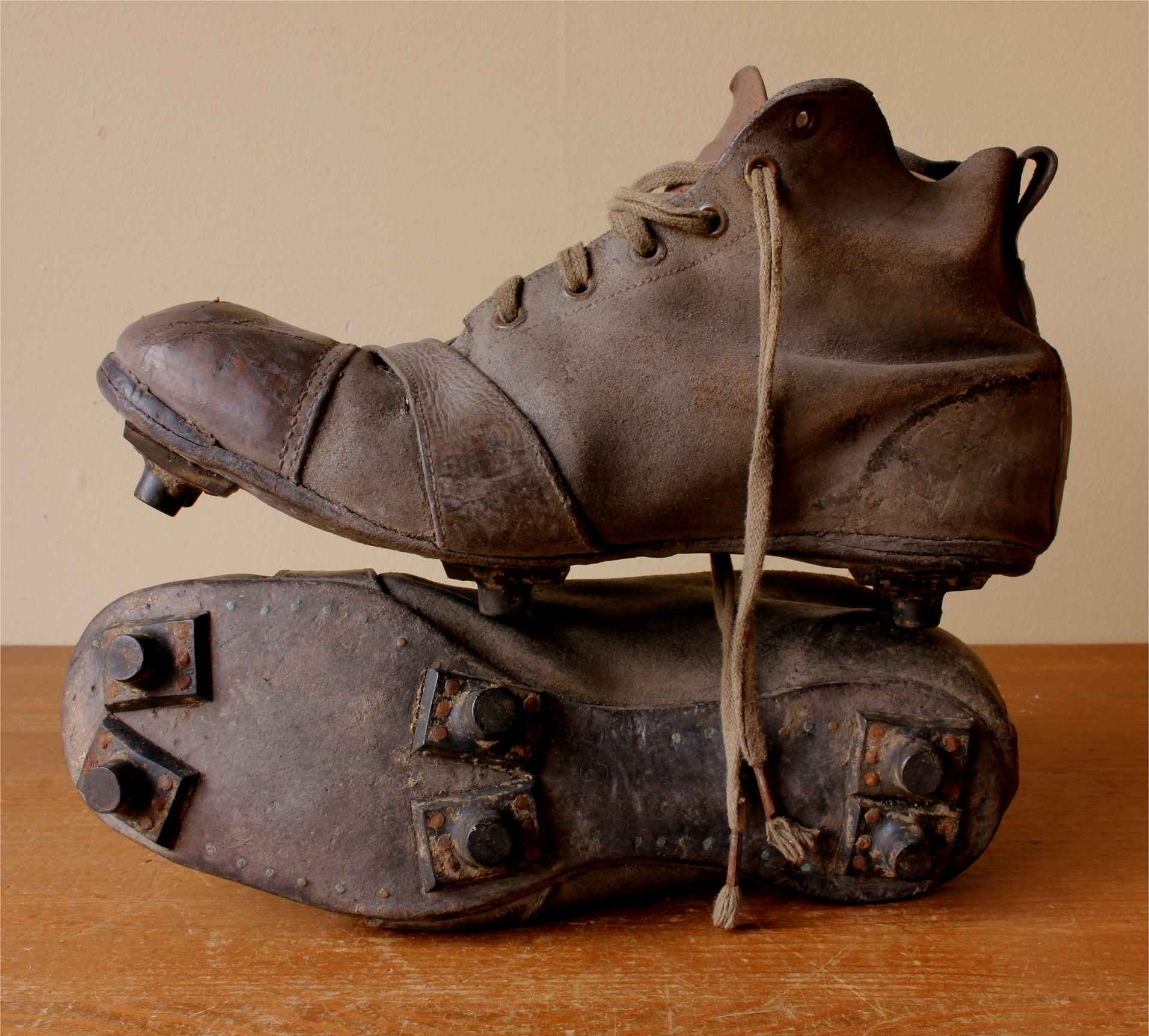 This well used pair of vintage brown leather football boots which date from c1940 have leather soles with nailed on rubber studs and cord laces.
