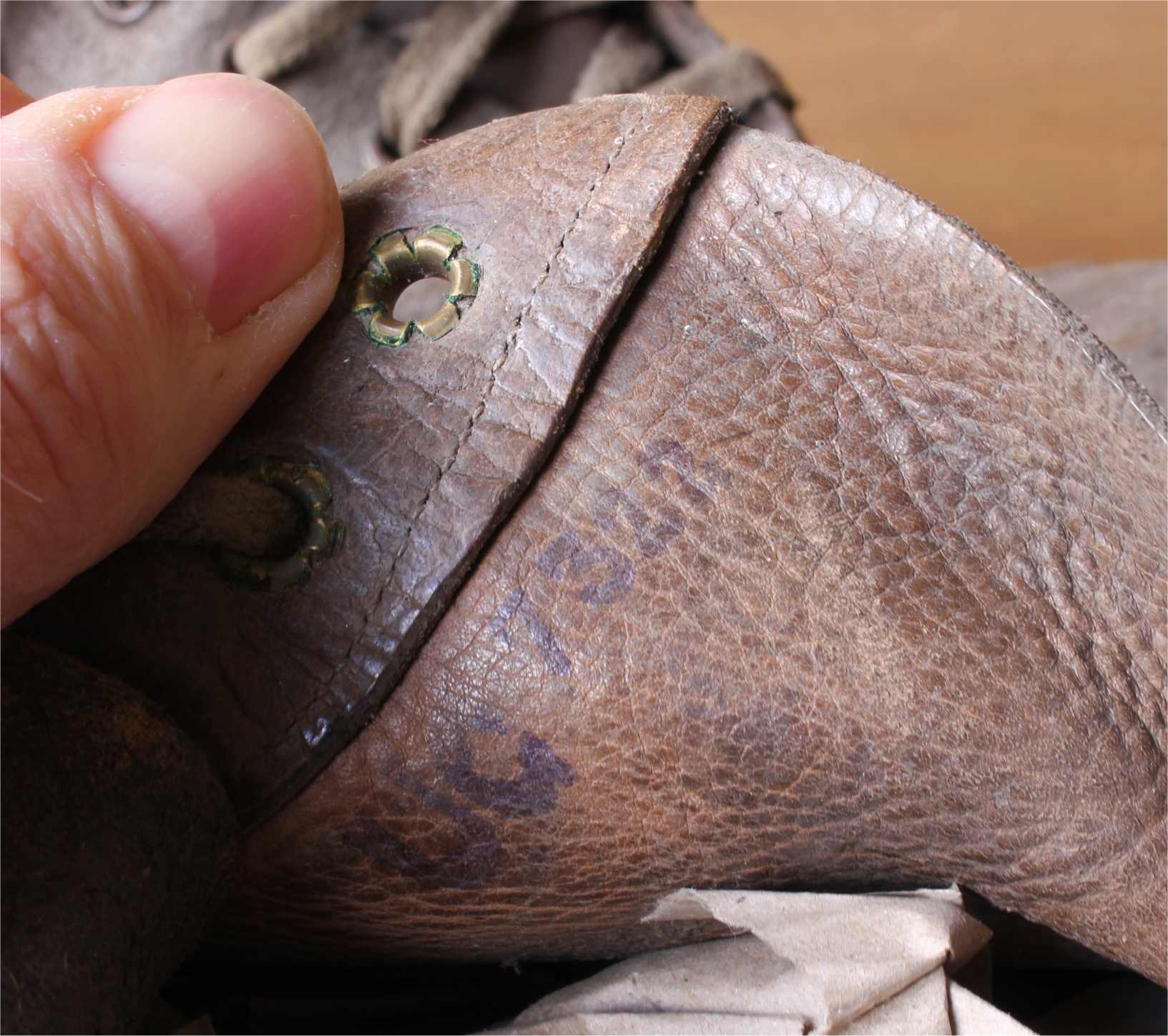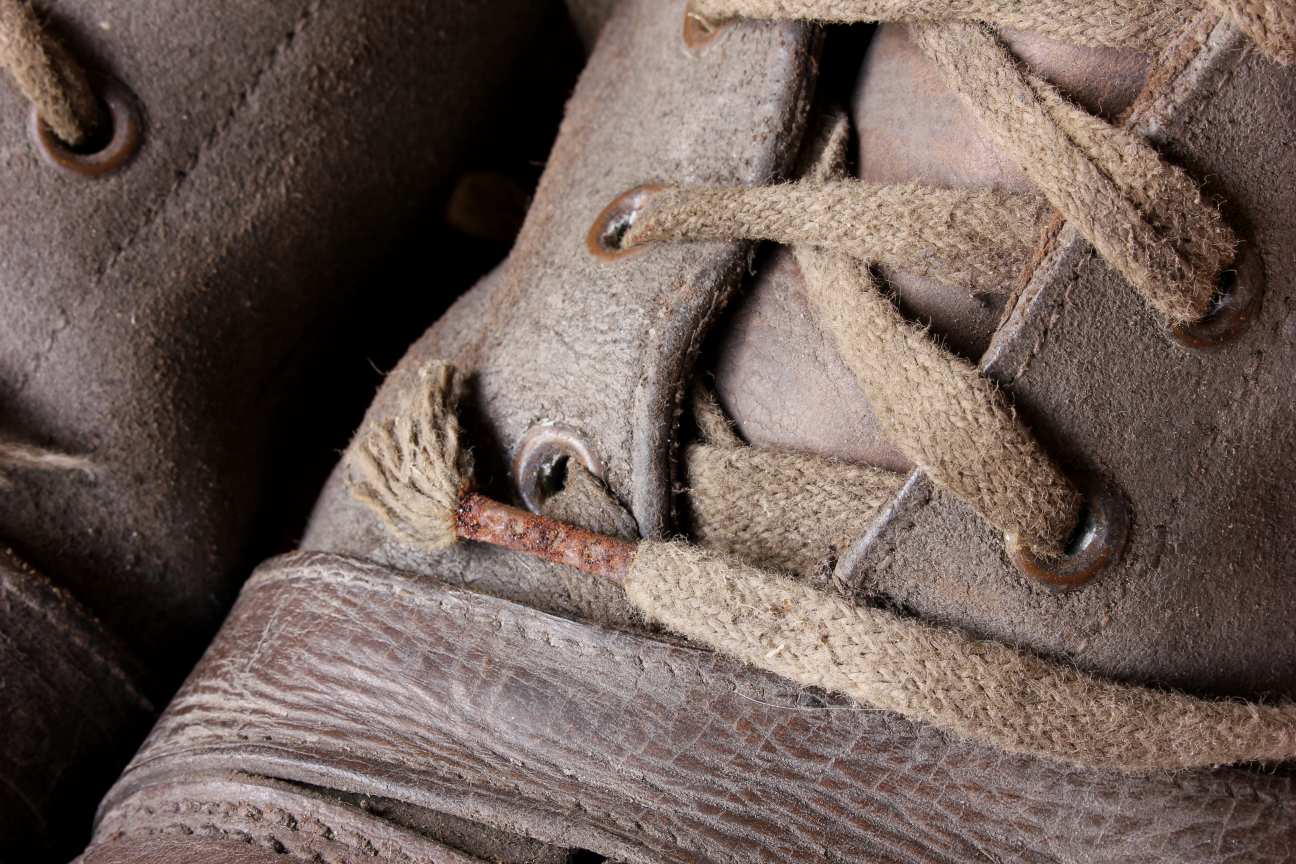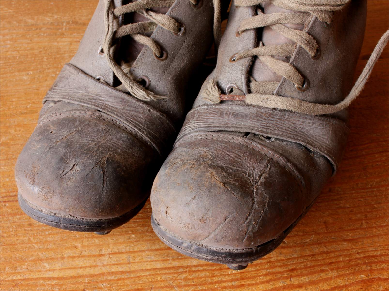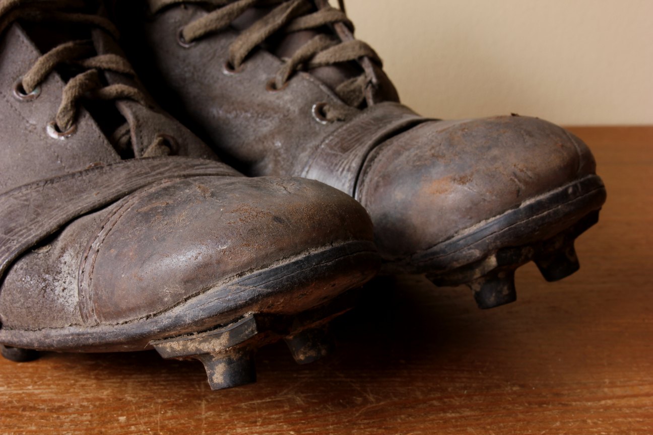 This well used pair of vintage brown leather football boots which date from c1940 have leather soles with nailed on rubber studs and cord laces.