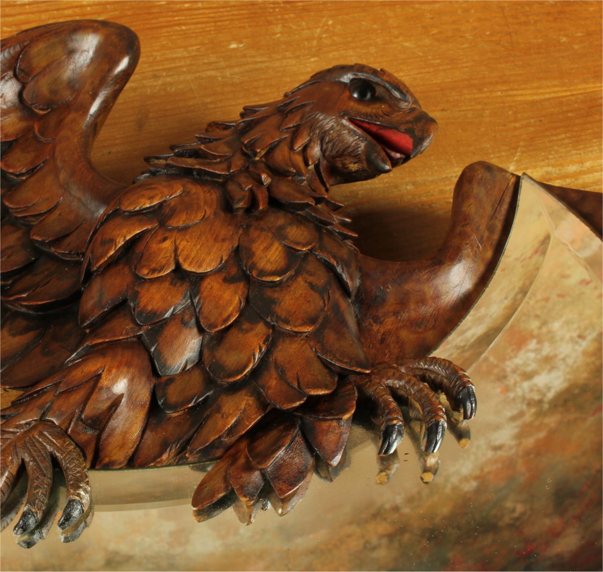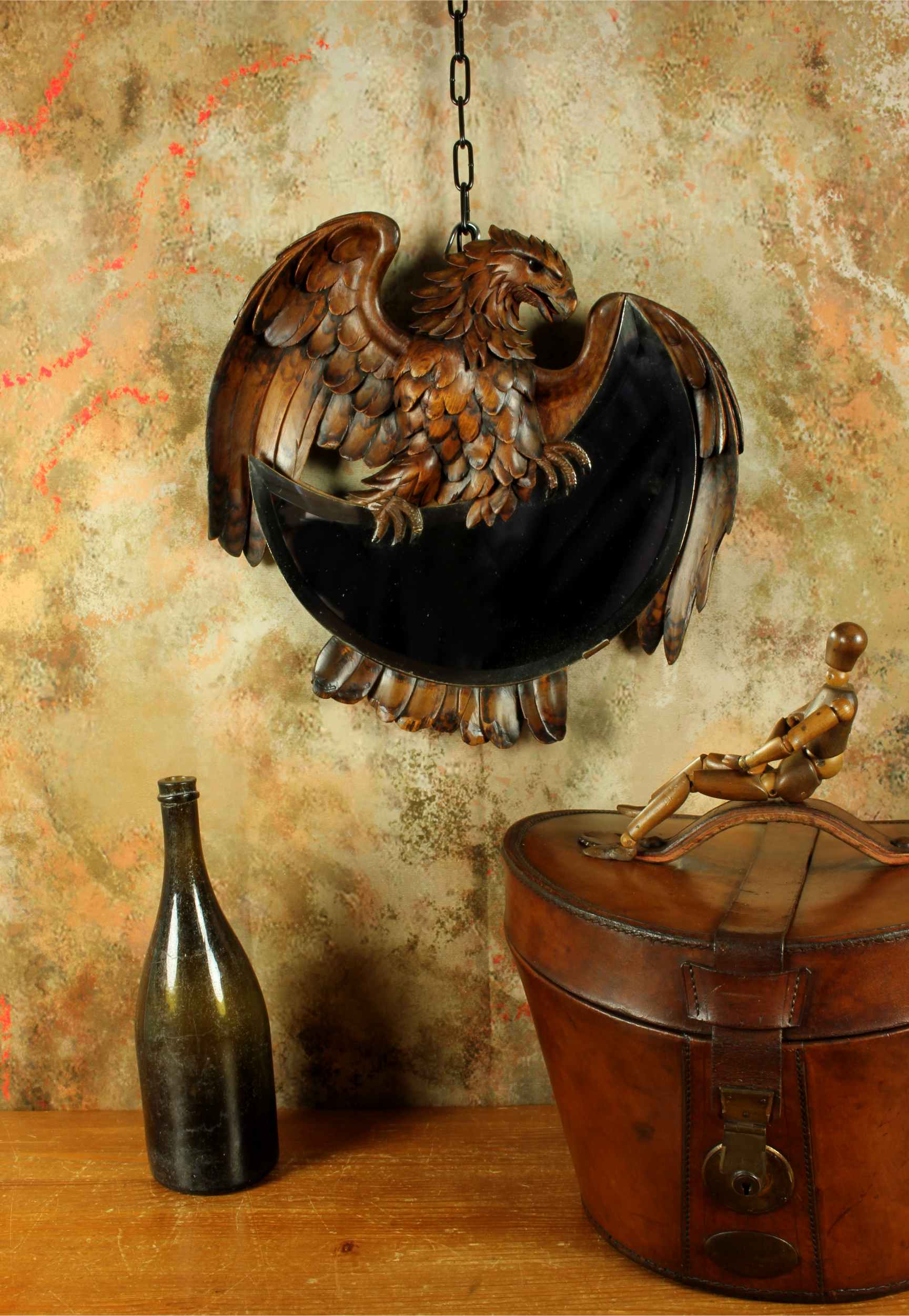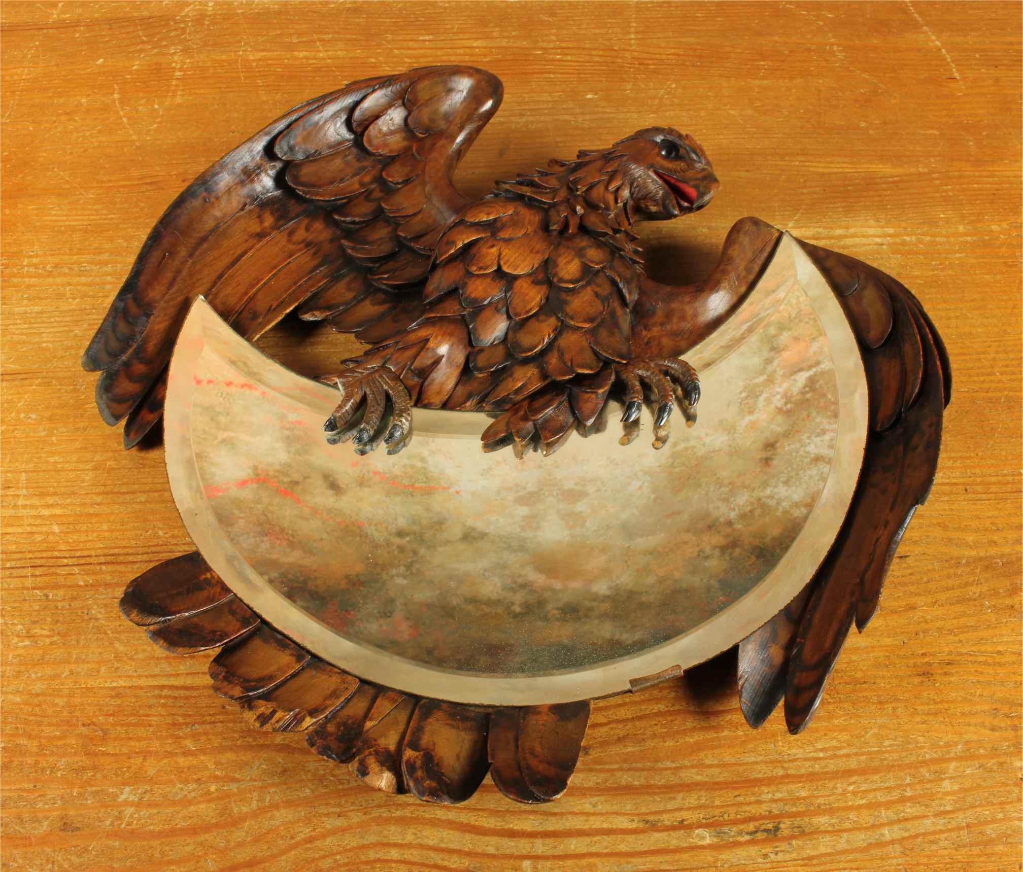 This antique Black Forest wall mirror which has a beautiful carved eagle holding a bevelled edge crescent moon shaped mirror plate is in wonderful original condition with an aged patina and dates from the late 19th century.