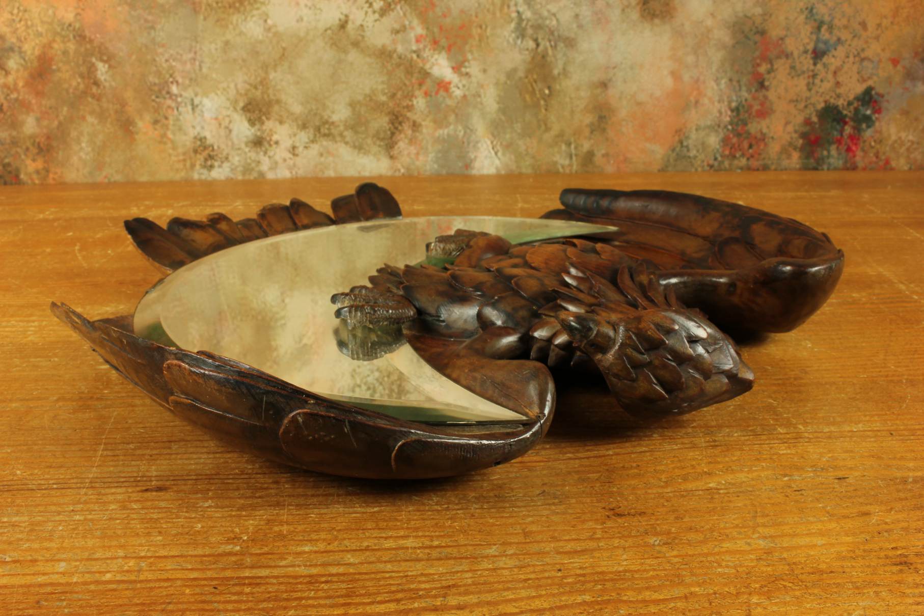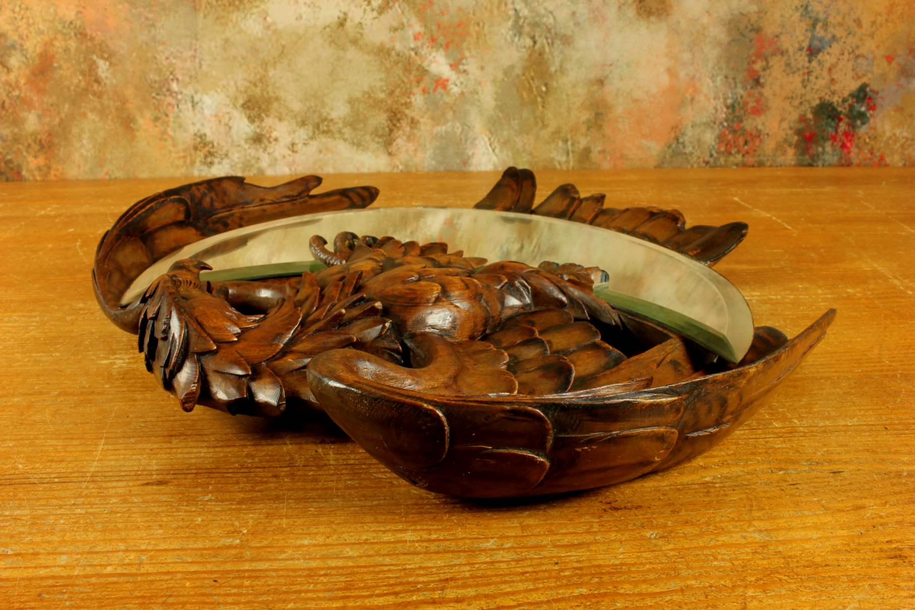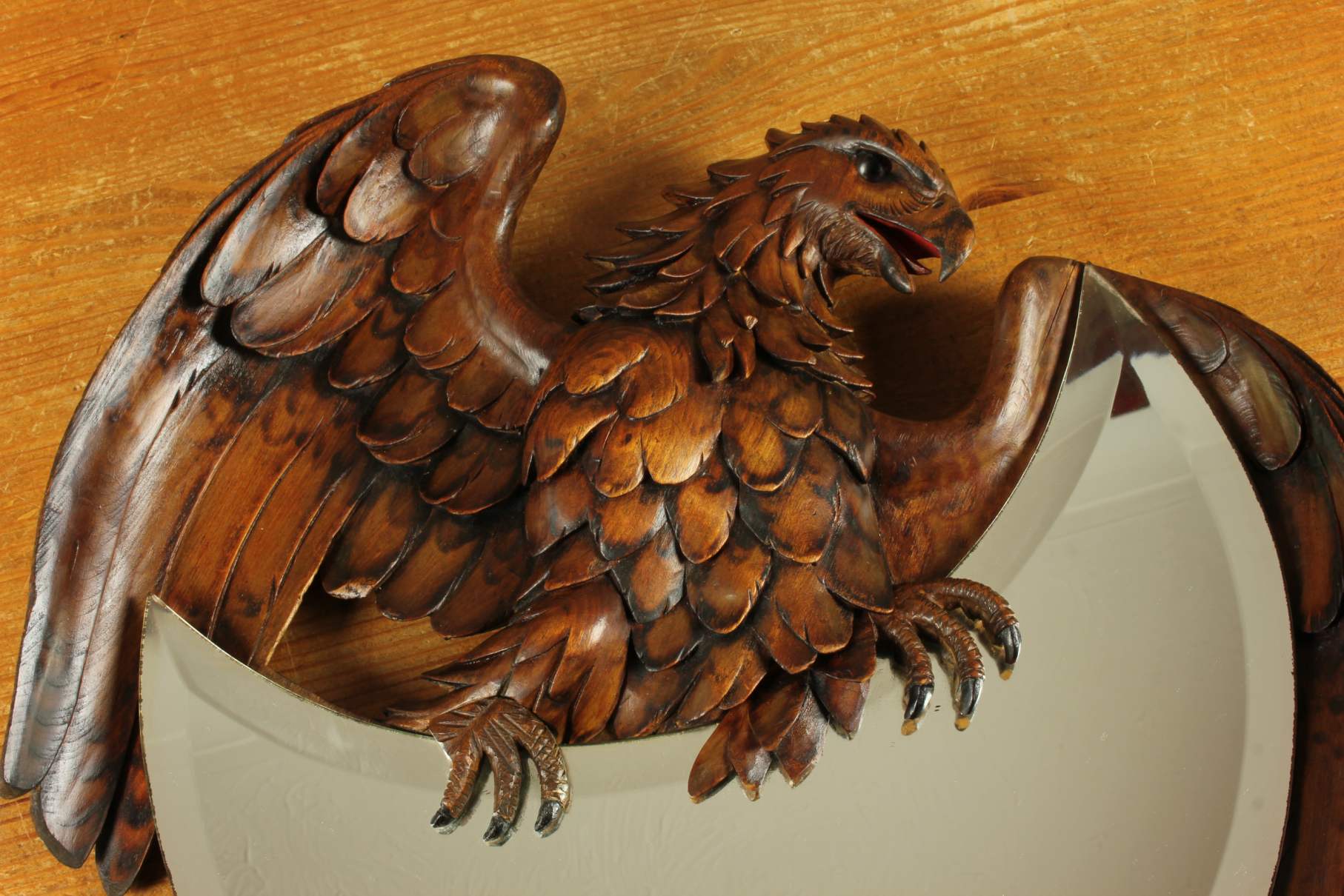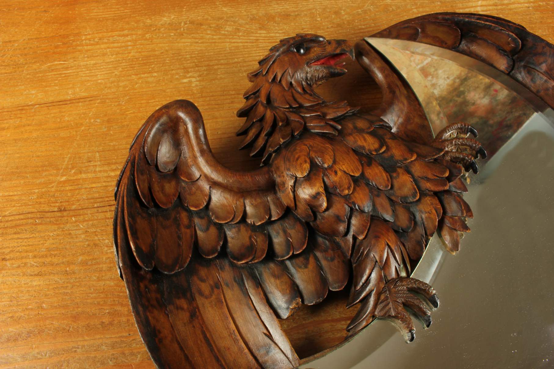 This antique Black Forest wall mirror which has a beautiful carved eagle holding a bevelled edge crescent moon shaped mirror plate is in wonderful original condition with an aged patina and dates from the late 19th century.