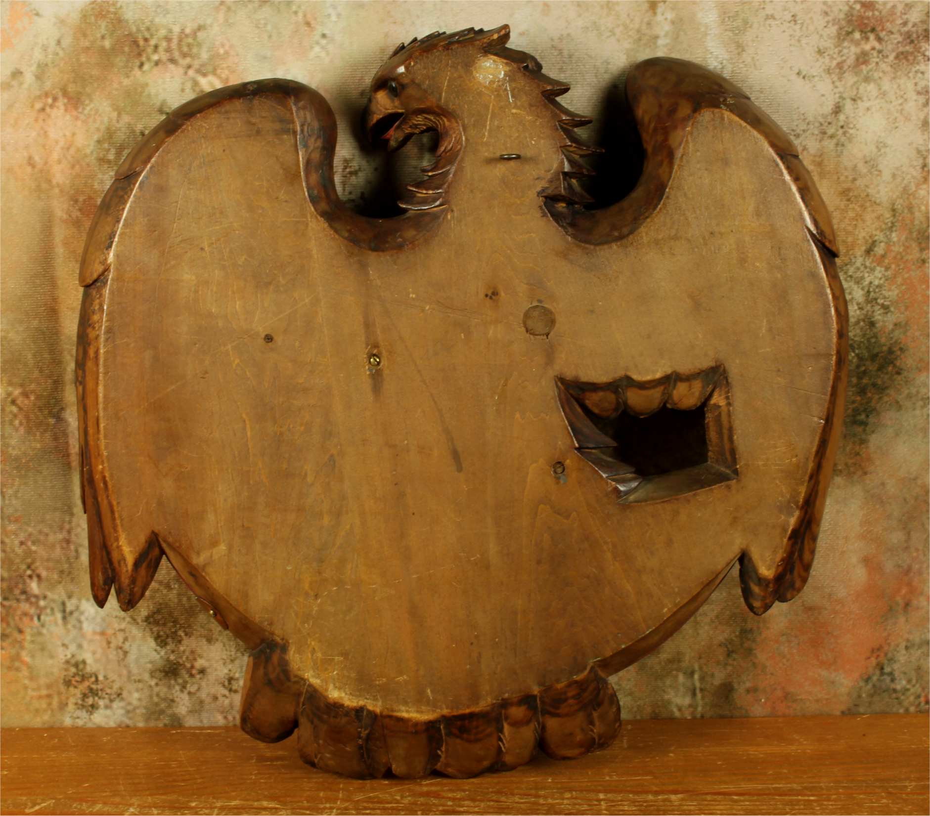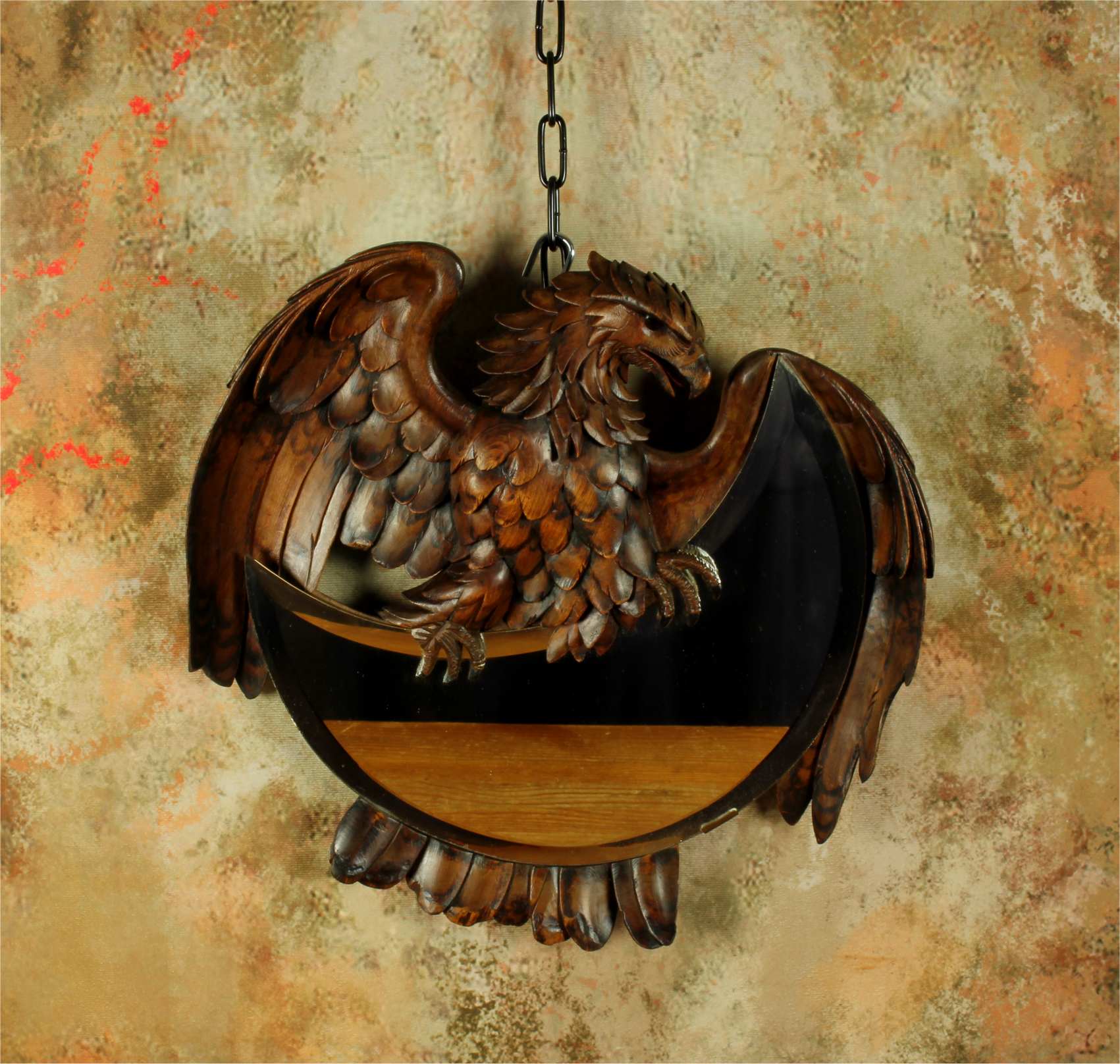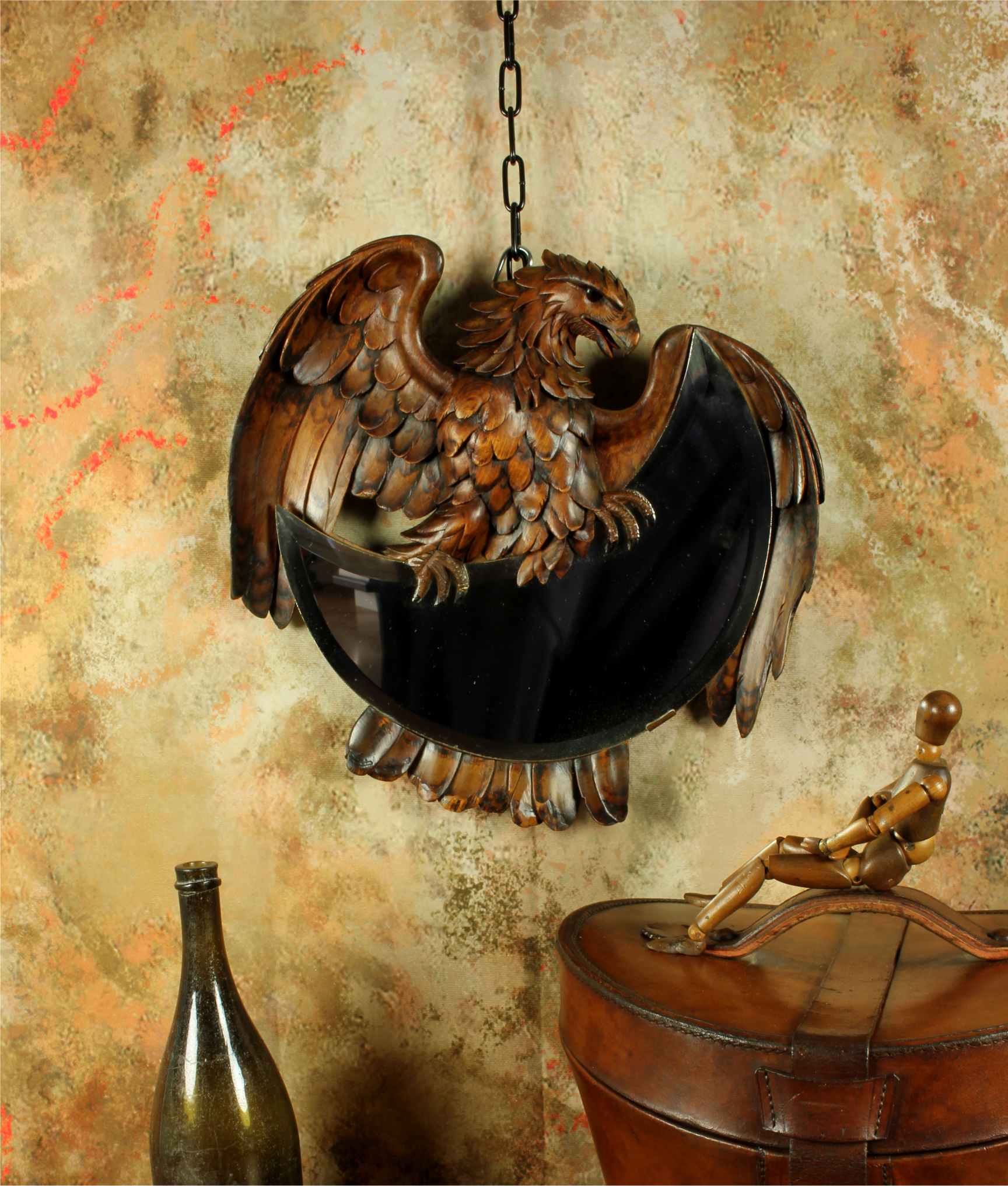 This handsome eagle has fine hand carved detail, two glass eyes and has an open red mouth which shows his upturned tongue. This mirror is fitted with a brass ring to the rear so can be hung on a wall.