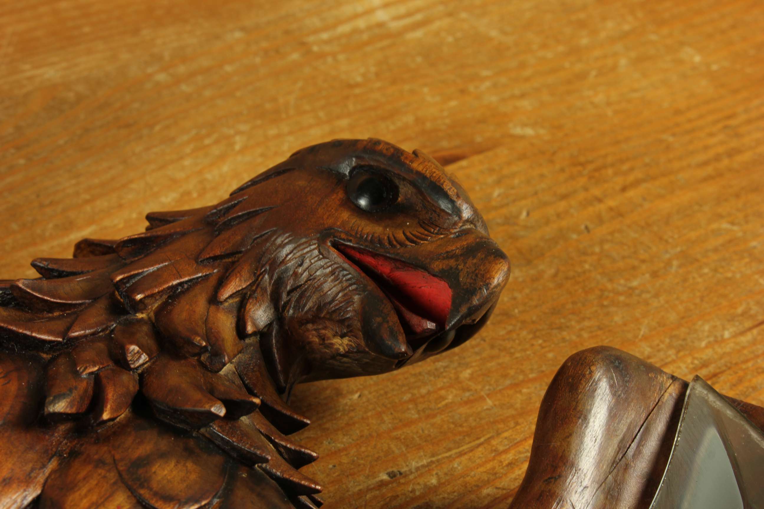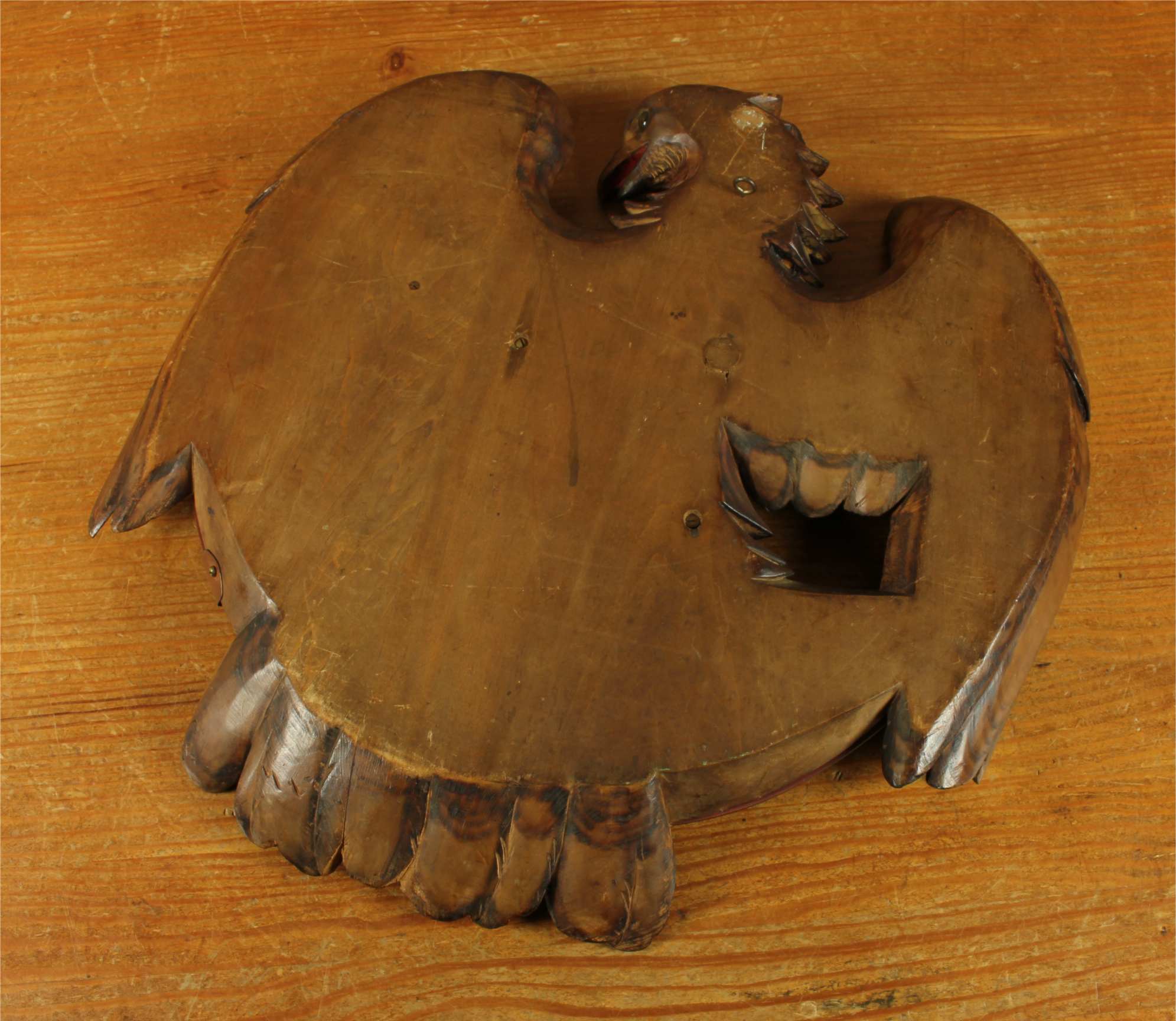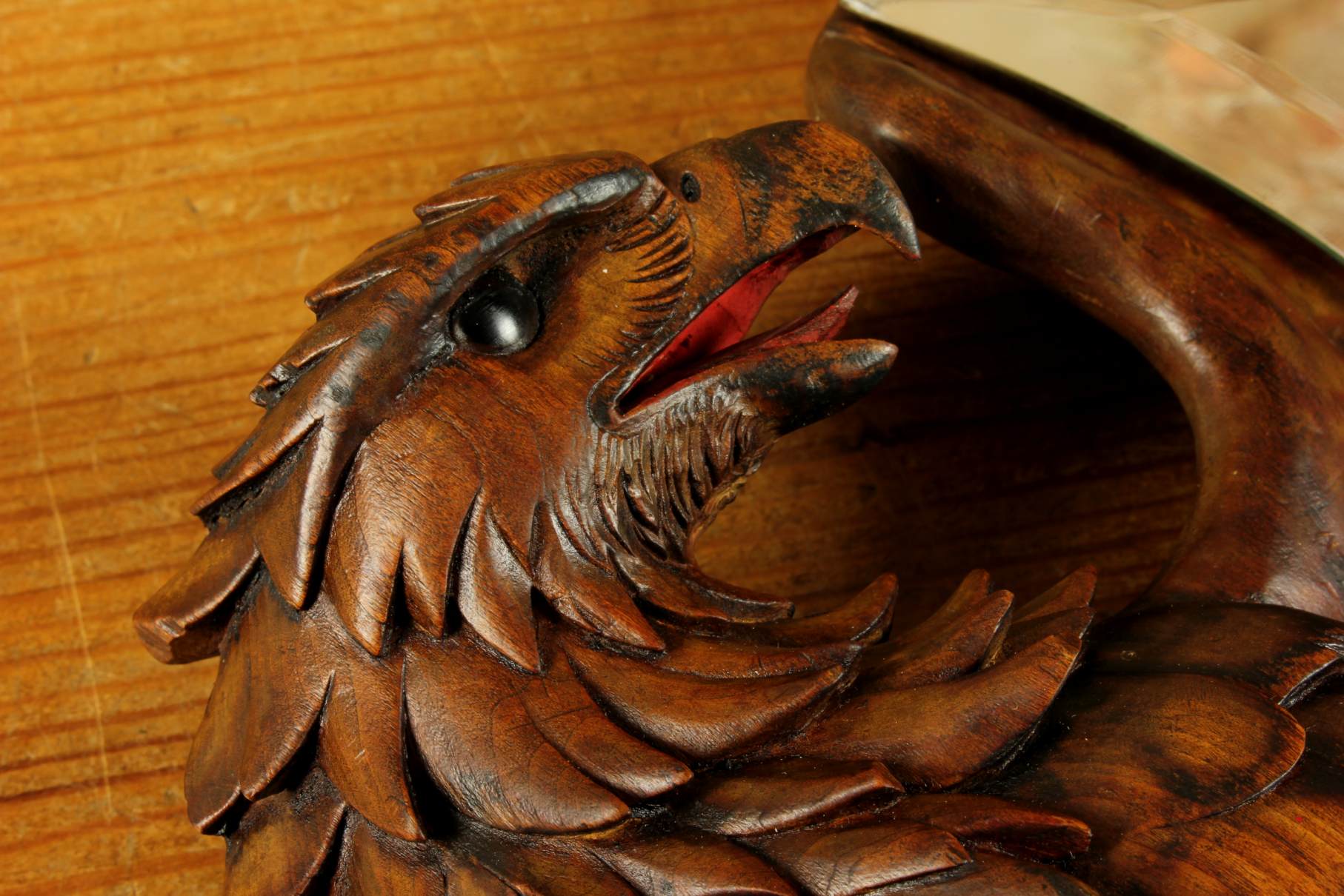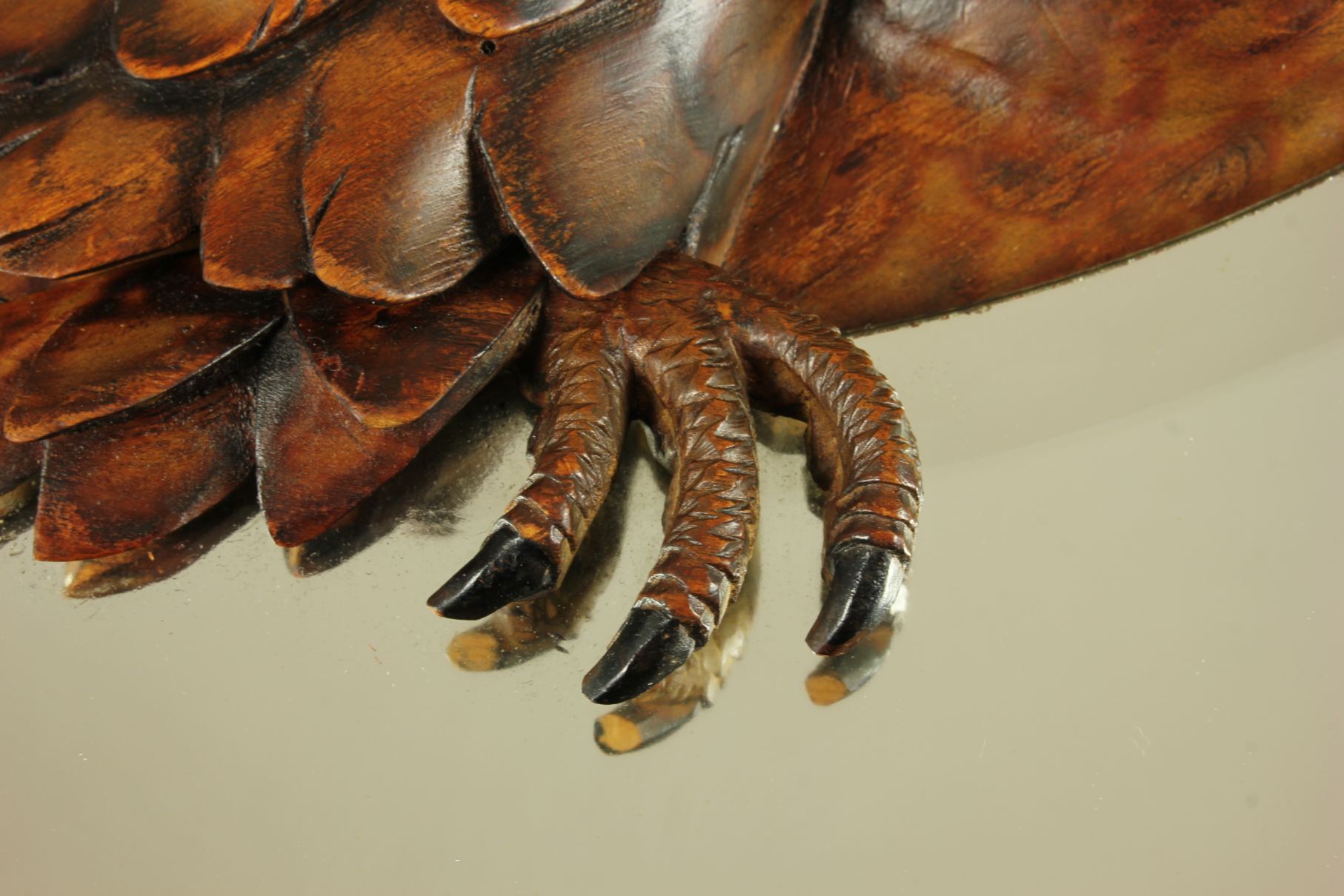 This handsome eagle has fine hand carved detail, two glass eyes and has an open red mouth which shows his upturned tongue. This mirror is fitted with a brass ring to the rear so can be hung on a wall.