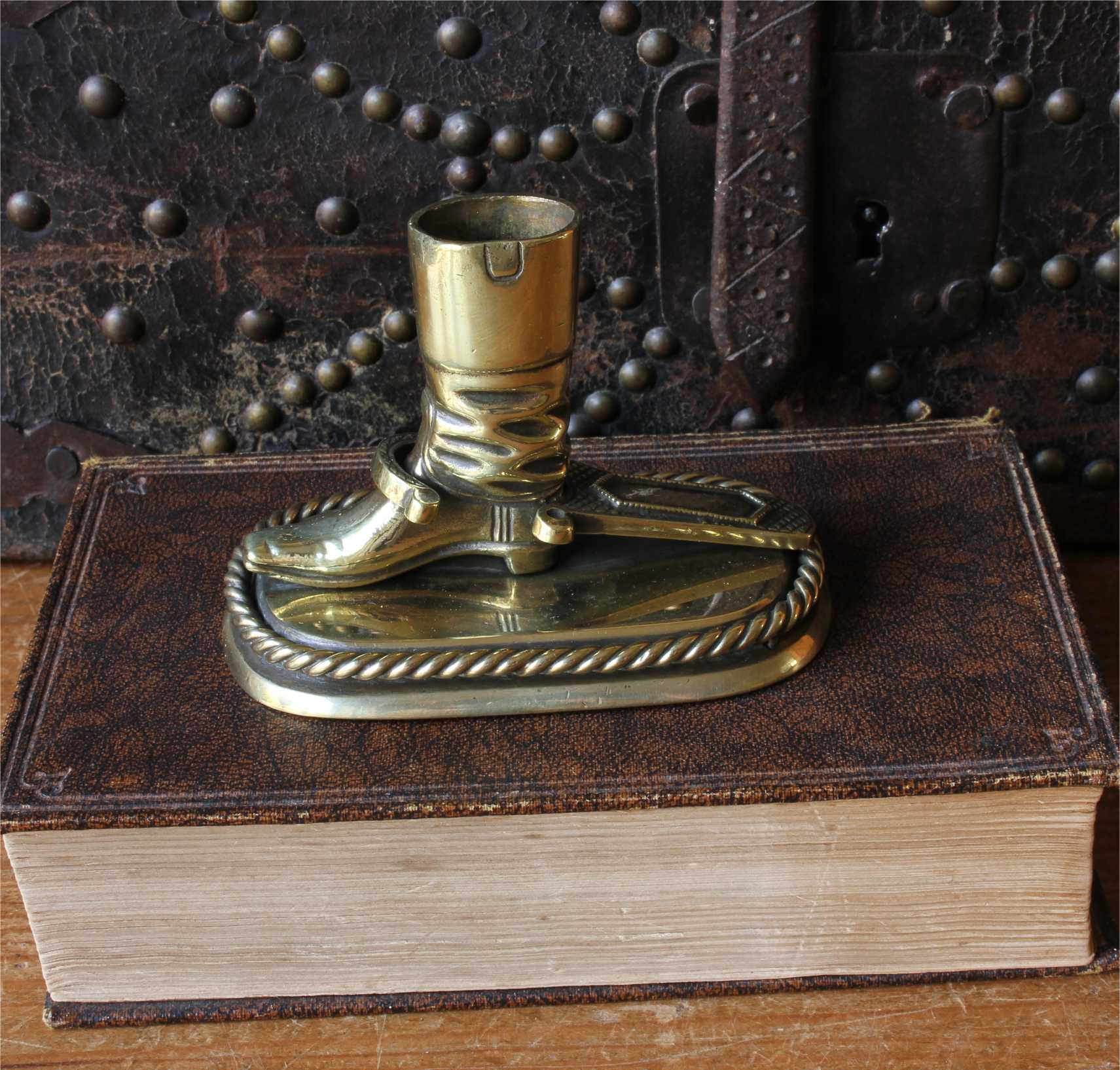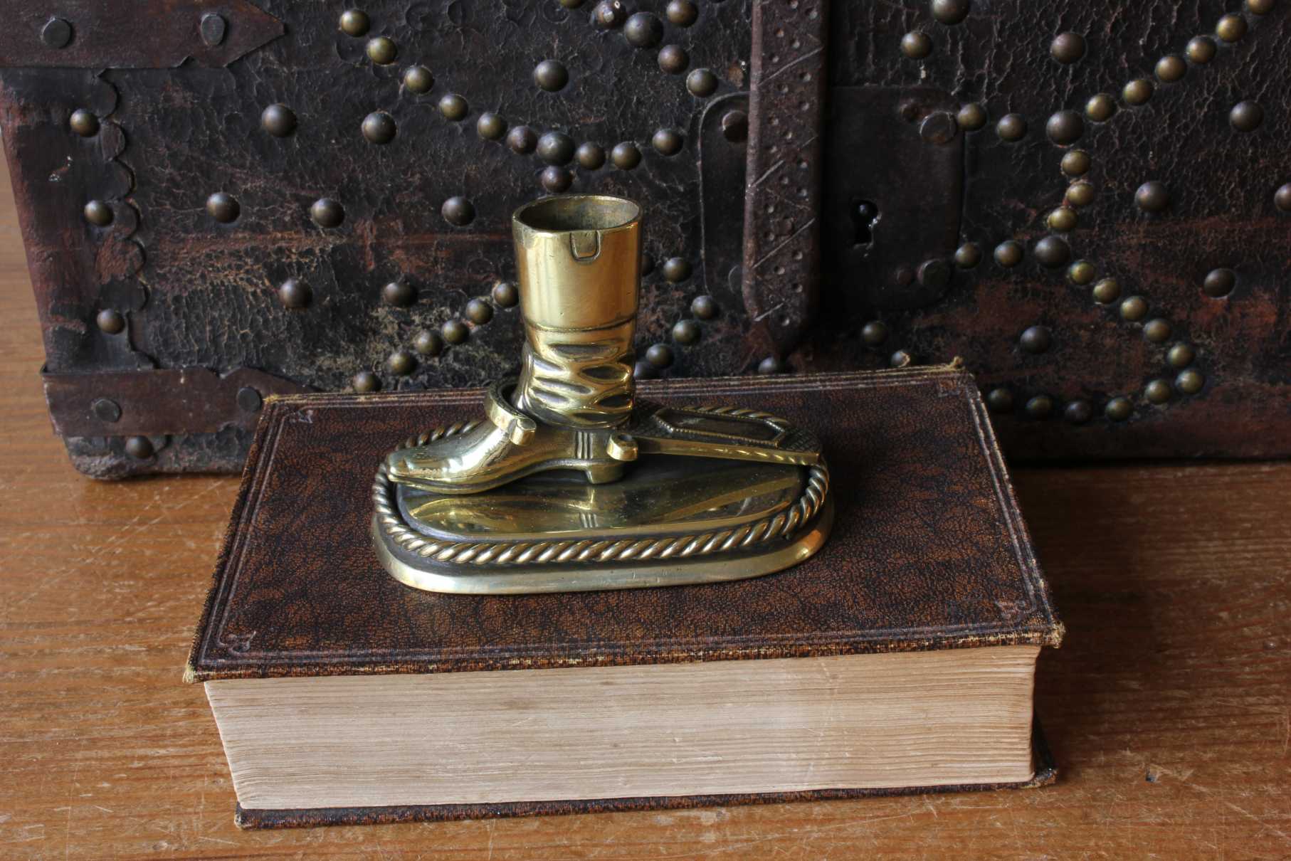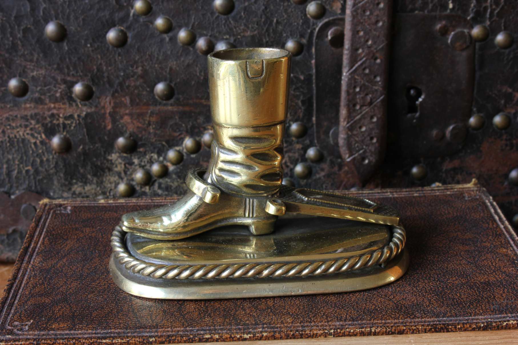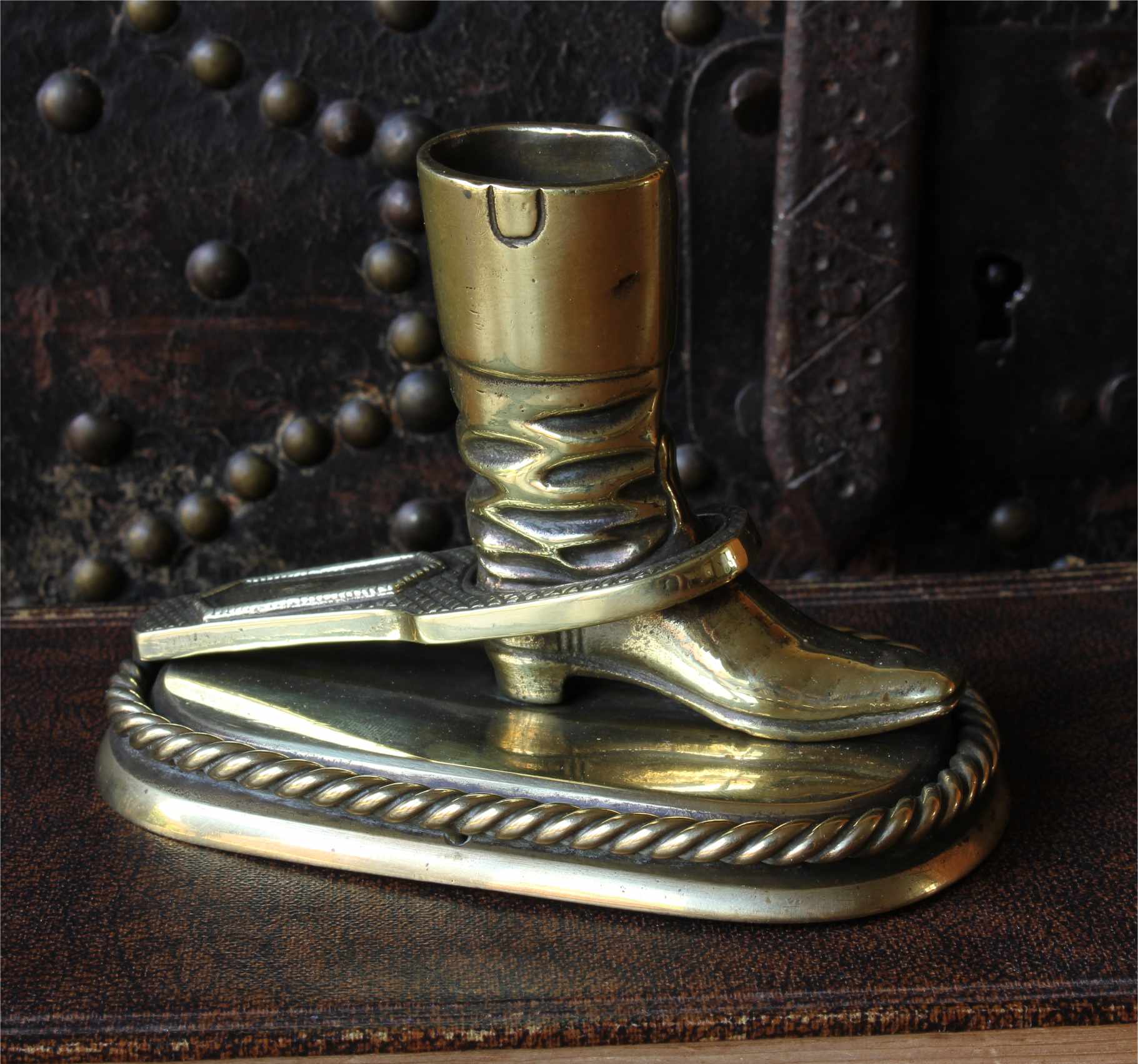This unusual Victorian match holder is in the form of an open boot to keep matches and the boot jack can be used for striking the matches. Both sit on a brass base which has a nice twisted decoration.