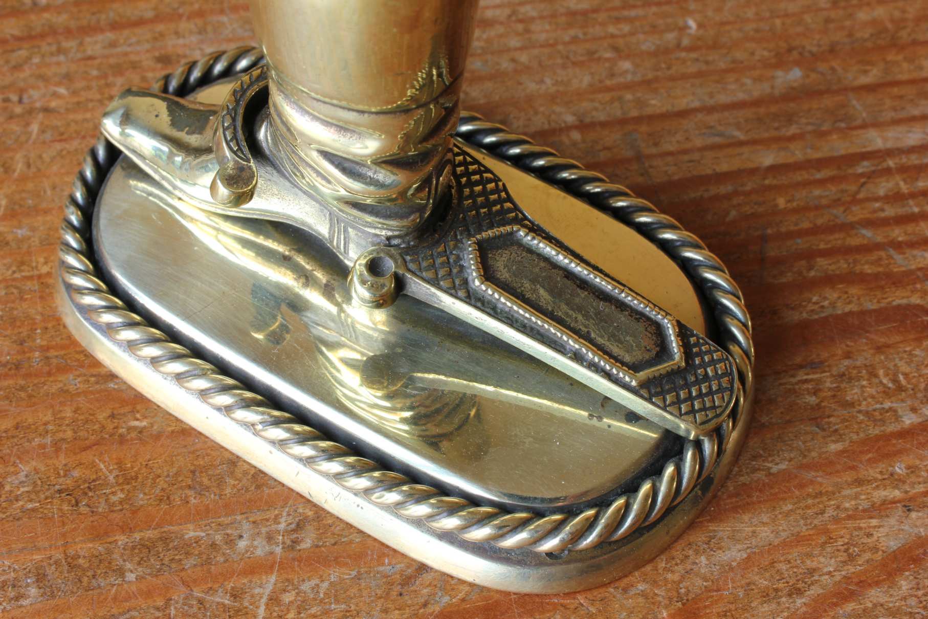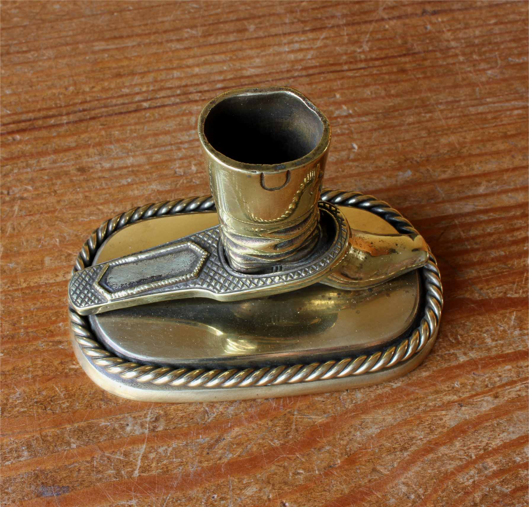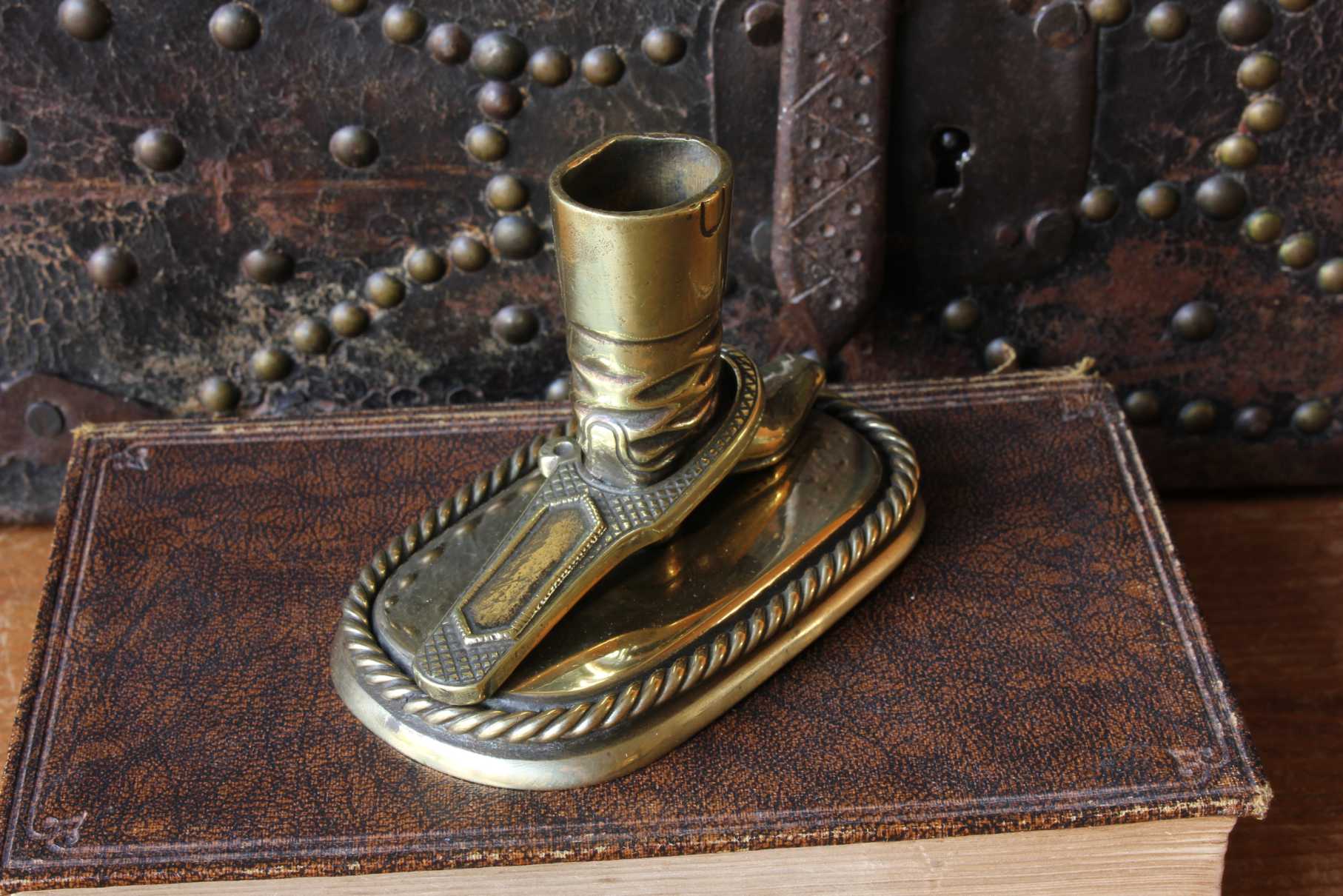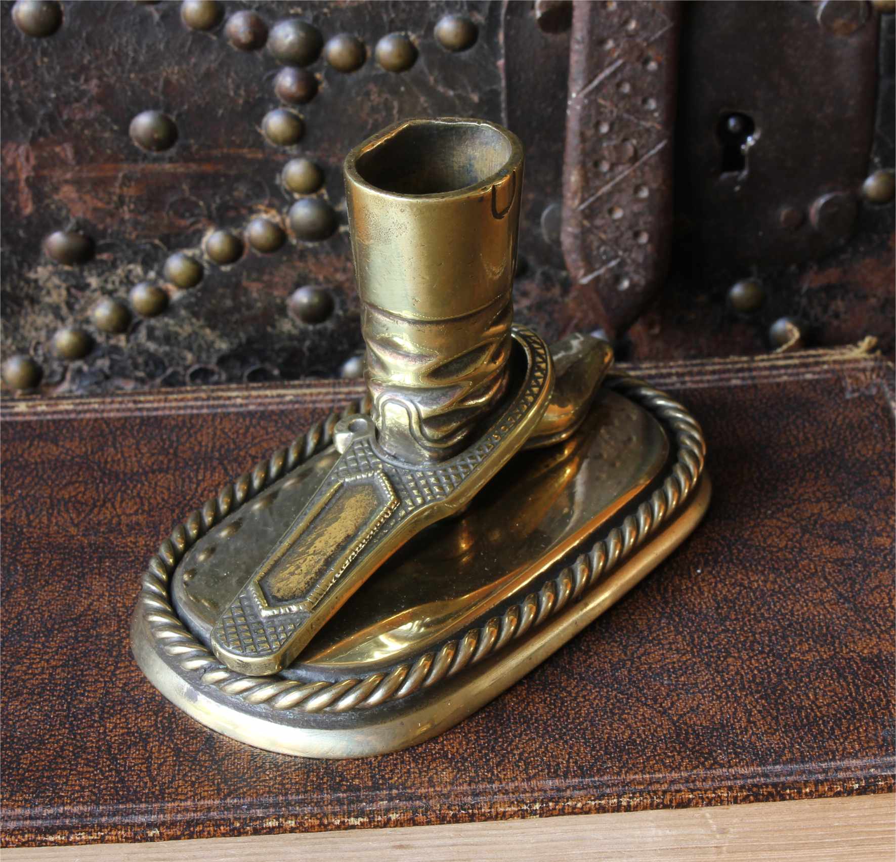 This unusual Victorian match holder is in the form of an open boot to keep matches and the boot jack can be used for striking the matches. Both sit on a brass base which has a nice twisted decoration.