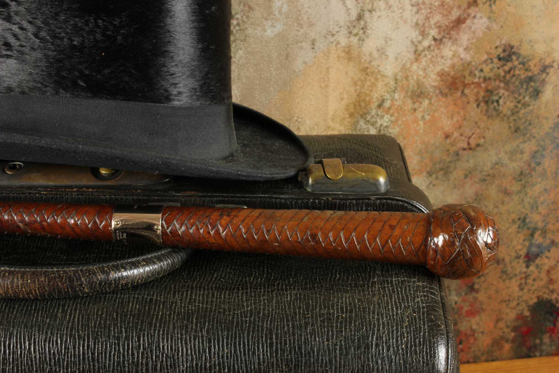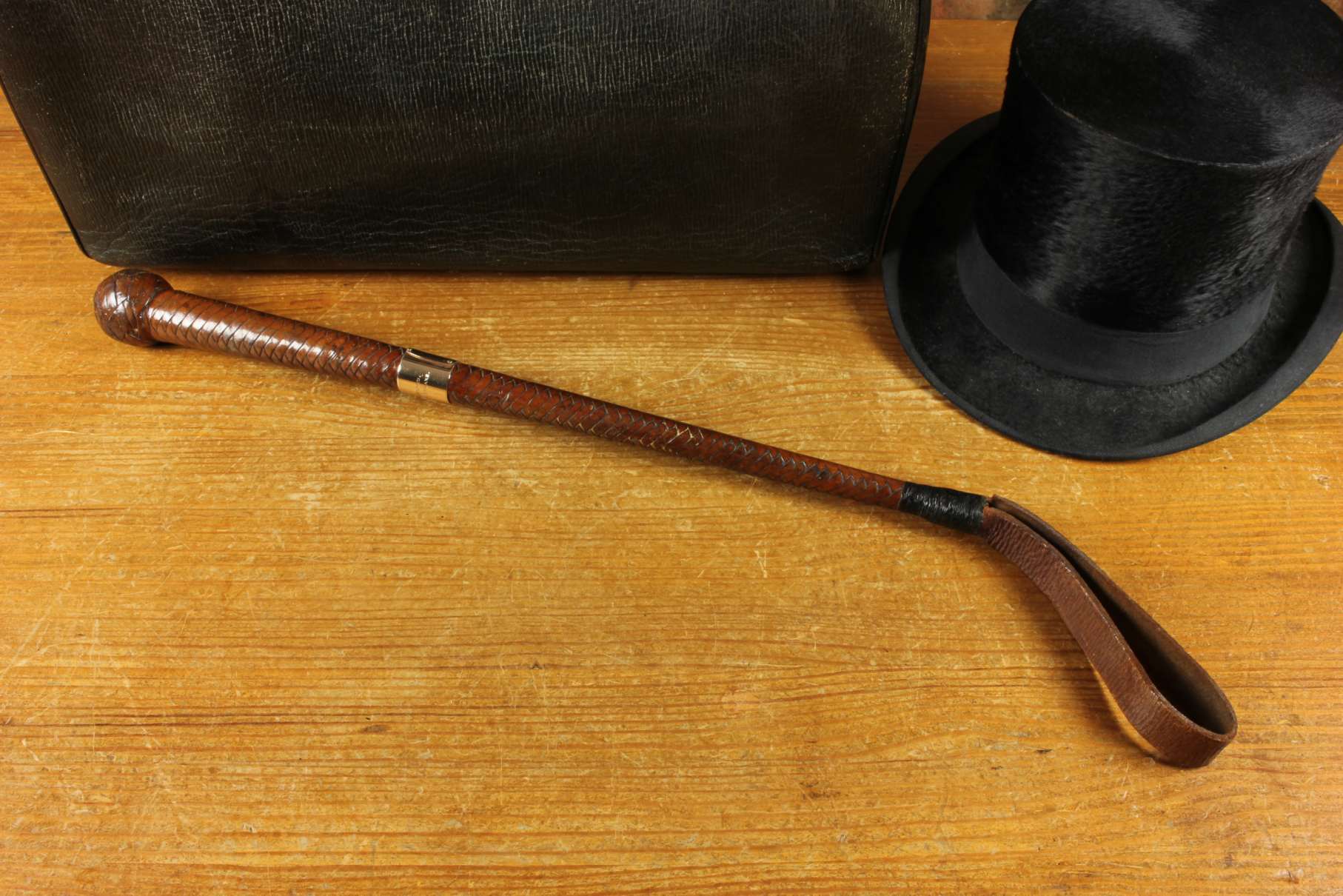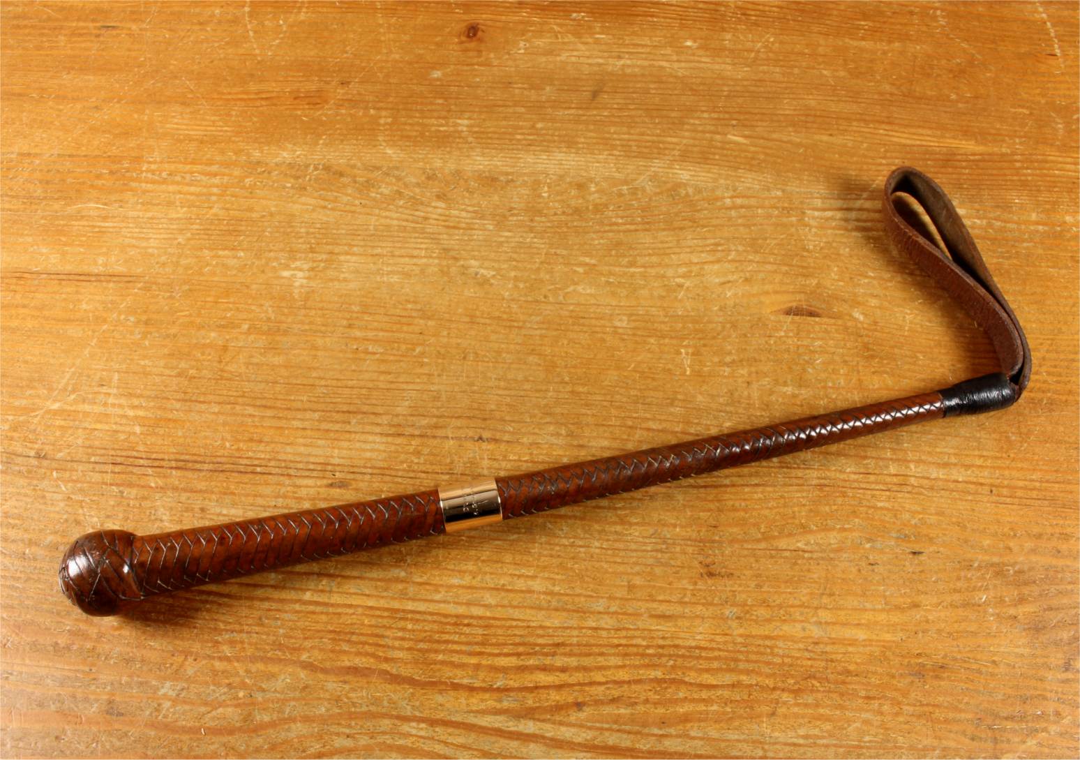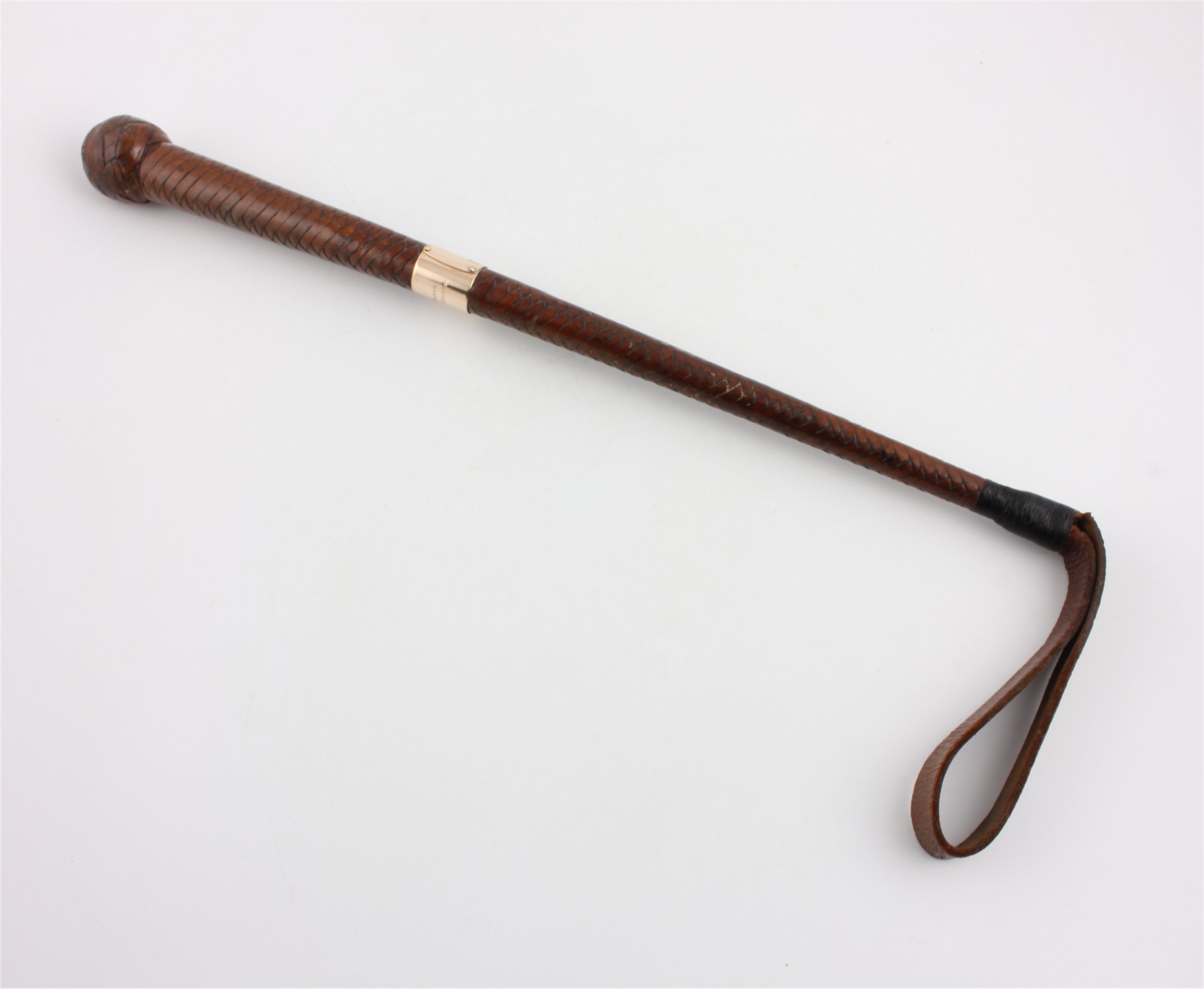 This fabulous antique riding crop or whip which is by premier British luxury goods manufacturer Thomas Brigg & Sons of London has been hand braided in brown leather with a heavy weighted ball to one end, leather strap to the other and has a Charles Cooke 12 ct gold collar which dates to 1917.