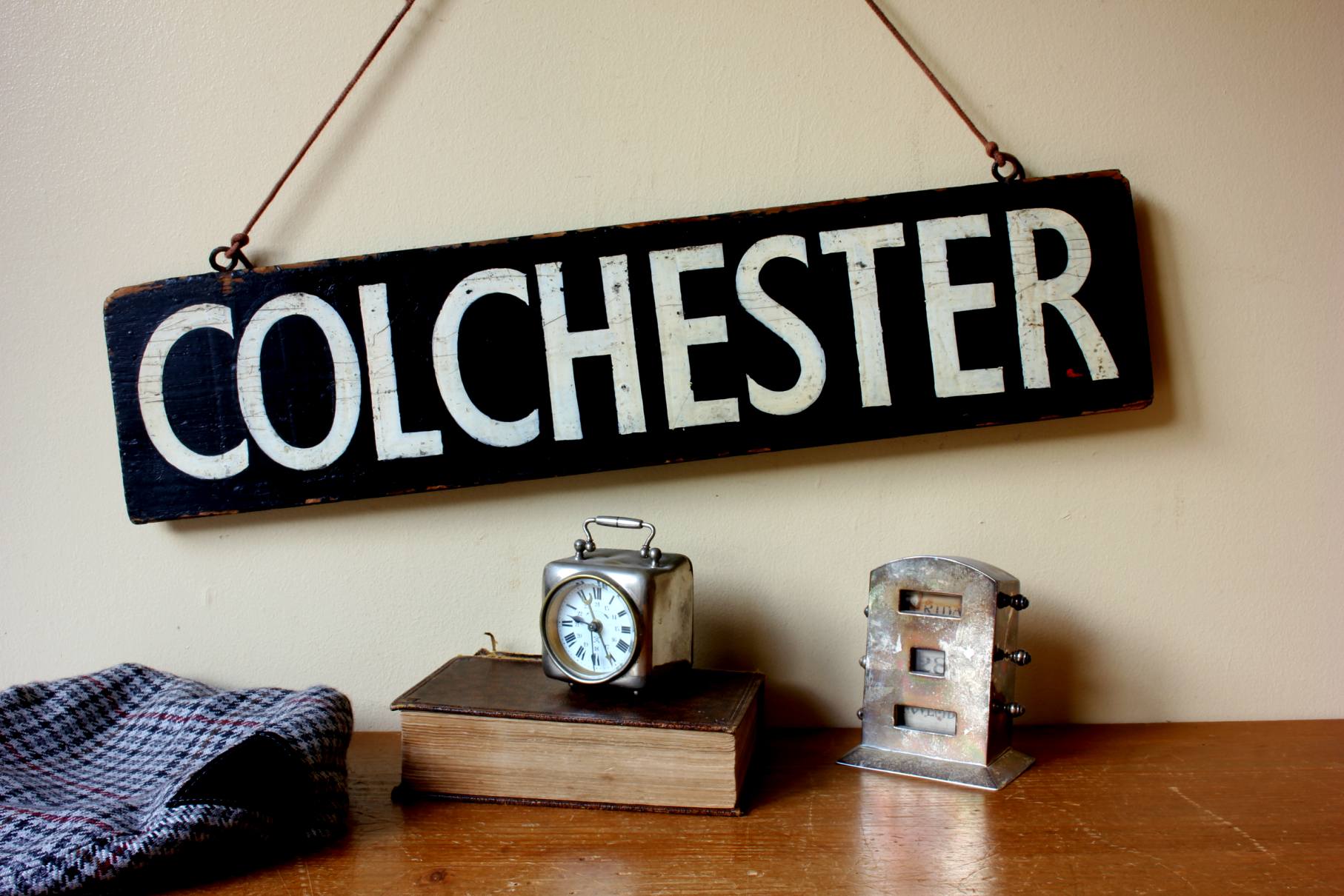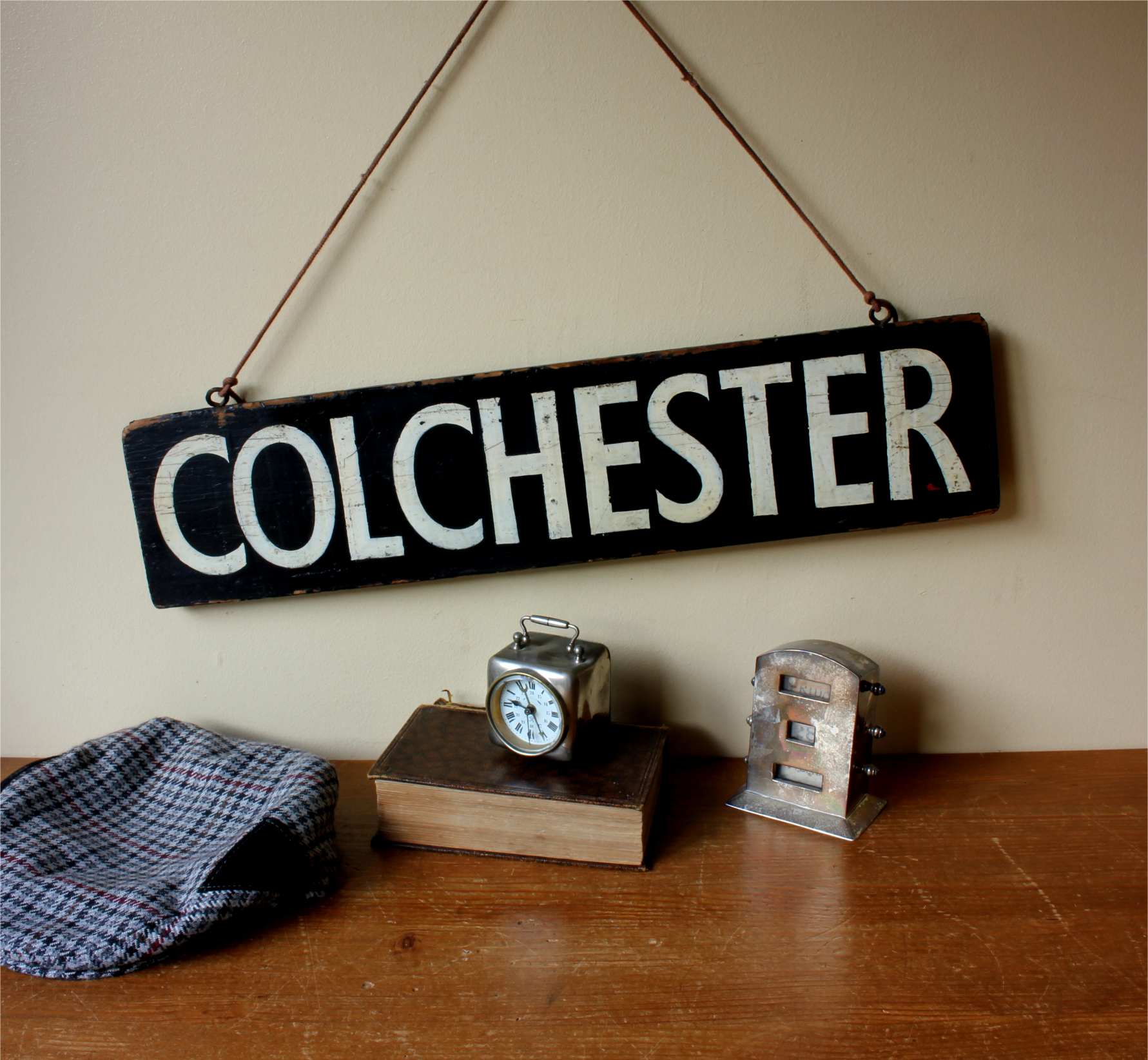 This original hand painted Colchester destination sign which came from Liverpool Street Station dates from c1930, is made of wood and has a black background.