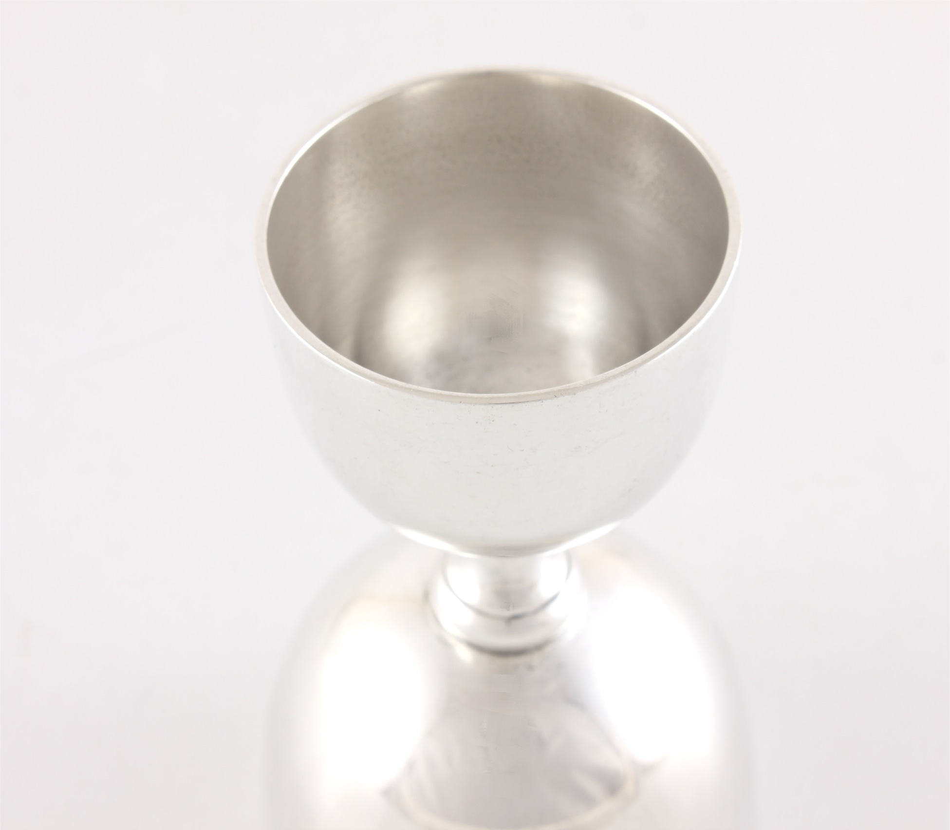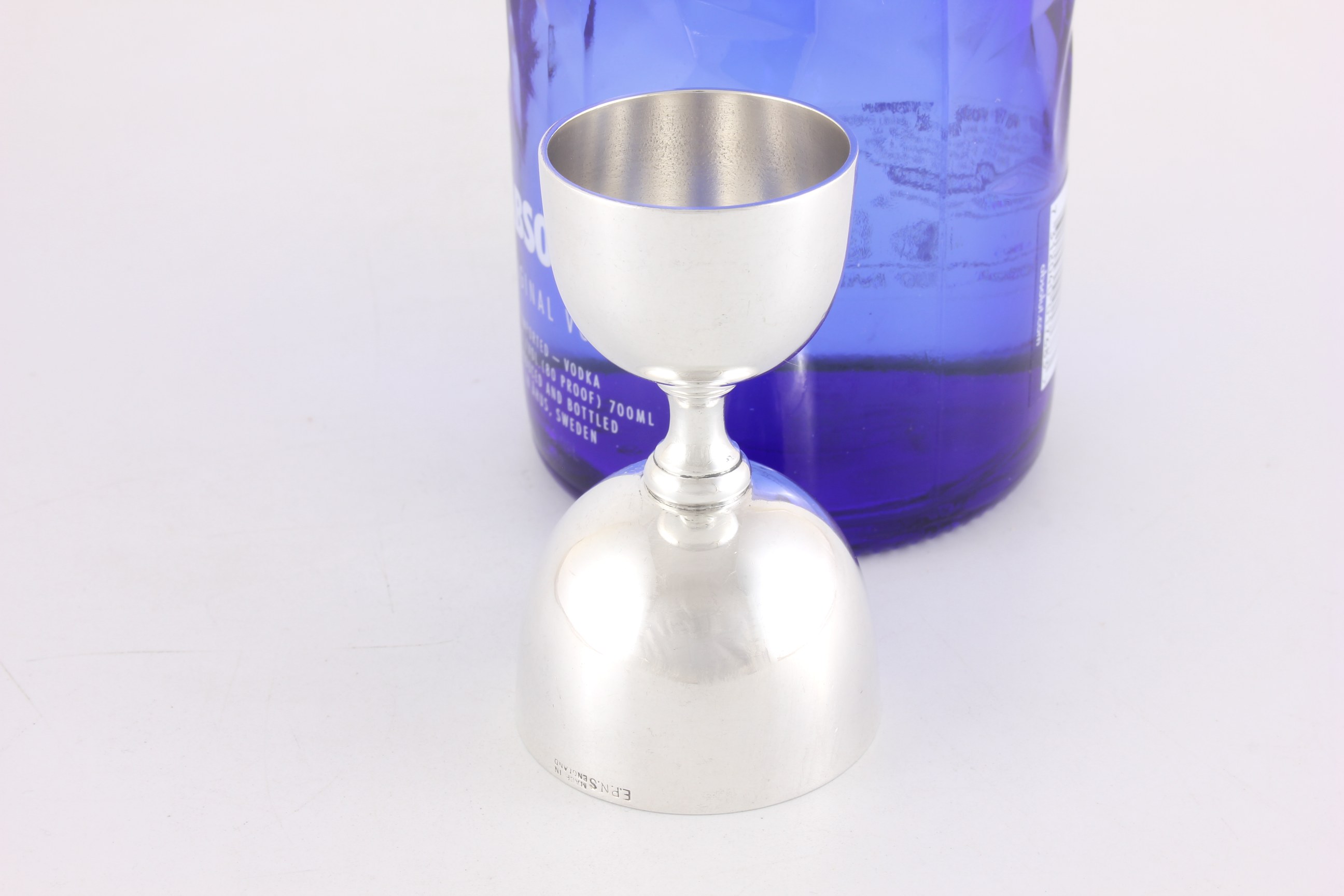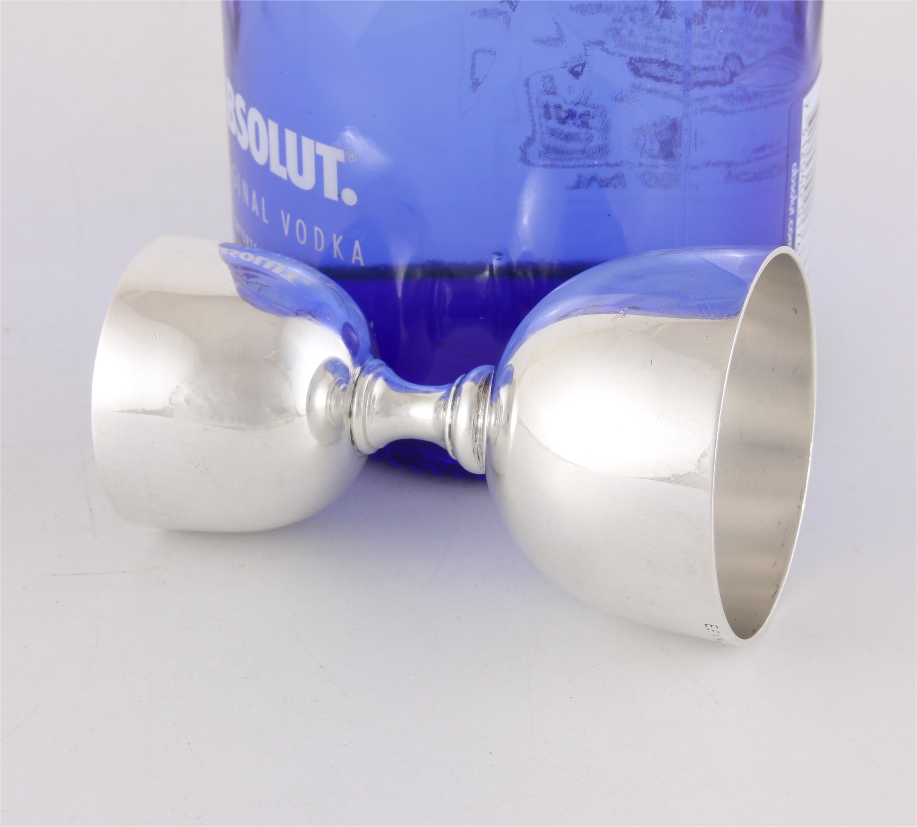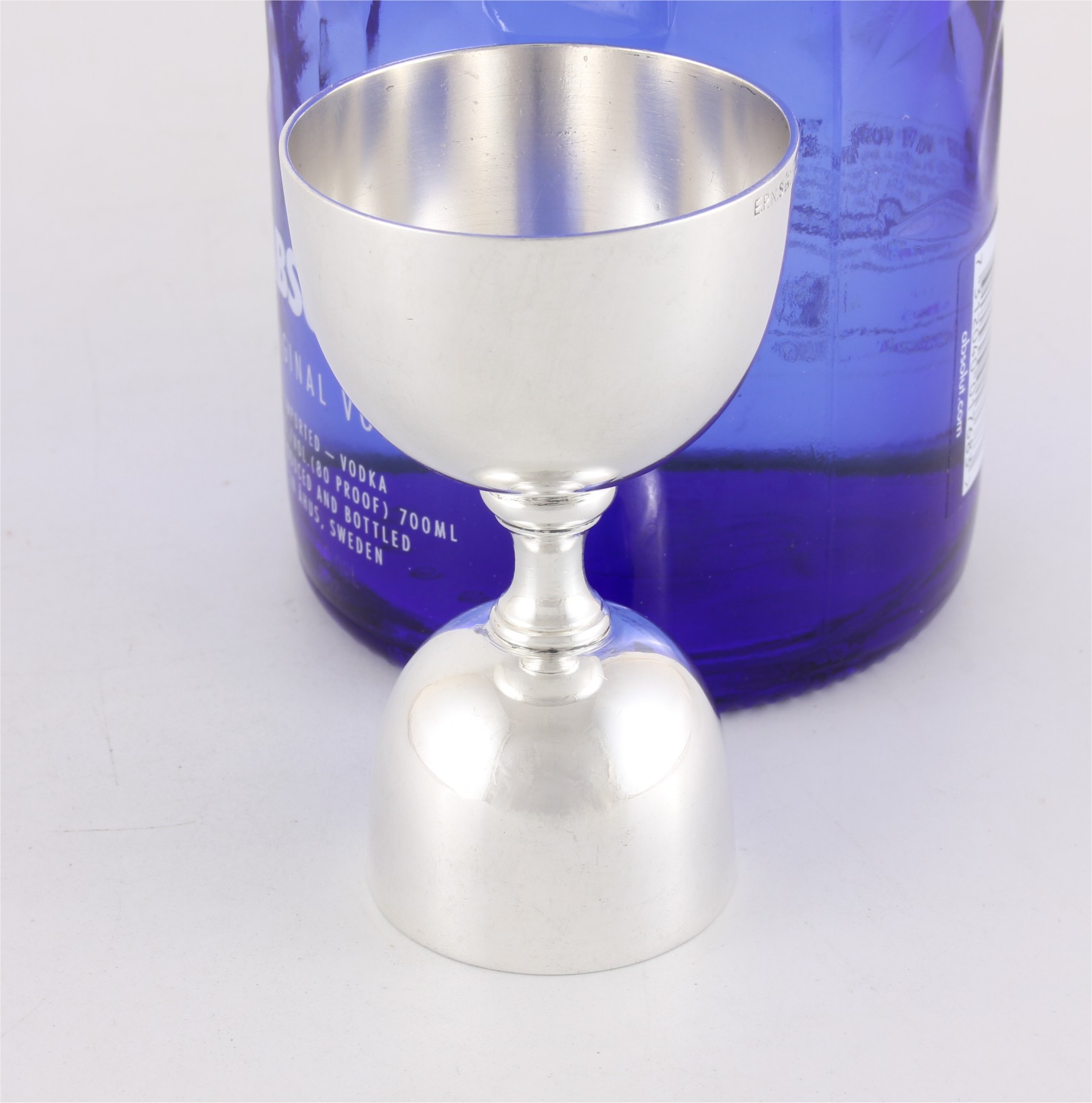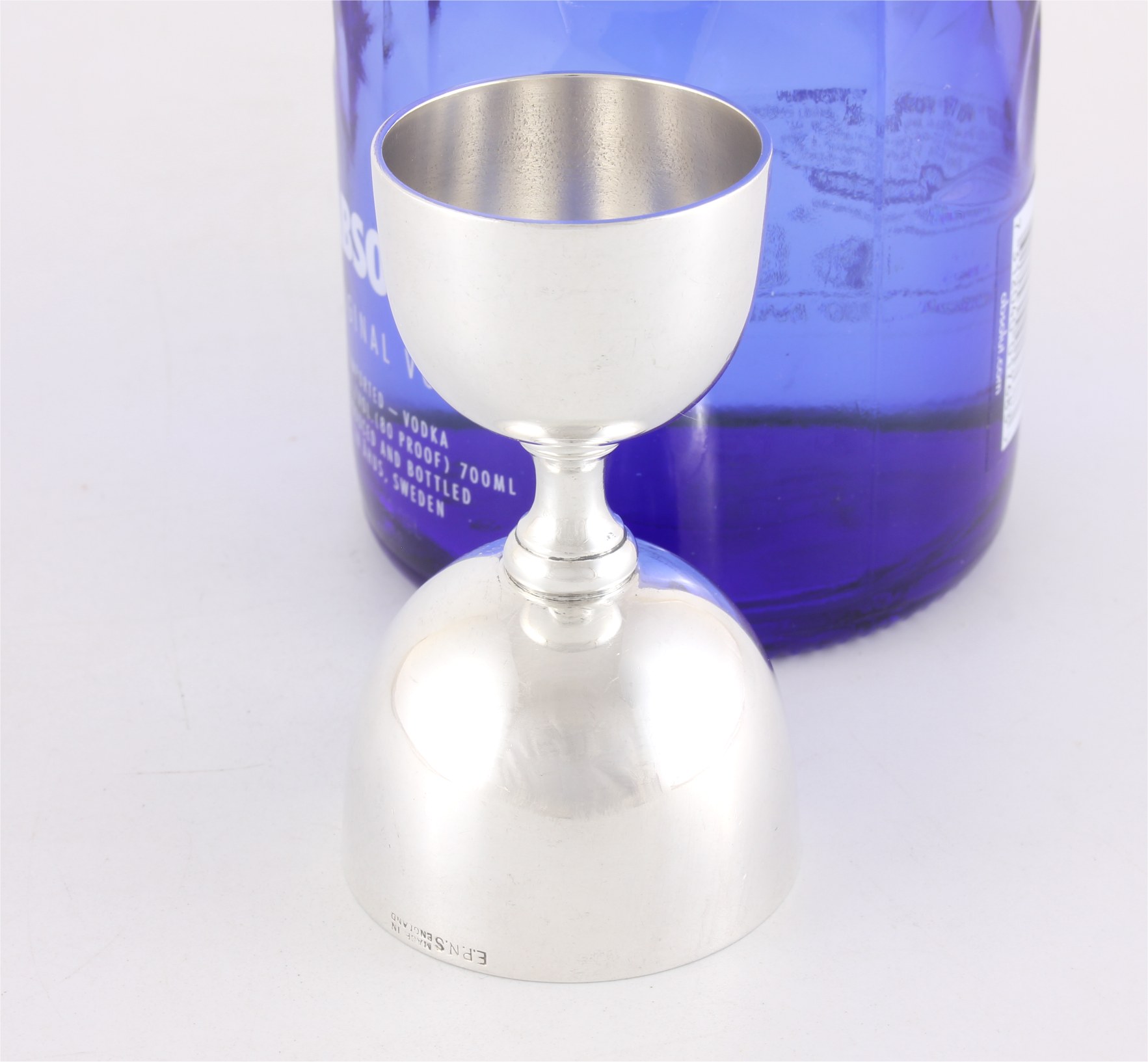 This double ended silver plated drinks spirit measure which dates from the mid 20th century is marked Made in England EPNS to the top of the larger measure.