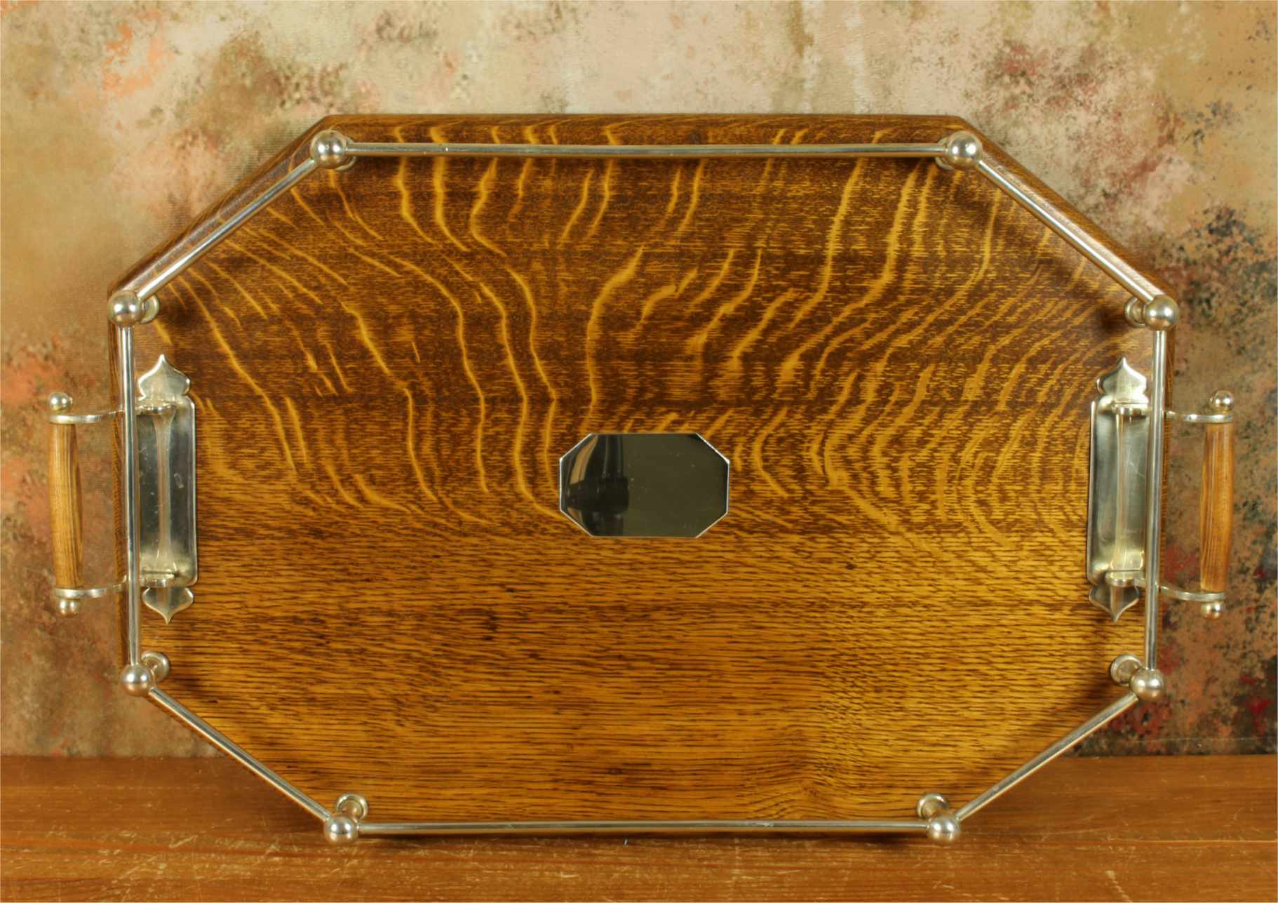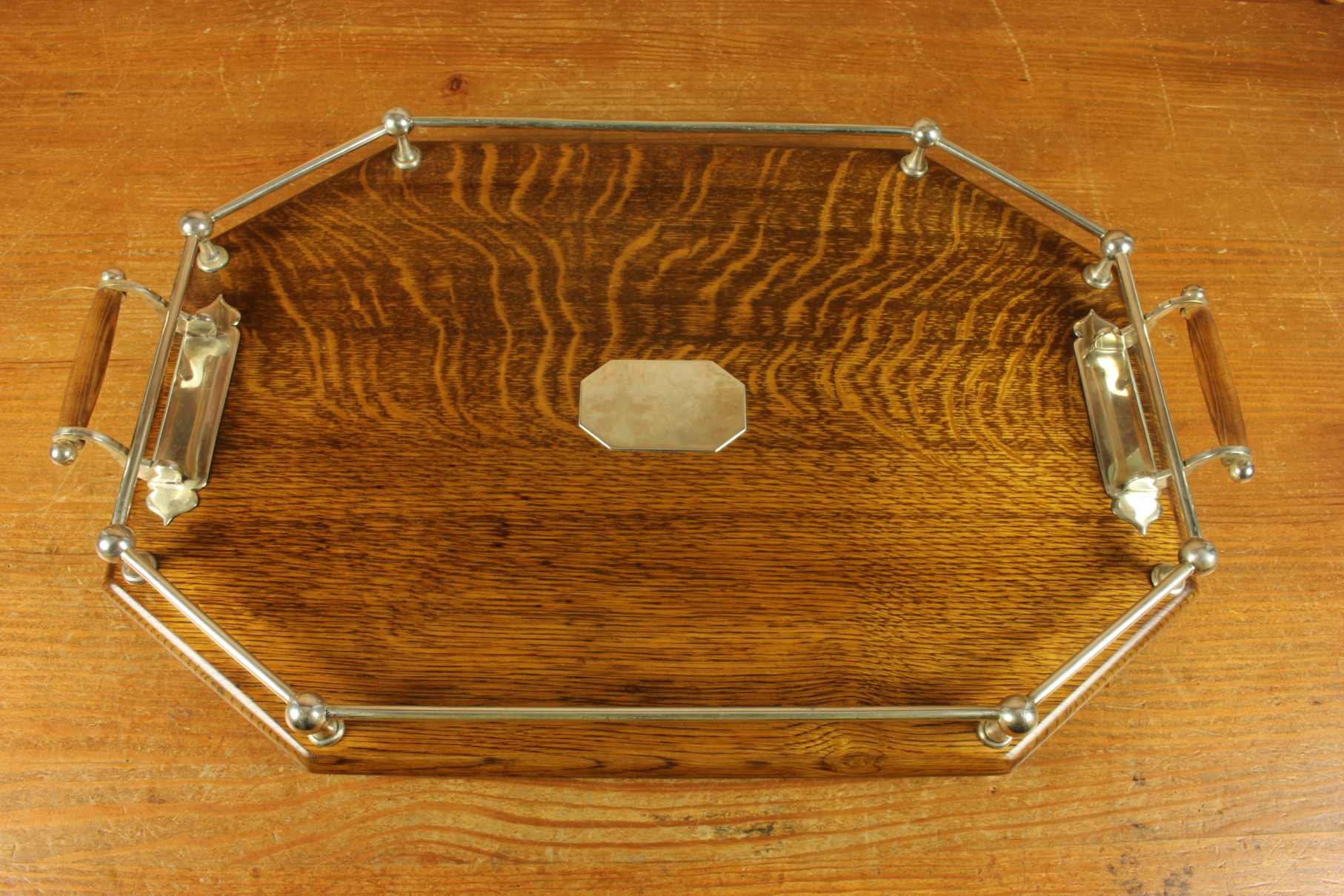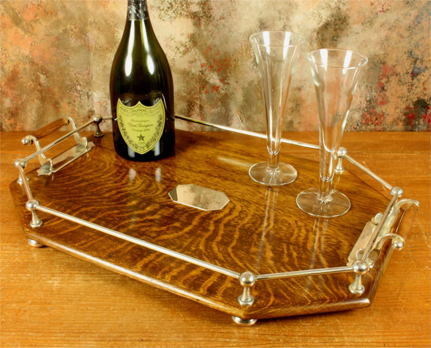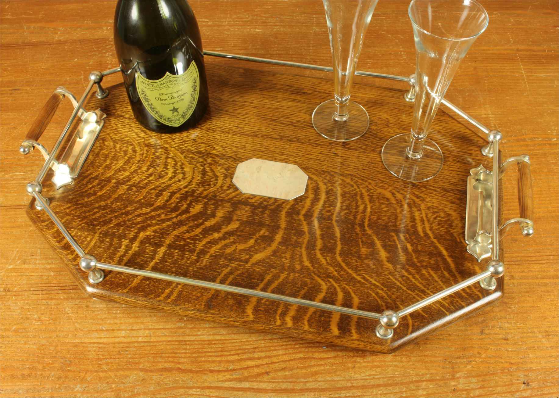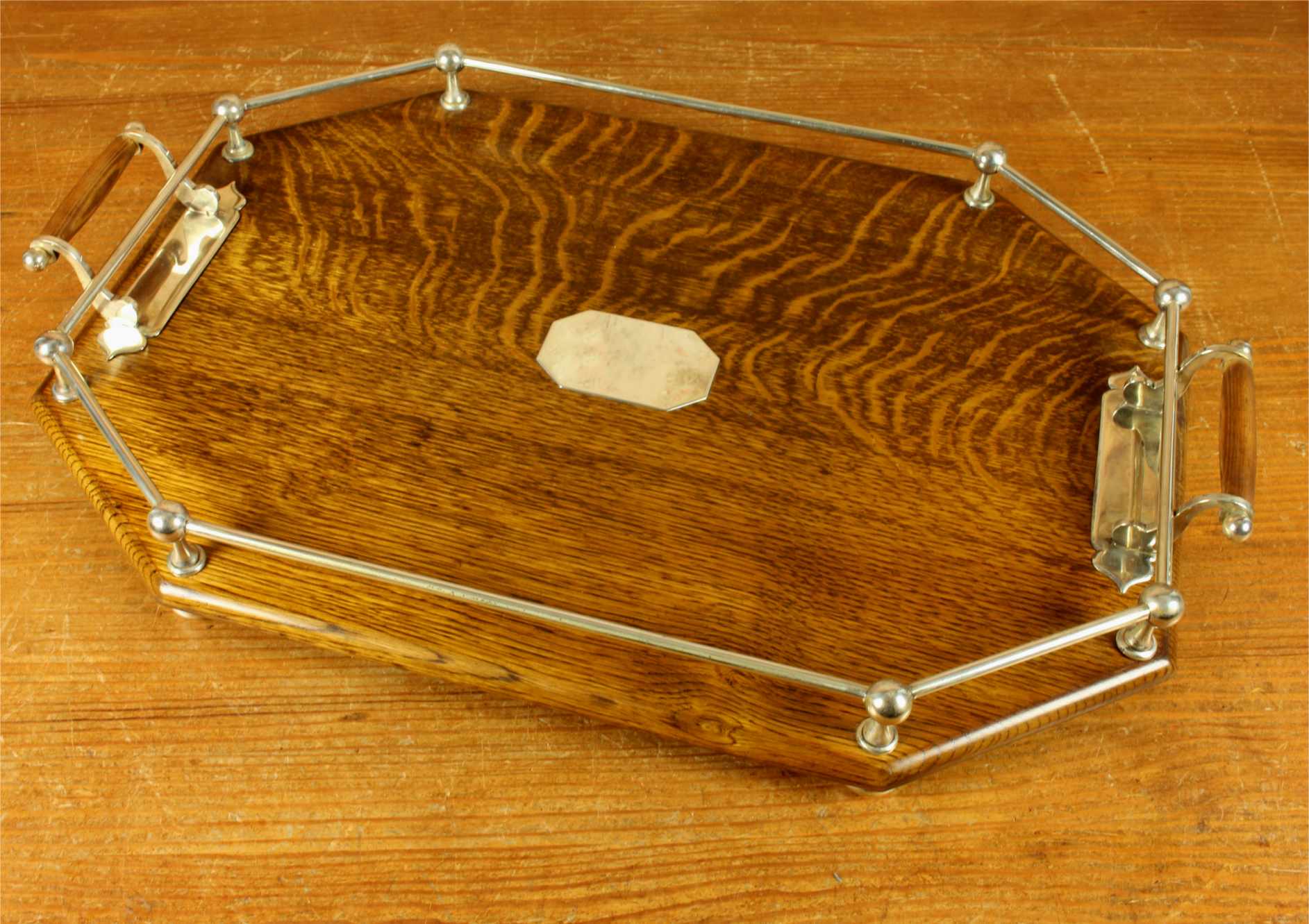 This stylish gallery tray which is made of English oak has a beautiful octagonal shape with a rounded edge, silver plated gallery rail and fittings, silver plate and wood handles, sits on four round bun feet and has a central octagonal silver plated blank cartouche.
