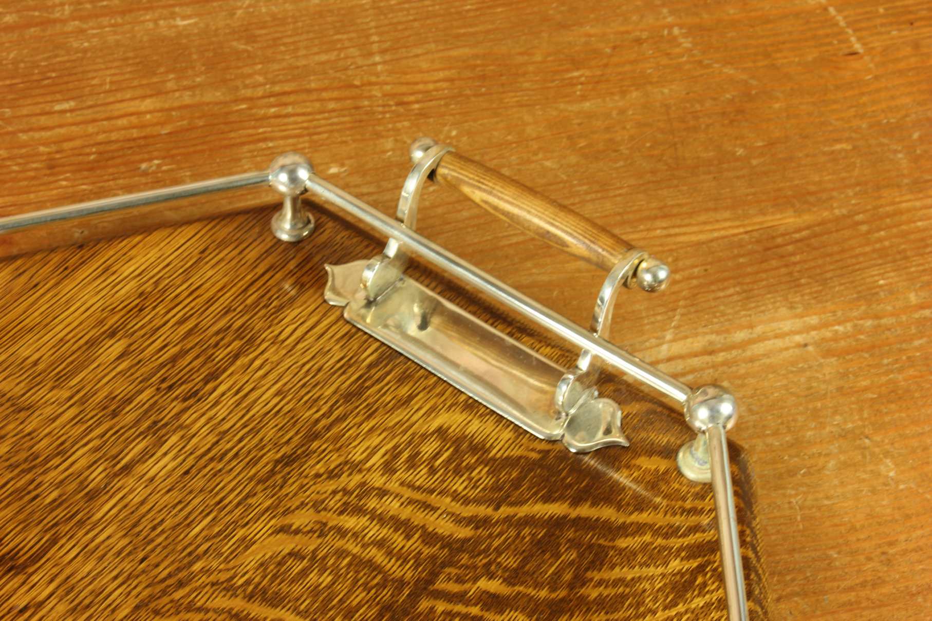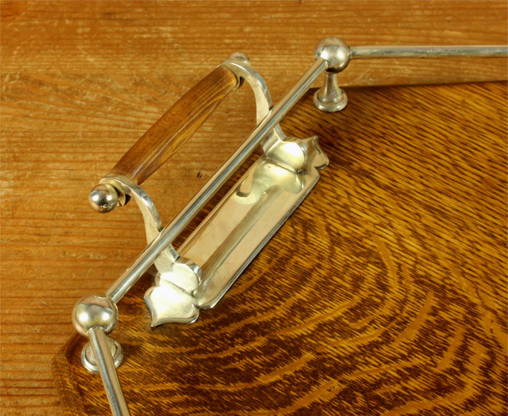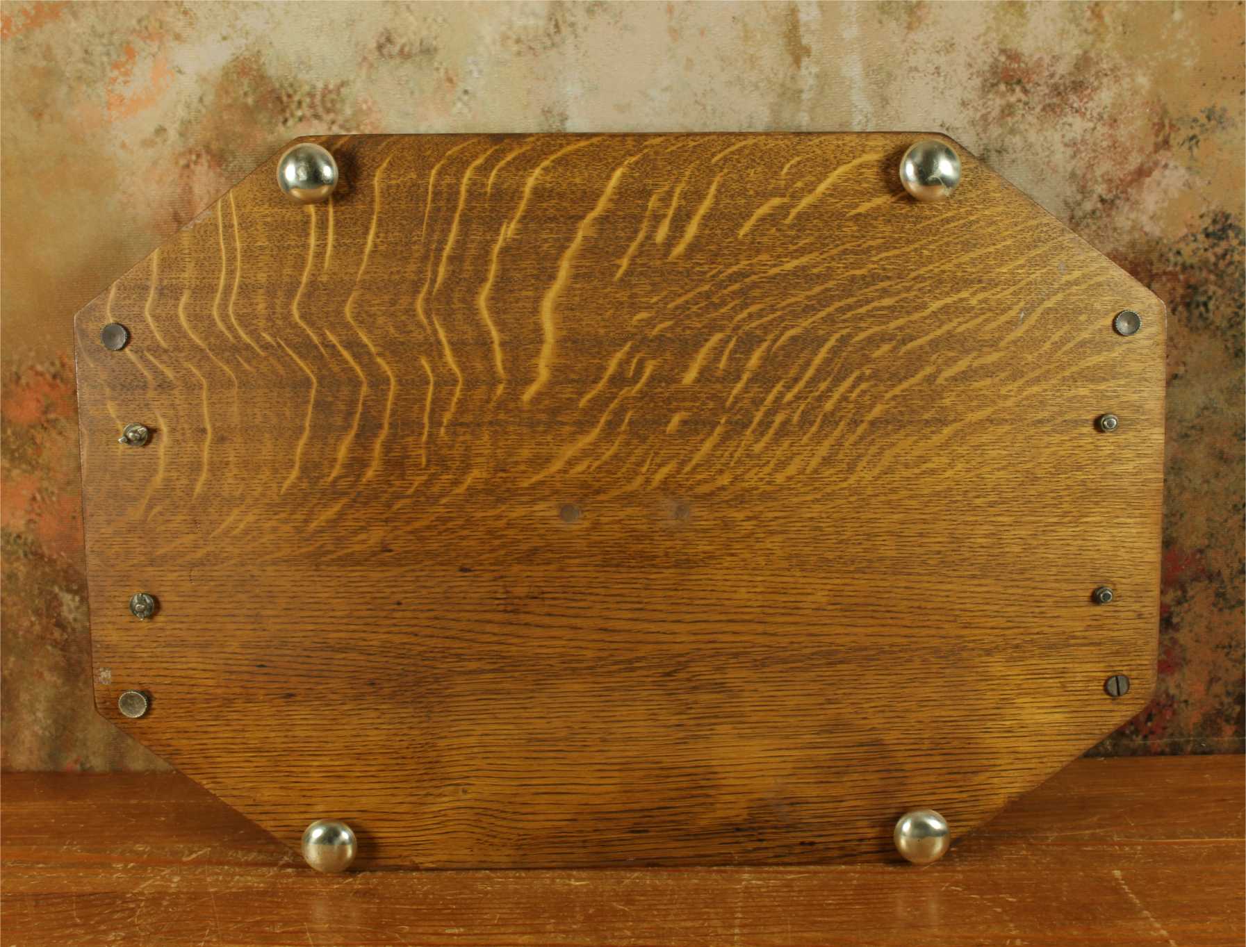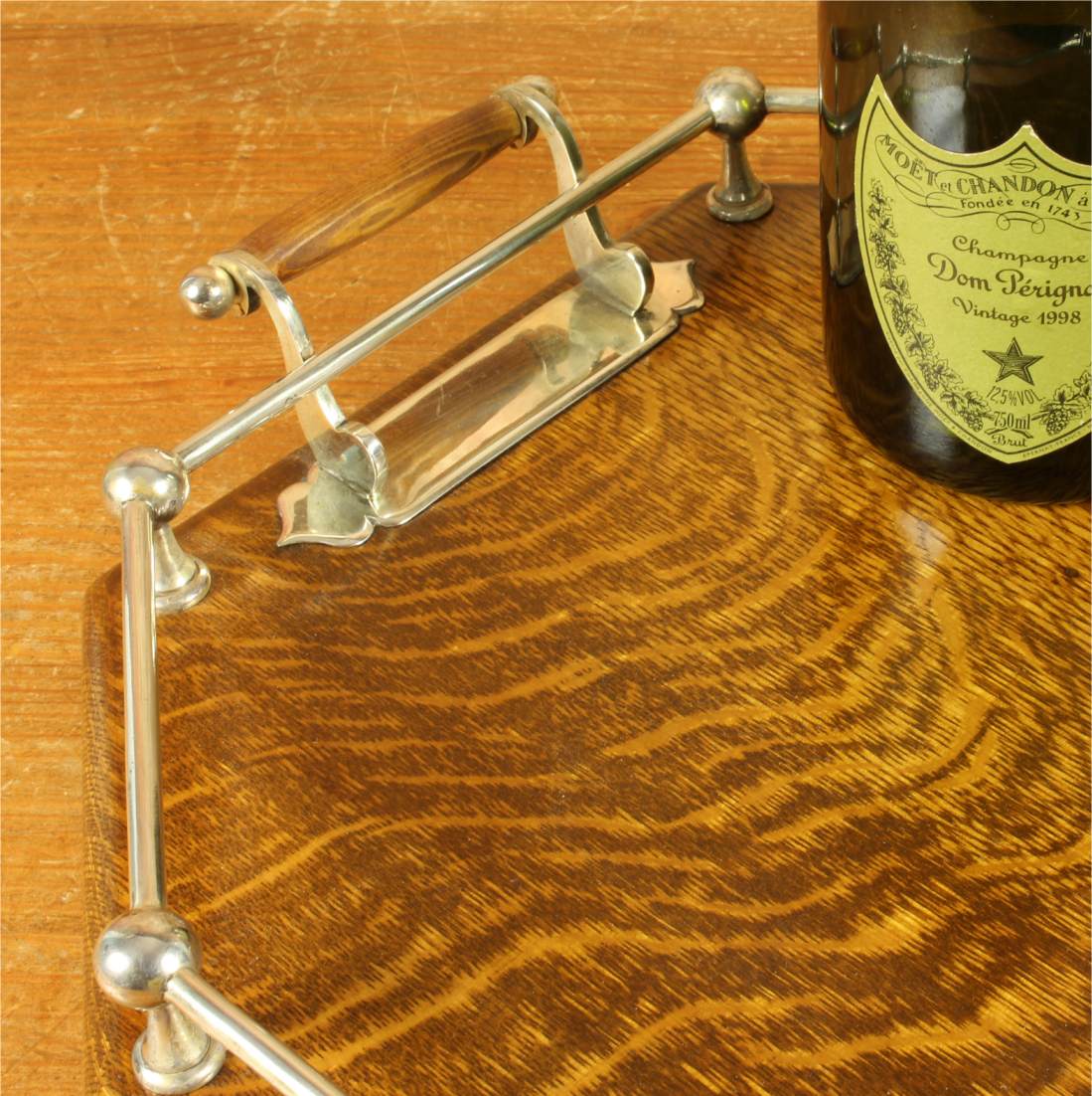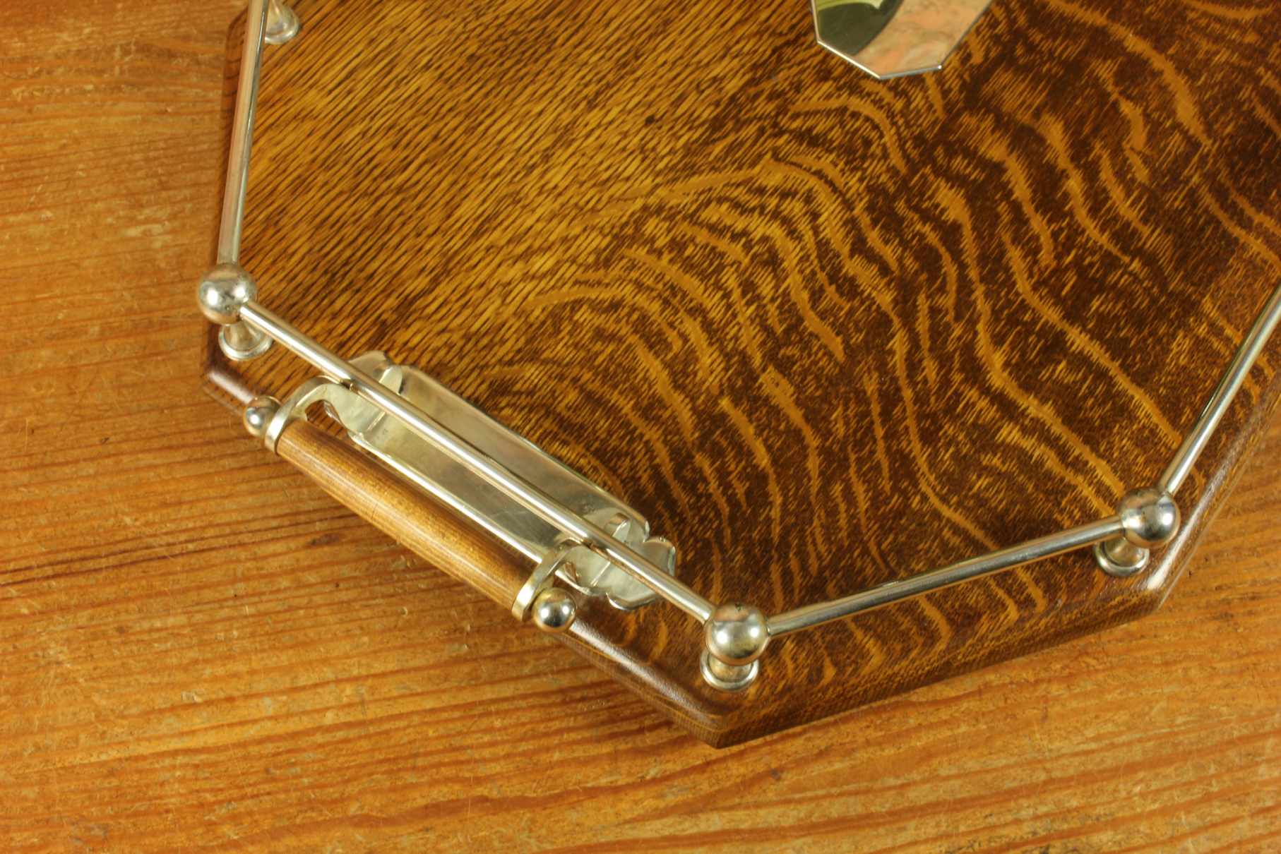 This stylish gallery tray which is made of English oak has a beautiful octagonal shape with a rounded edge, silver plated gallery rail and fittings, silver plate and wood handles, sits on four round bun feet and has a central octagonal silver plated blank cartouche.
