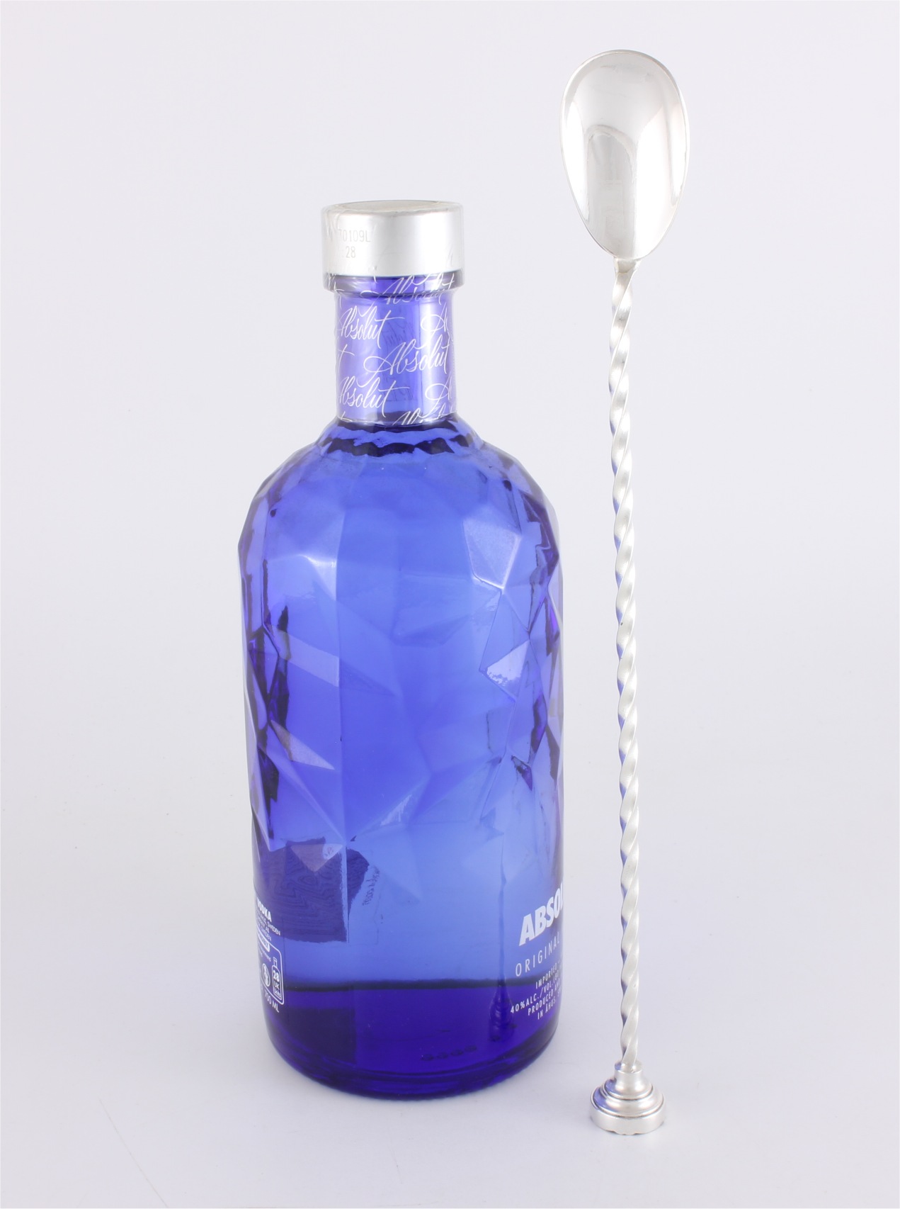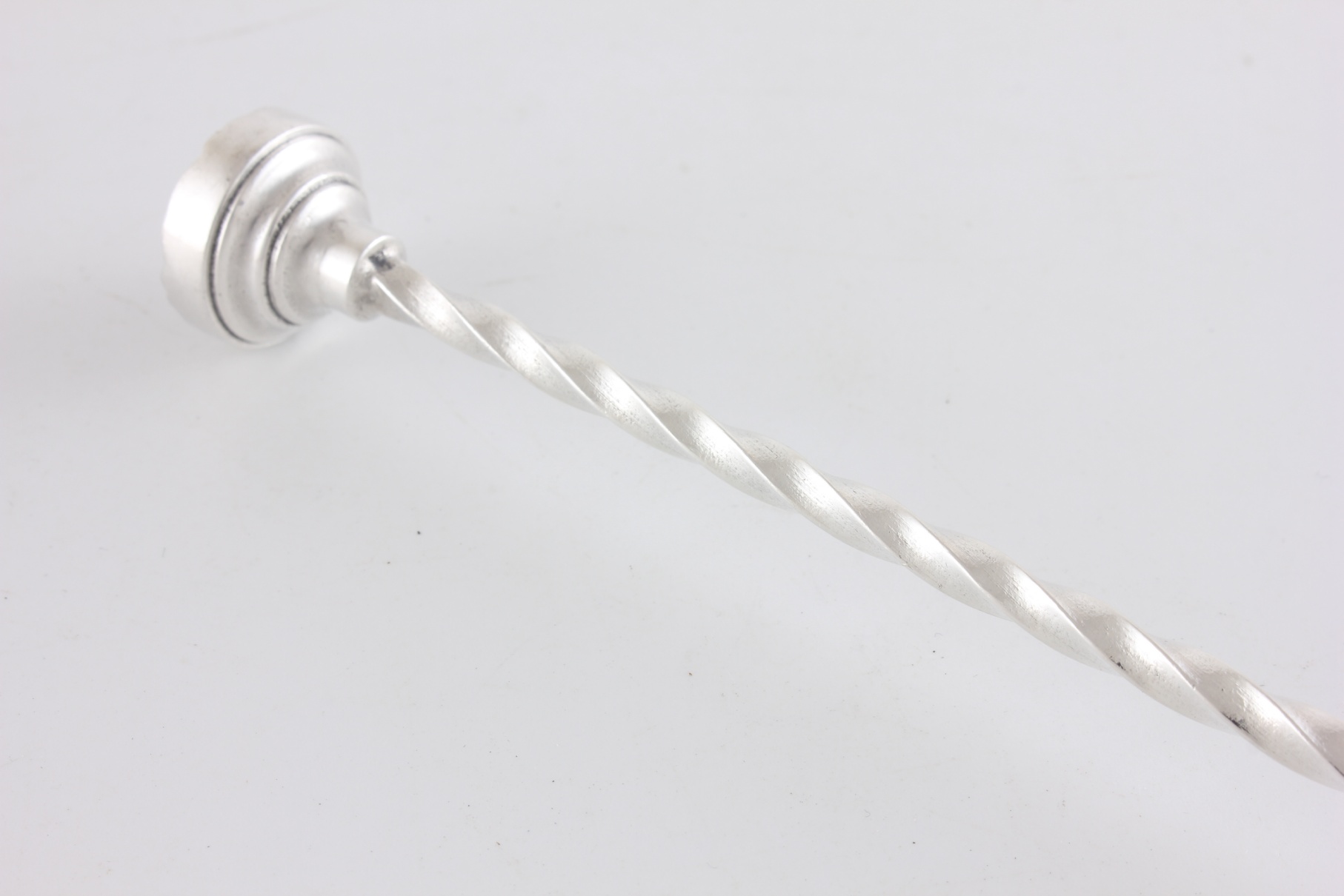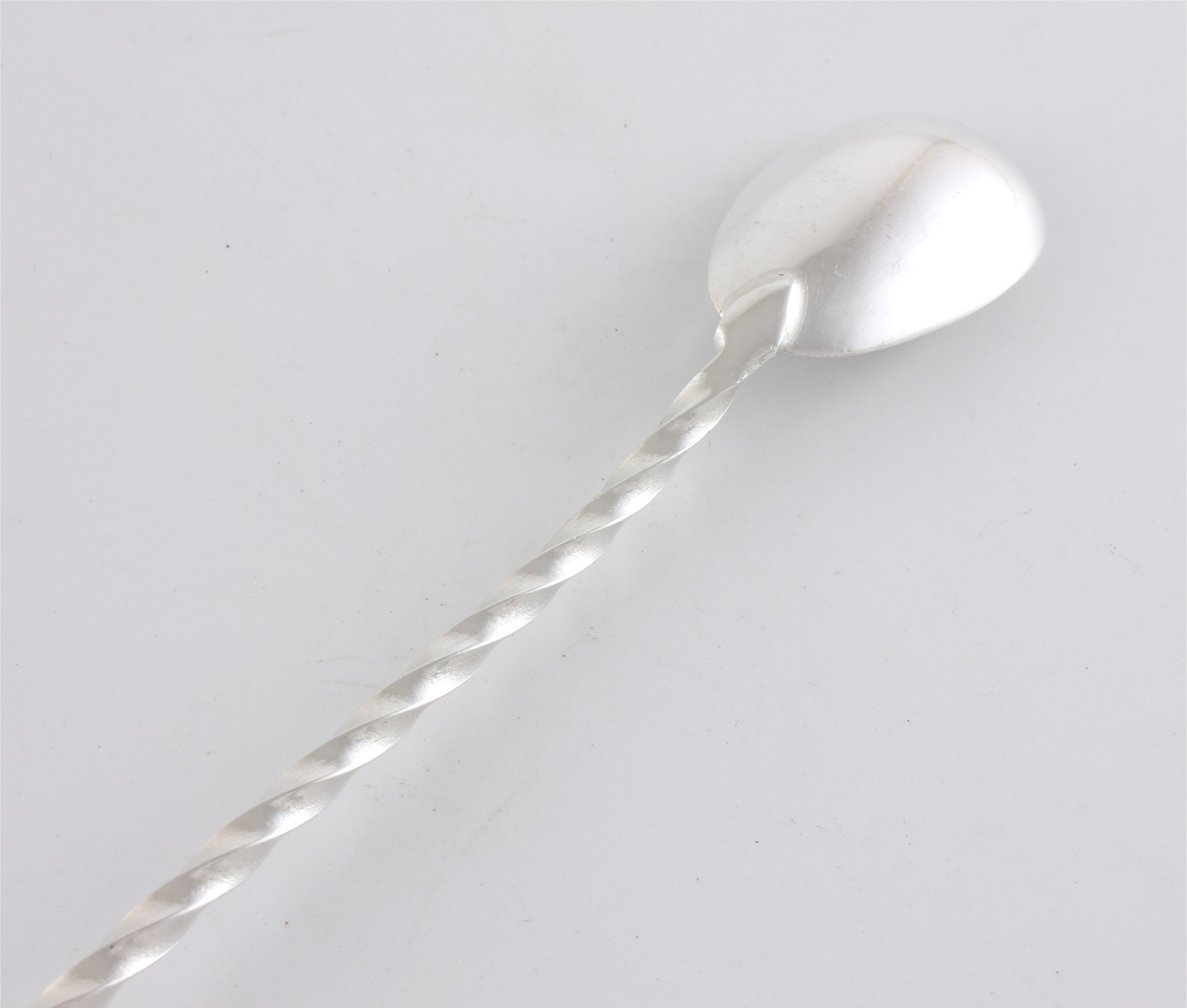 This stylish antique French silver plated long cocktail stirrer spoon which dates from the 1920's has a twisted design with a large spoon to one end and a round muddler which has a criss-cross pattern at the other end for crushing your cocktail ingredients.
