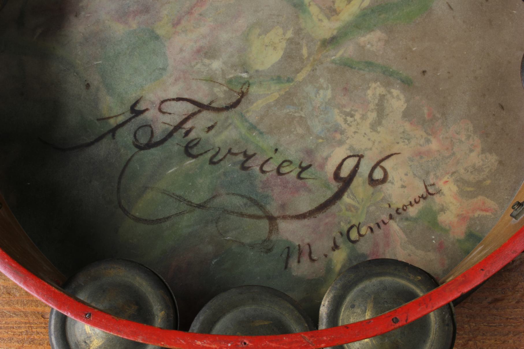 The rear of this 19th century tambourine is signed by the artist and dated 7 Fevrier 96 so for 7 February 1896.