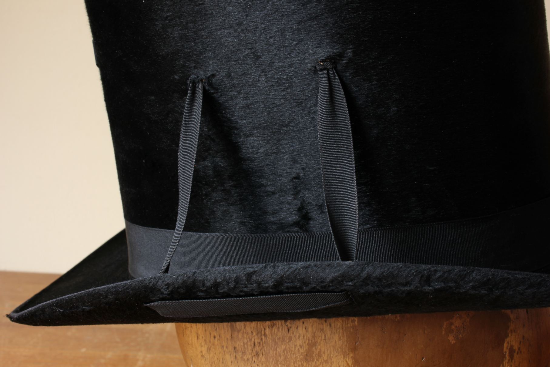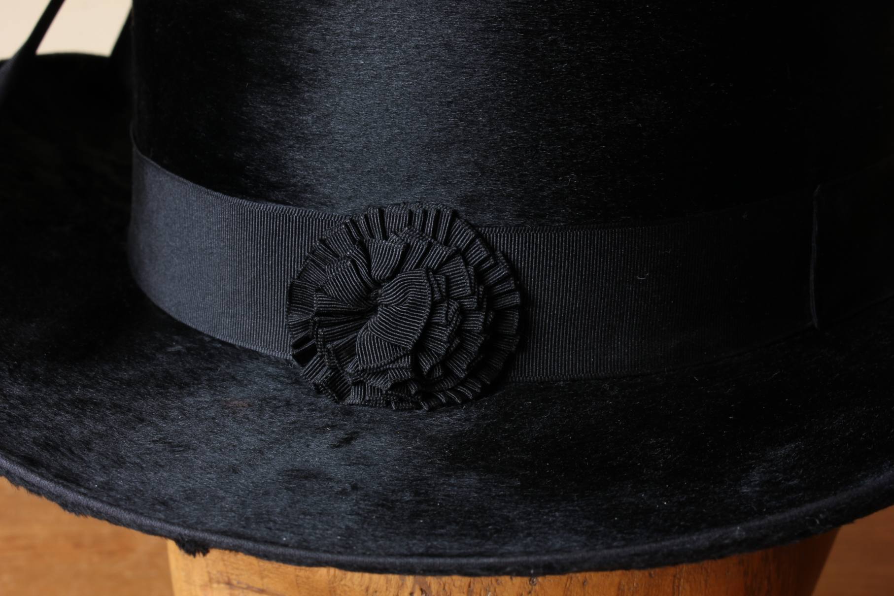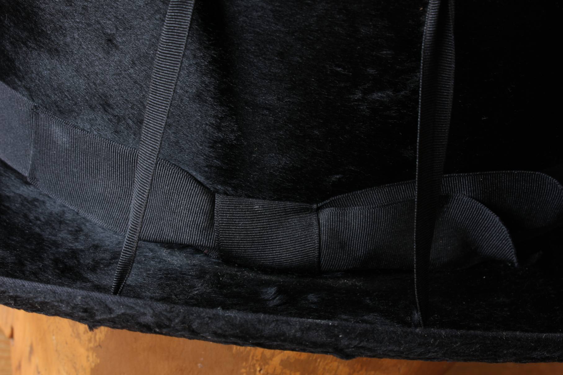 The hat which is made of black beaver plush has the usual ribbon band plus additional Bishop's black ribbons to the side, front and rosette decoration.