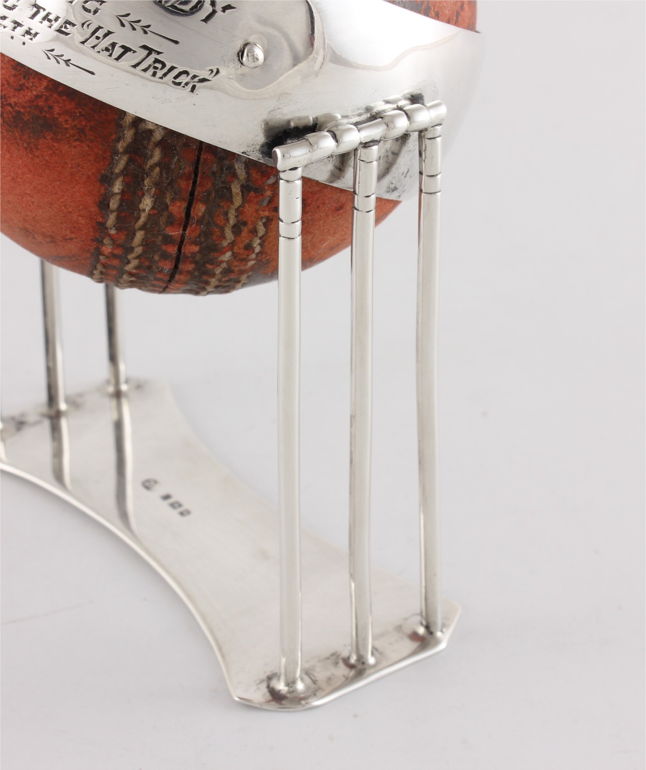This interesting antique cricket ball trophy which was made using the original cricket ball from the match played in 1922 sits in it's fitted silver hallmarked stand which has cricket stumps as the base and a silver hallmarked band around the centre that reads: