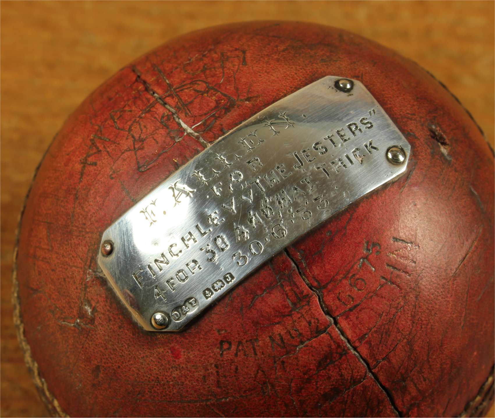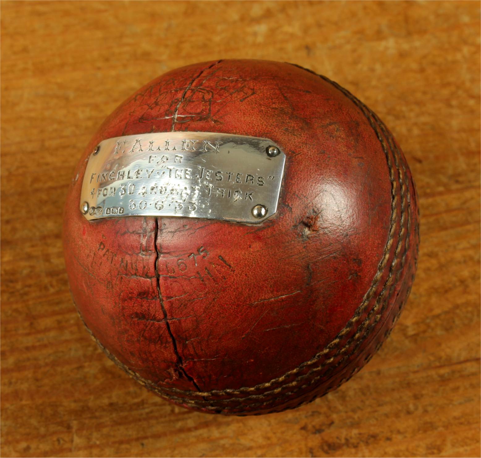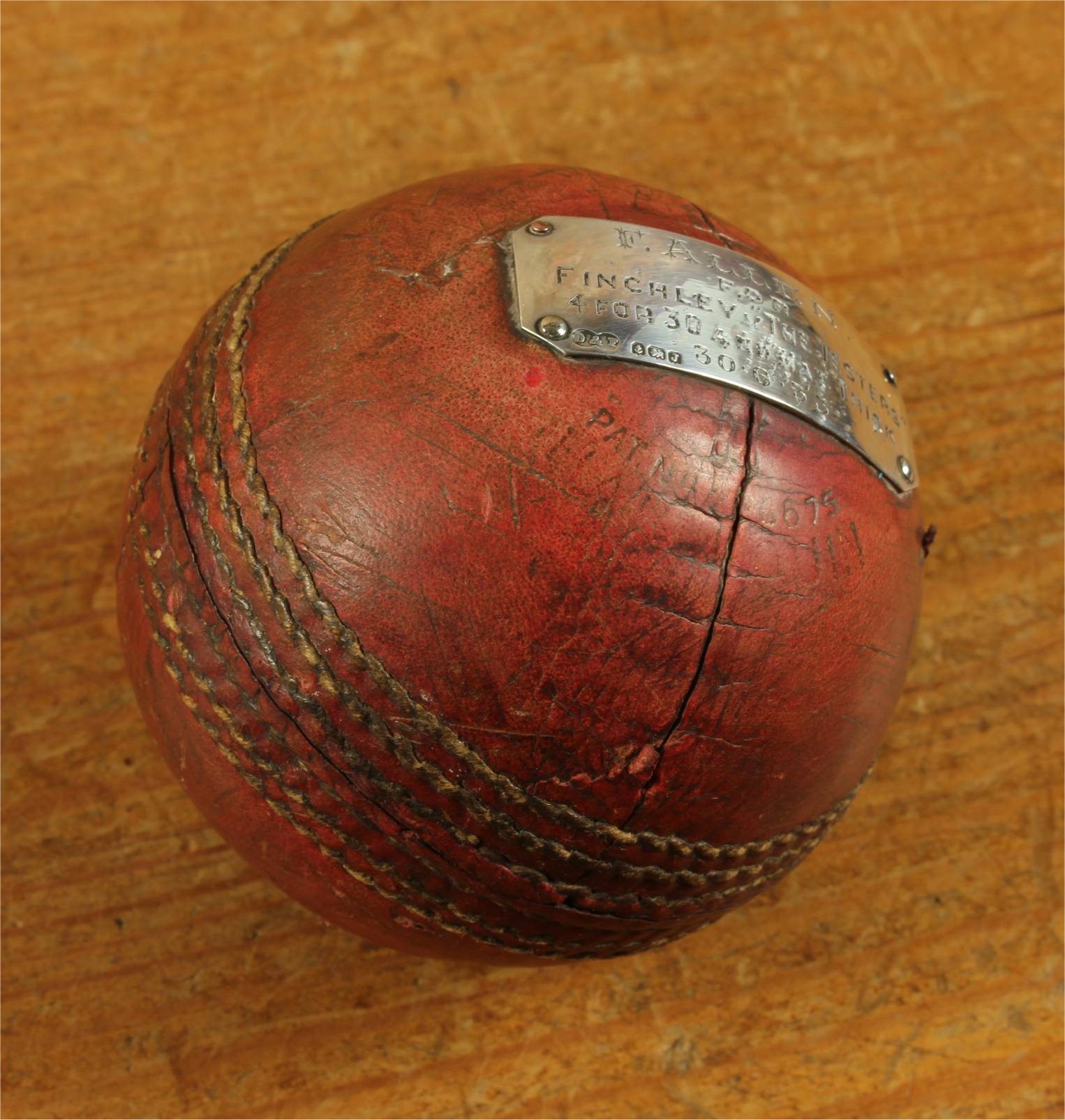 Material: Cricket Ball. Sterling silver plaque.