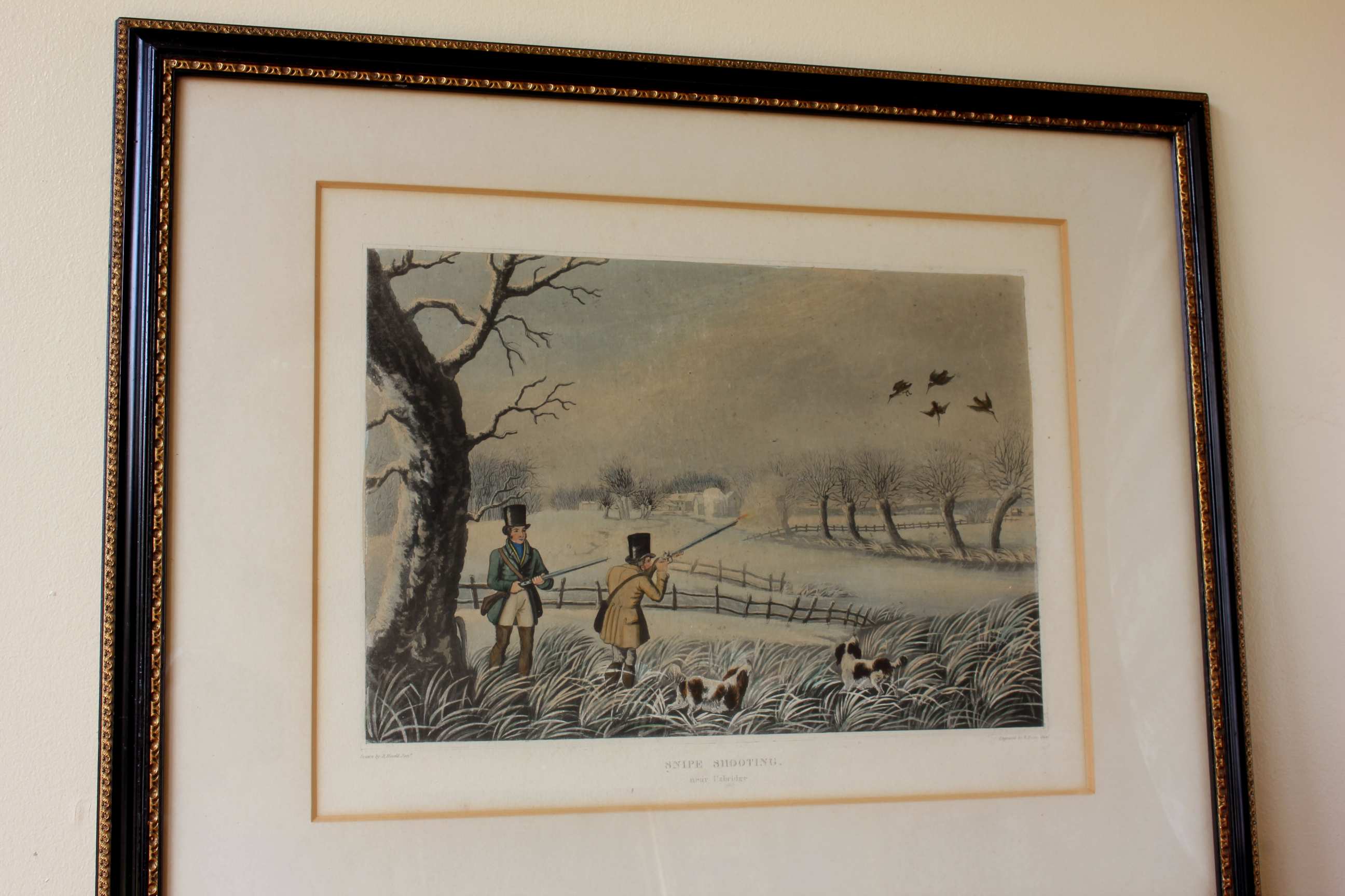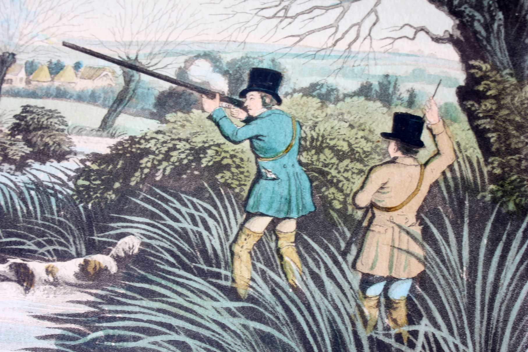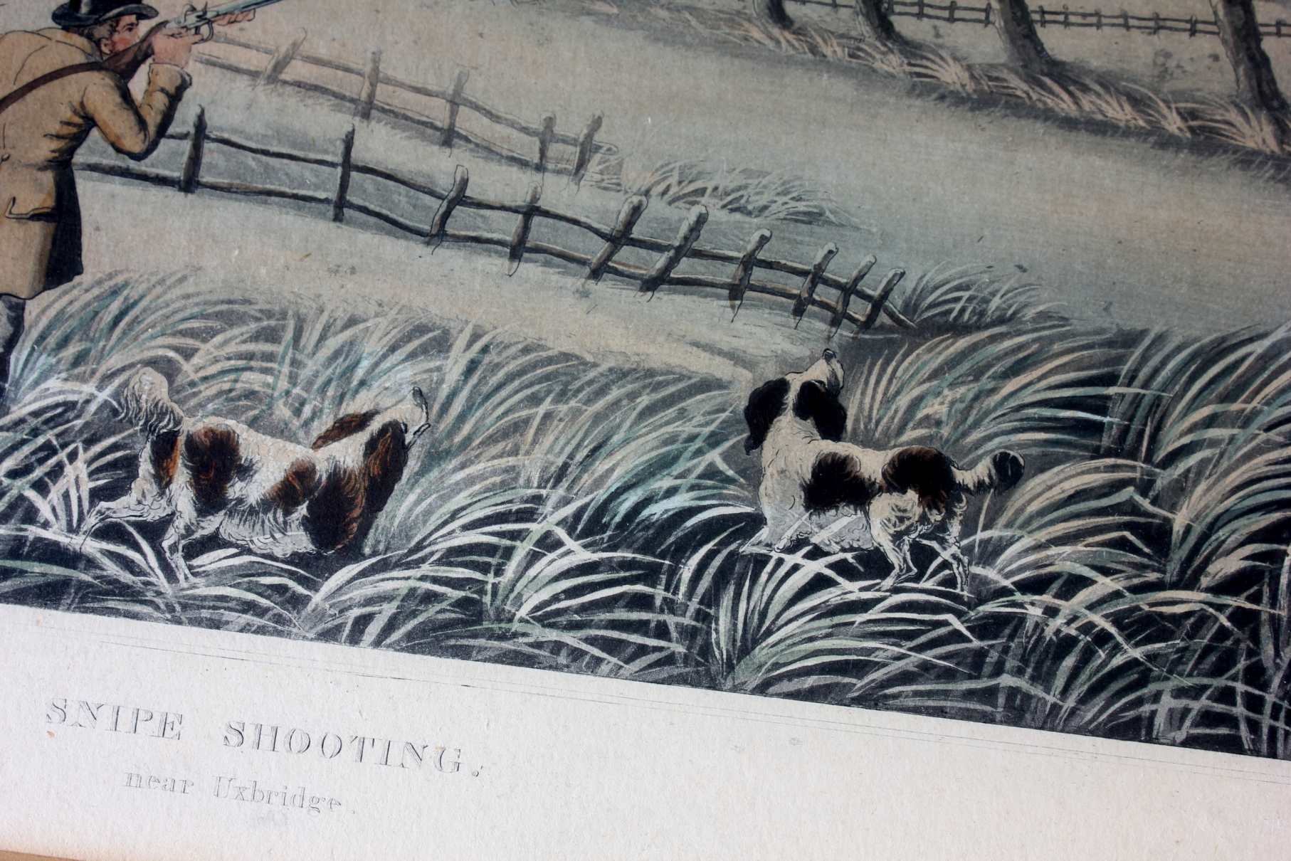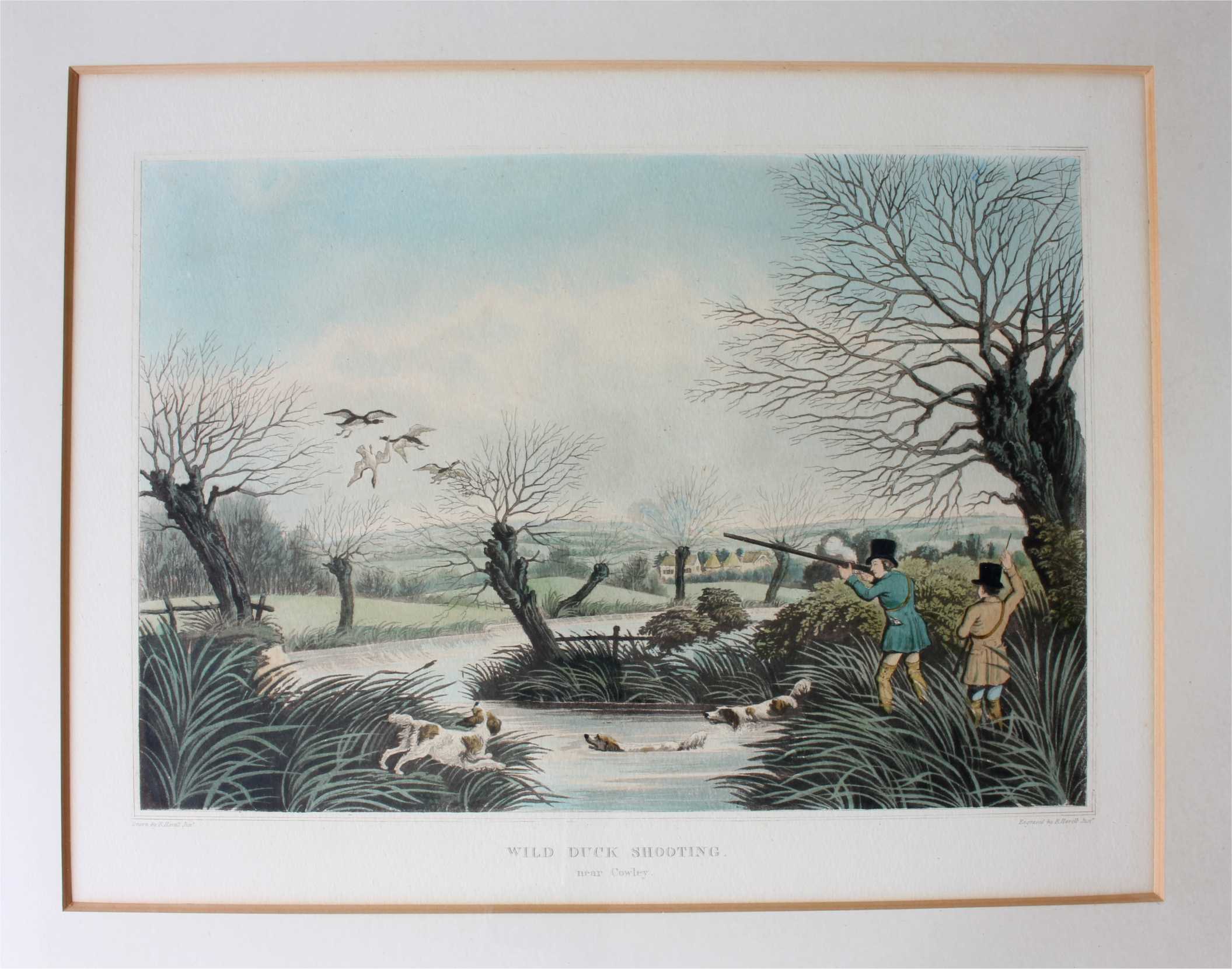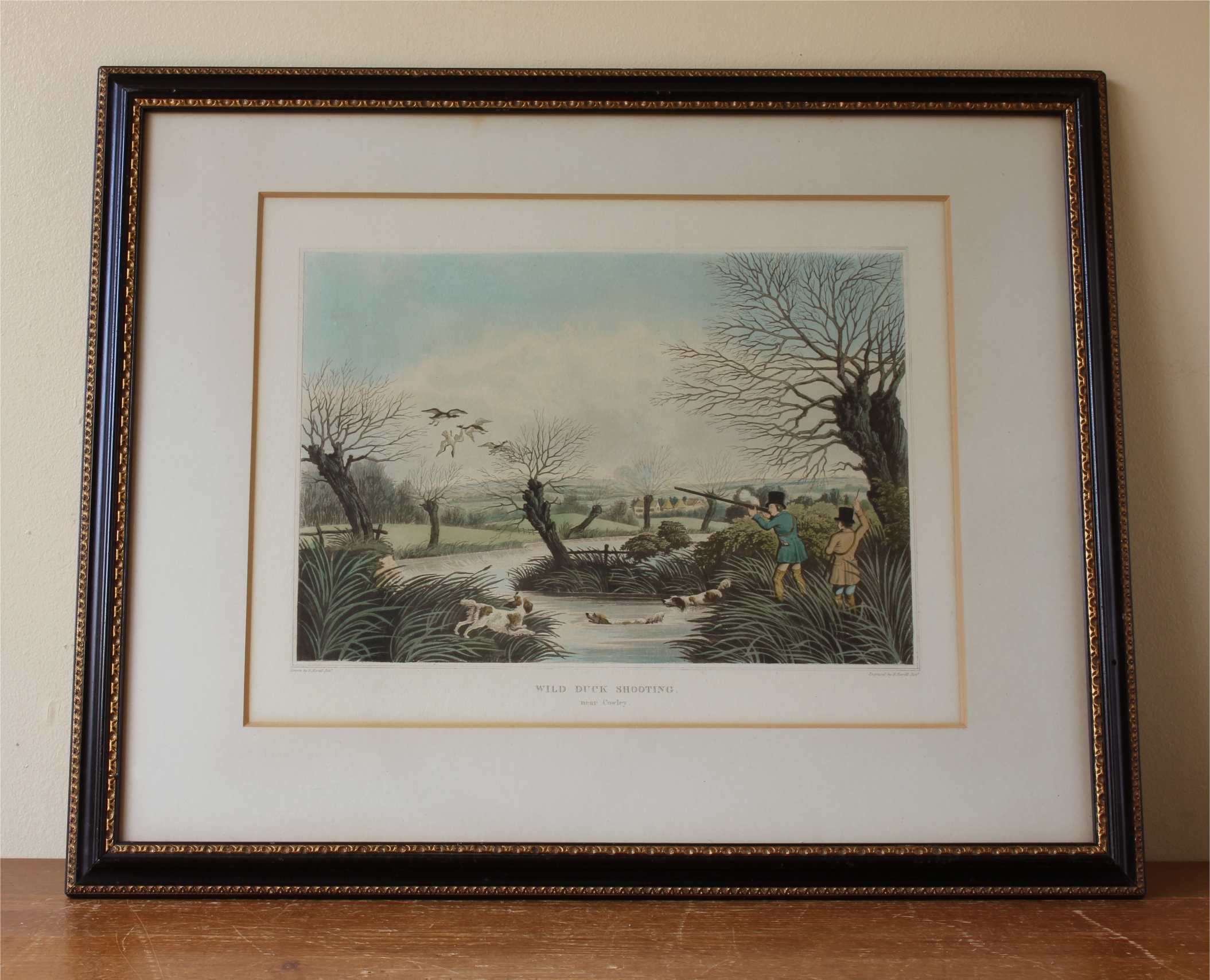These two fine antique engraved aquatints which have original hand colouring are drawn and engraved by R Havell and are titled Snipe Shooting Near Uxbridge and Wild Duck Shooting Near Cowley.