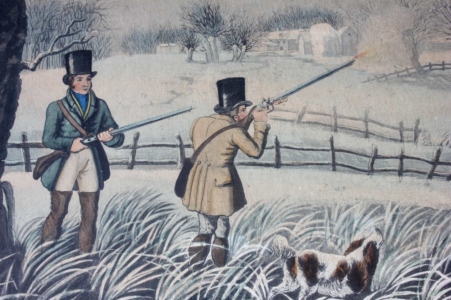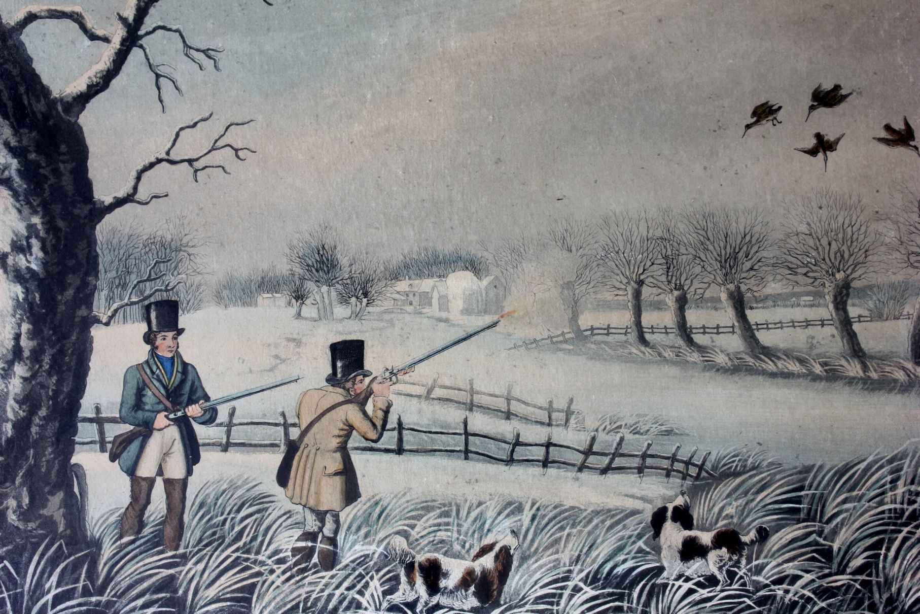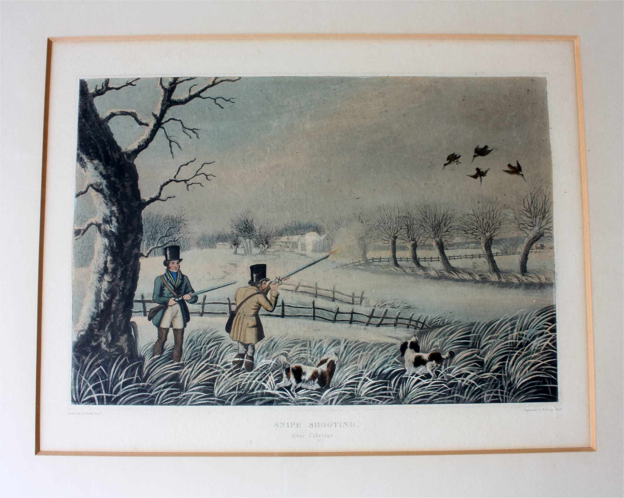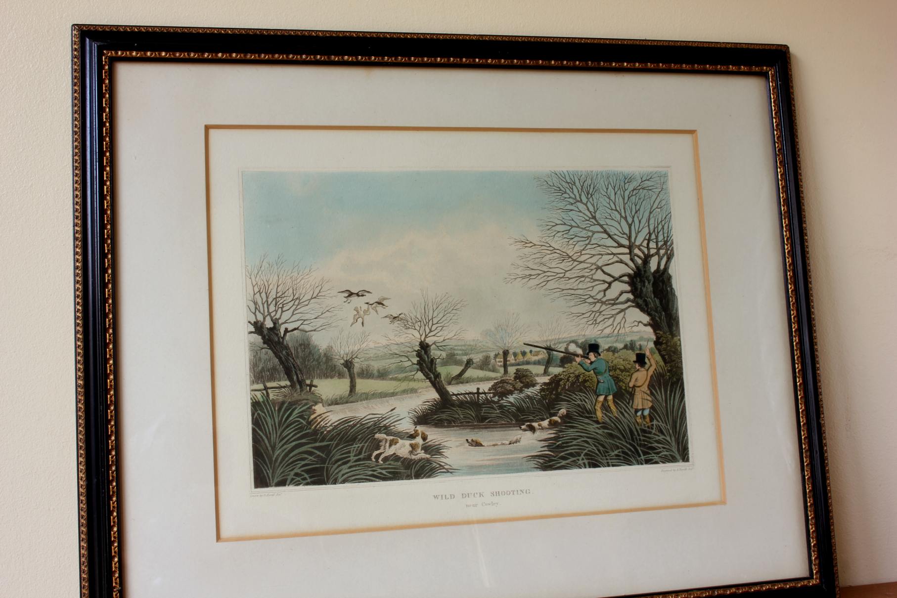 These two fine antique engraved aquatints which have original hand colouring are drawn and engraved by R Havell and are titled Snipe Shooting Near Uxbridge and Wild Duck Shooting Near Cowley.